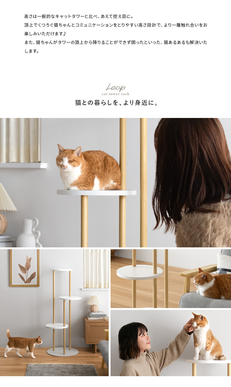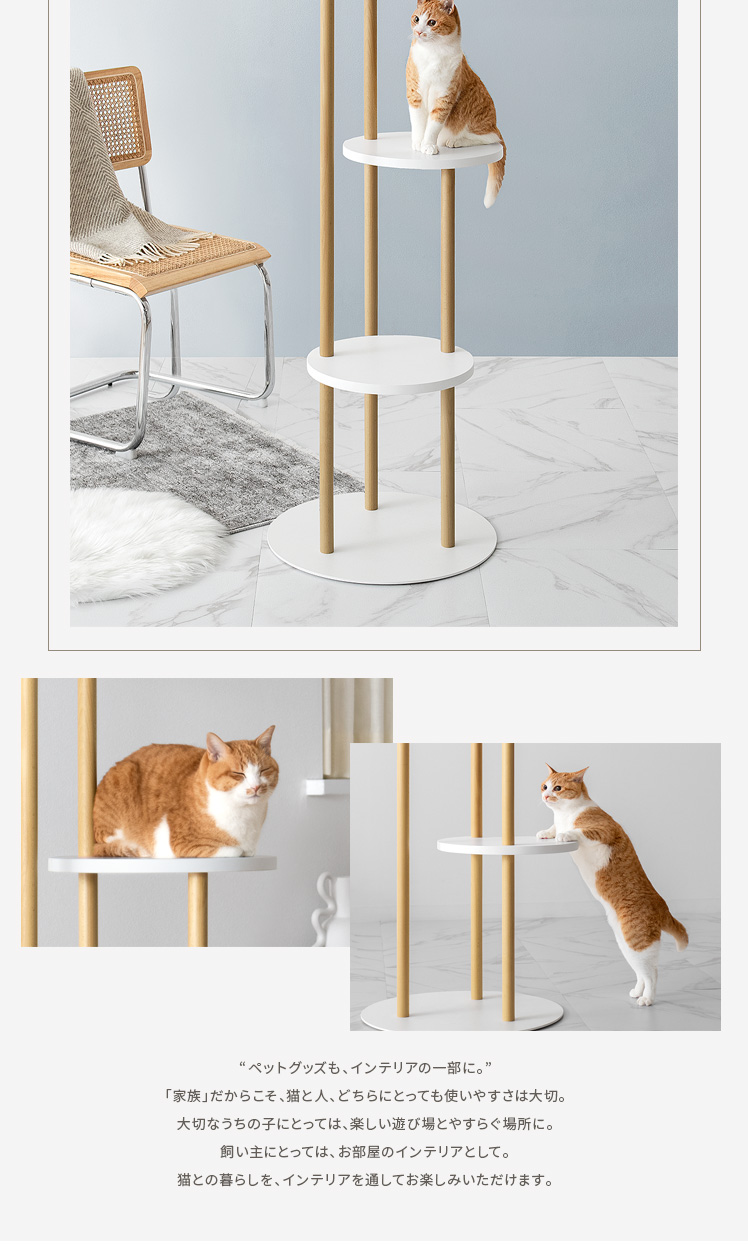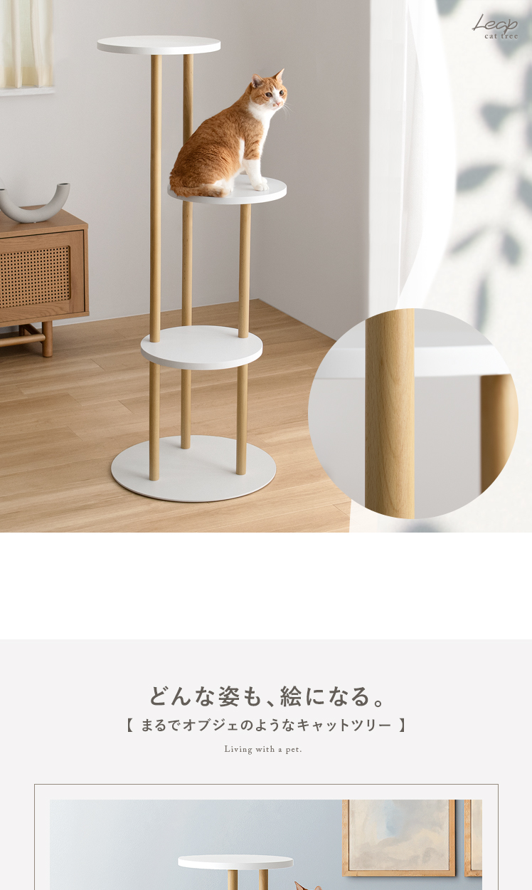 キャットツリー Leap〔リープ〕/“ペットグッズも、インテリアの一部に。”「家族」だからこそ、猫と人、どちらにとっても使いやすさは大切。大切なうちの子とっては、楽しい遊び場とやすらぐ場所に。飼い主にとっては、お部屋のインテリアとして。猫との暮らしを、インテリアを通してお楽しみいただけます。