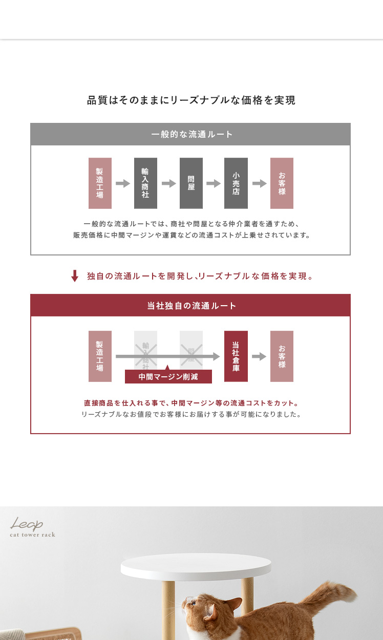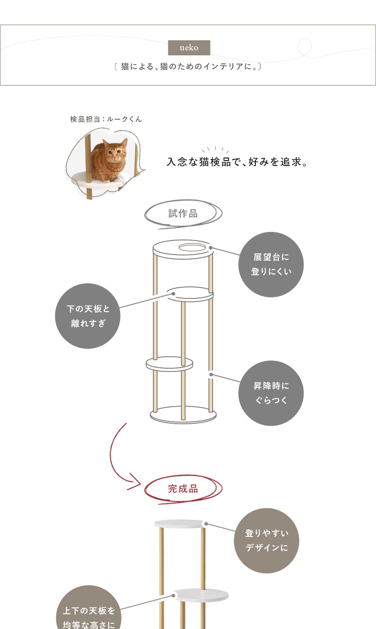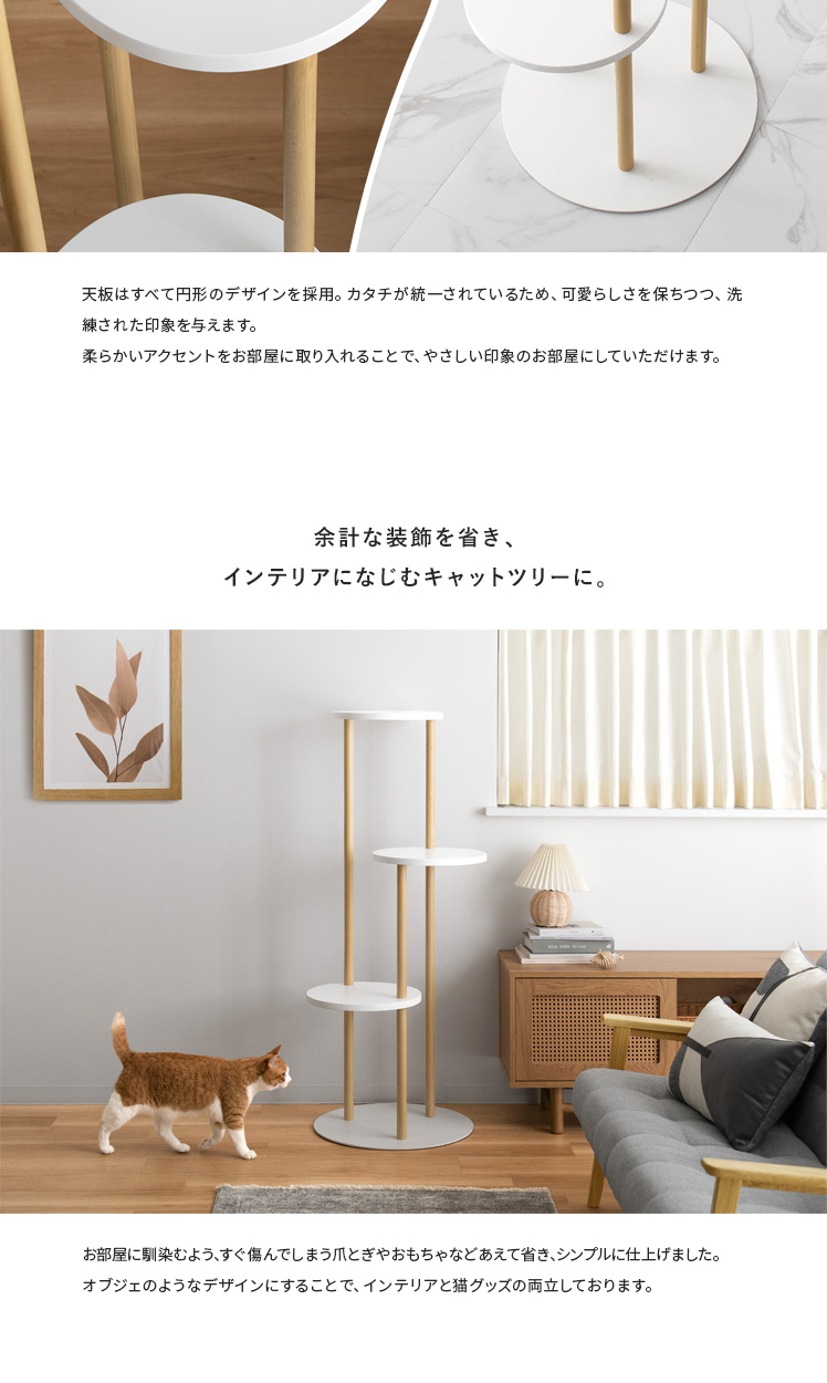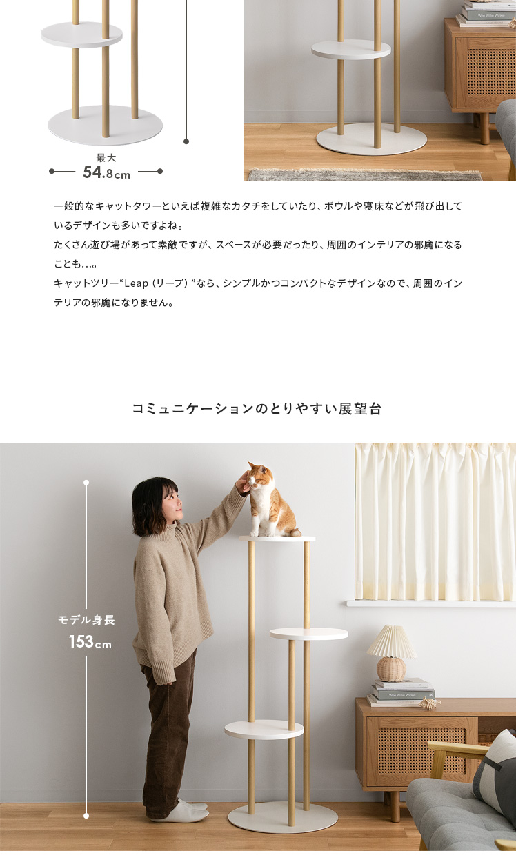 キャットツリー Leap〔リープ〕/“ペットグッズも、インテリアの一部に。”「家族」だからこそ、猫と人、どちらにとっても使いやすさは大切。大切なうちの子とっては、楽しい遊び場とやすらぐ場所に。飼い主にとっては、お部屋のインテリアとして。猫との暮らしを、インテリアを通してお楽しみいただけます。