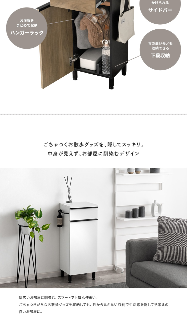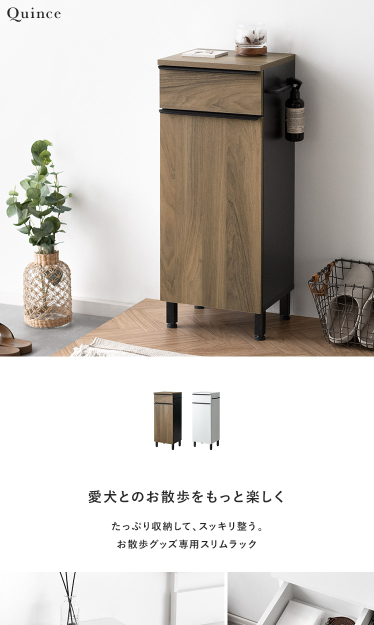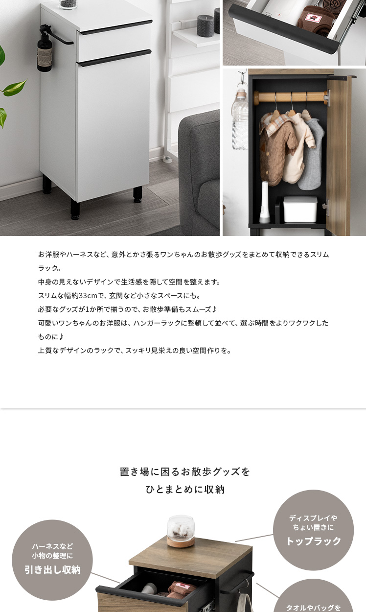 愛犬専用ラック Quince〔クィンス〕/お洋服やハーネスなど、意外とかさ張るワンちゃんのお散歩グッズをまとめて収納できるスリムラック。中身の見えないデザインで生活感を隠して空間を整えます。スリムな幅約33cmで、玄関など小さなスペースにも。必要なグッズが1か所で揃うので、お散歩準備もスムーズ♪可愛いワンちゃんのお洋服は、ハンガーラックに整頓して並べて、選ぶ時間をよりワクワクしたものに♪上質なデザインのラックで、スッキリ見栄えの良い空間作りを。