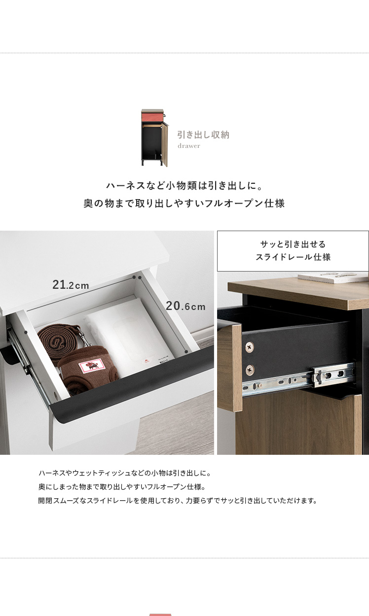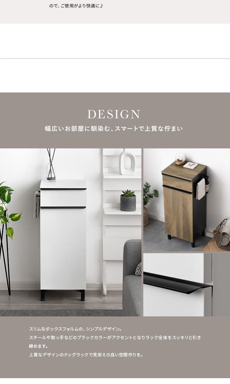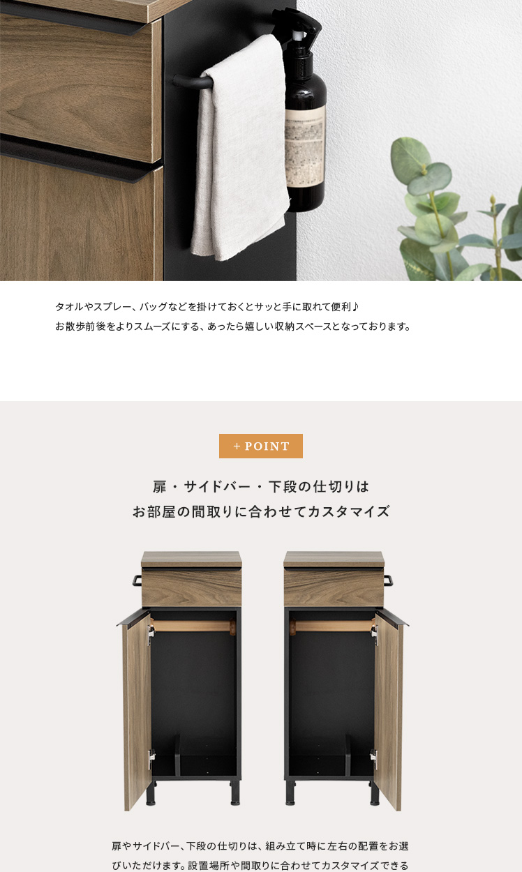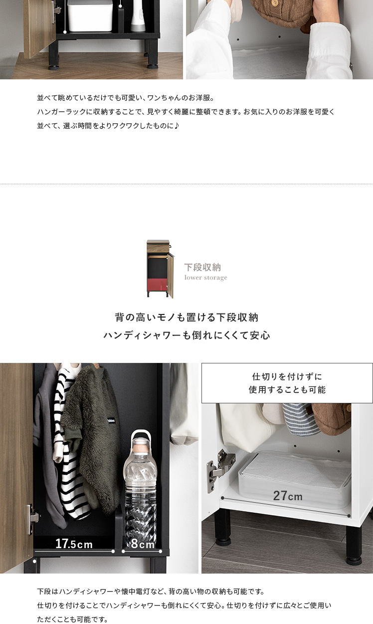 愛犬専用ラック Quince〔クィンス〕/お洋服やハーネスなど、意外とかさ張るワンちゃんのお散歩グッズをまとめて収納できるスリムラック。中身の見えないデザインで生活感を隠して空間を整えます。スリムな幅約33cmで、玄関など小さなスペースにも。必要なグッズが1か所で揃うので、お散歩準備もスムーズ♪可愛いワンちゃんのお洋服は、ハンガーラックに整頓して並べて、選ぶ時間をよりワクワクしたものに♪上質なデザインのラックで、スッキリ見栄えの良い空間作りを。