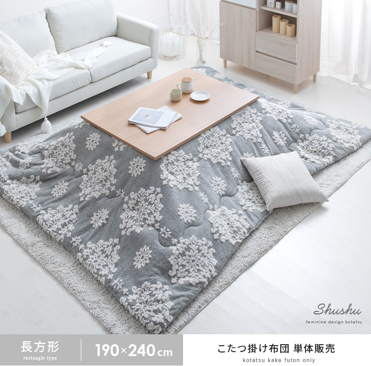 薄掛けこたつ布団 Shushu〔シュシュ〕 長方形 190×240cm/華やかなダマスク柄をあしらった、ふわもこのこたつ薄掛け布団”Shushu(シュシュ)”短毛と長毛を織り込んだ、立体感のあるふんわりした肌触りで、至福のくつろぎ時間をお過ごしいただけます。直接肌がふれることも多い裏地には、柔らかな肌触りのフランネル素材を使用。起毛したしっとり滑らかな生地で、思わず頬ずりしたくなるような心地よさとなっております。また表地には、繊細で華やかなダマスク柄をあしらいました。空間を引き立てるアクセントになり、このこたつ1枚で大人かわいい上品なお部屋を簡単におつくりいただけます。