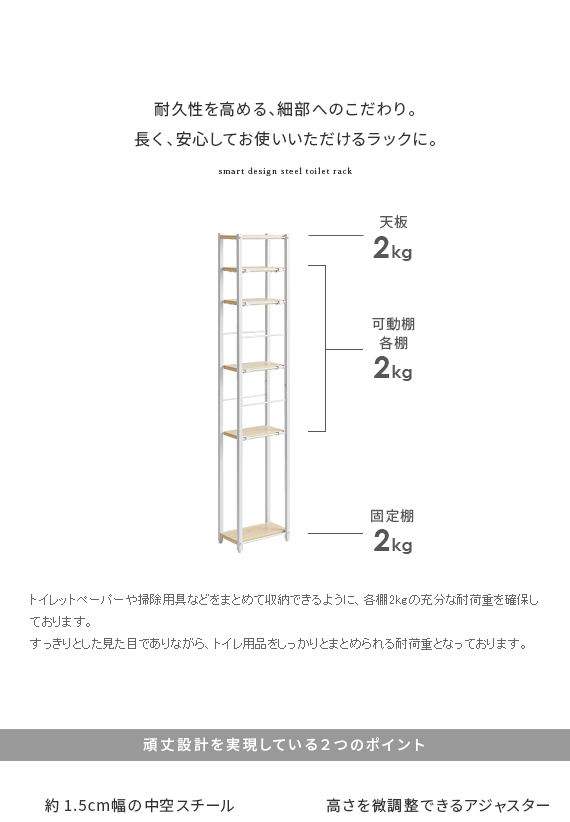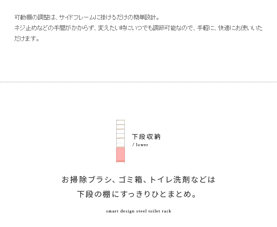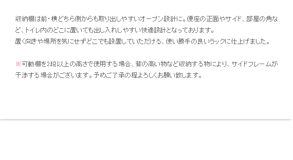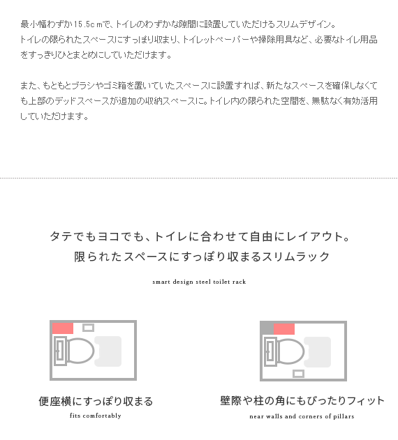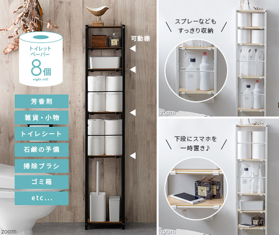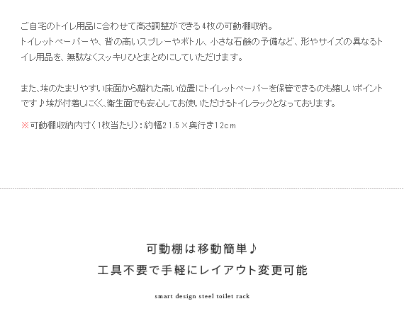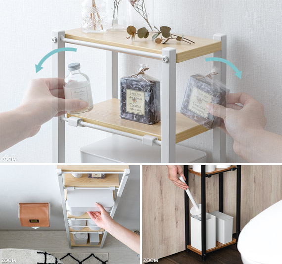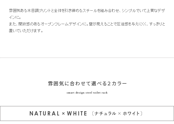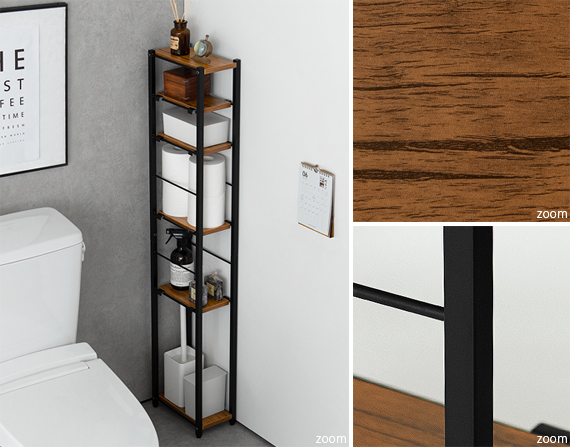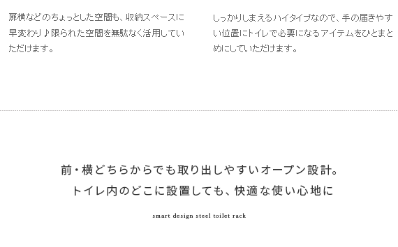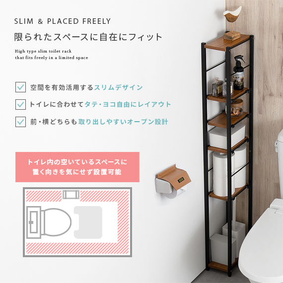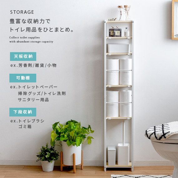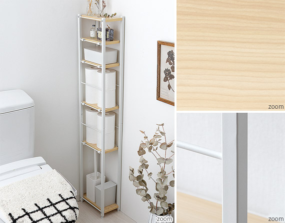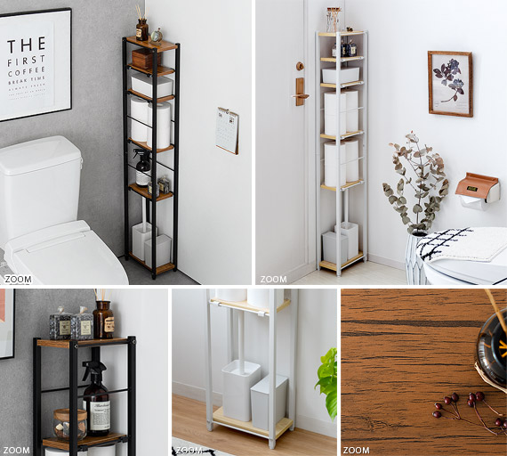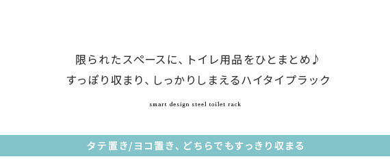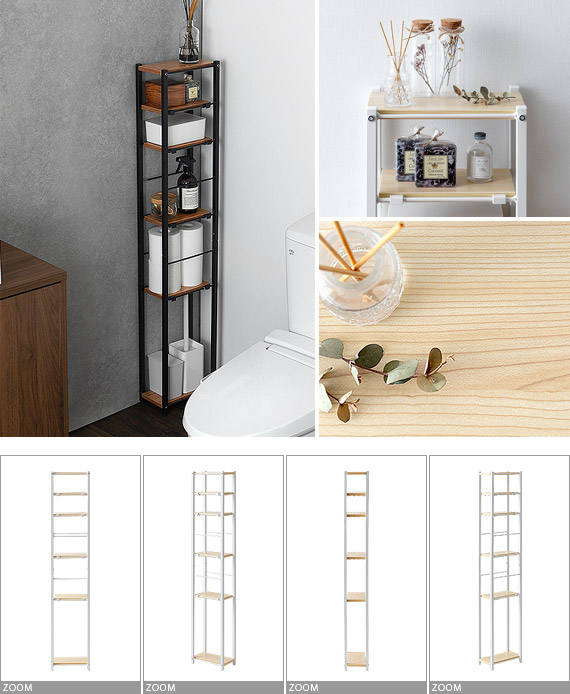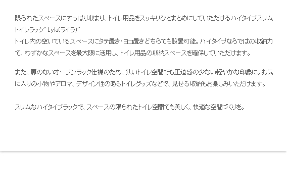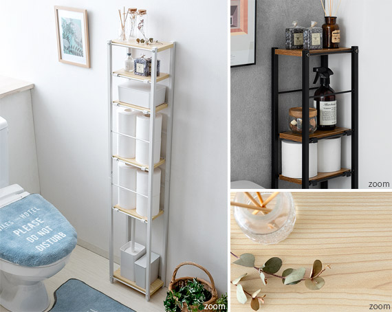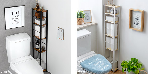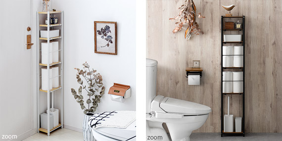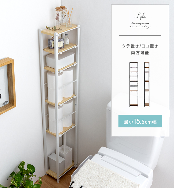 スリムトイレラック LYLA(ライラ) / 限られたスペースにすっぽり収まり、トイレ用品をスッキリひとまとめにしていただけるハイタイプスリムトイレラック“Lyla(ライラ)”トイレ内の空いているスペースにタテ置き・ヨコ置きどちらでも設置可能。ハイタイプならではの収納力で、わずかなスペースを最大限に活用し、トイレ用品の収納スペースを確保していただけます。また、扉のないオープンラック仕様のため、狭いトイレ空間でも圧迫感の少ない軽やかな印象に。お気に入りの小物やアロマ、デザイン性のあるトイレグッズなどで、見せる収納もお楽しみいただけます。スリムなハイタイプラックで、スペースの限られたトイレ空間でも美しく、快適な空間づくりを。