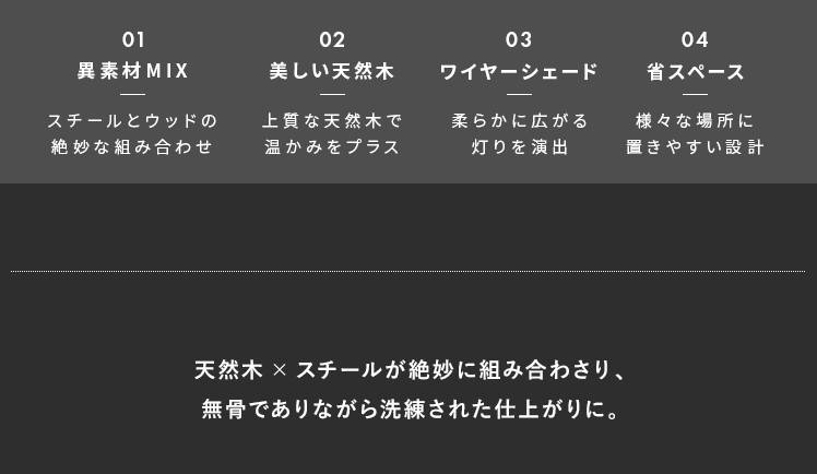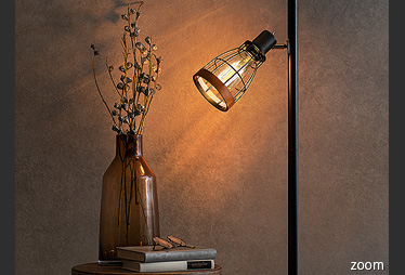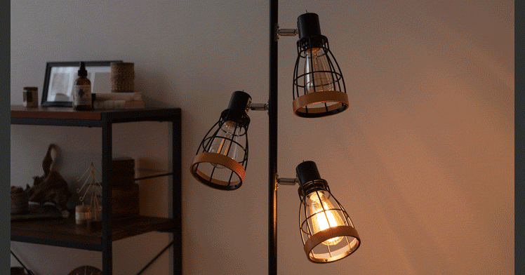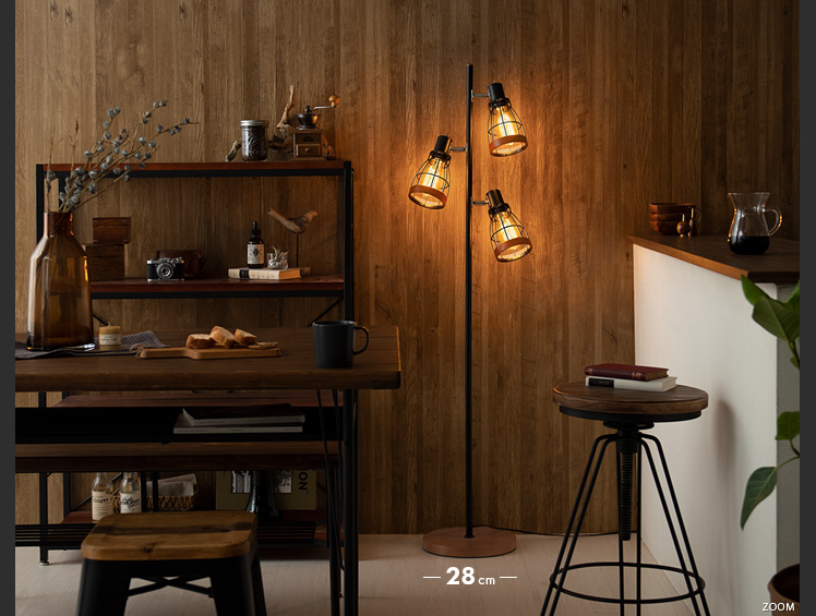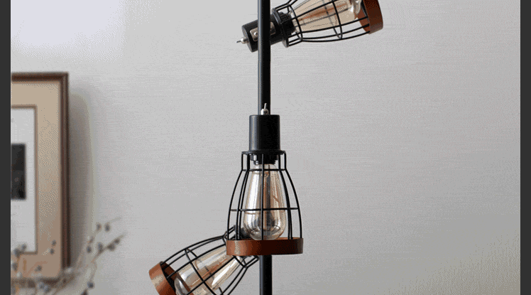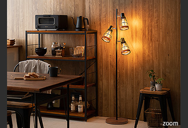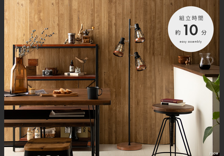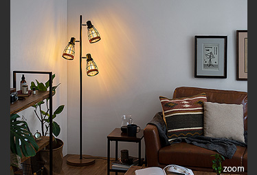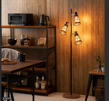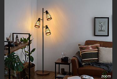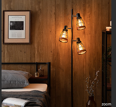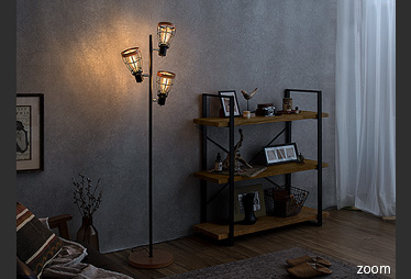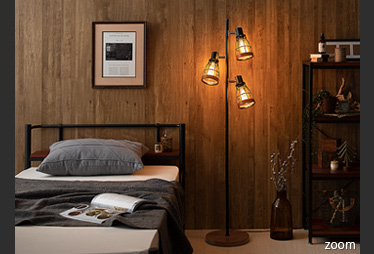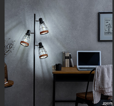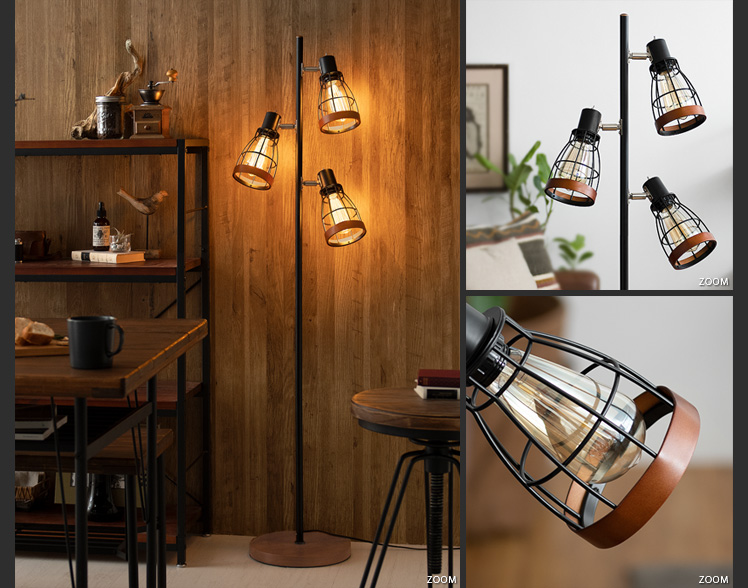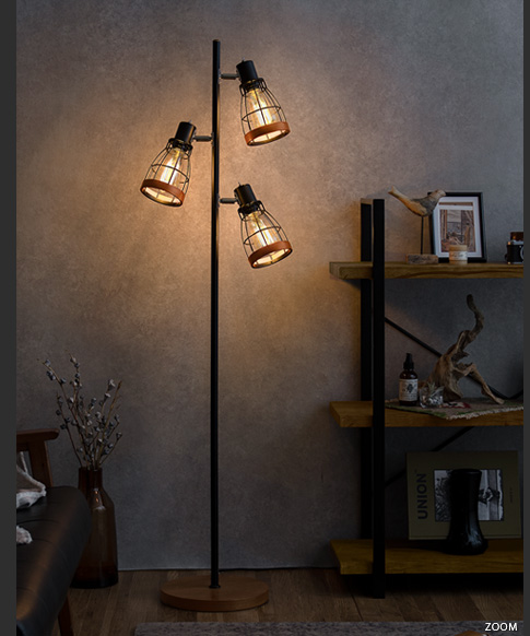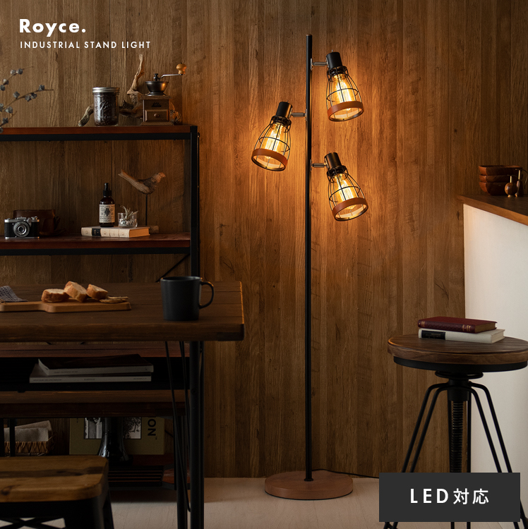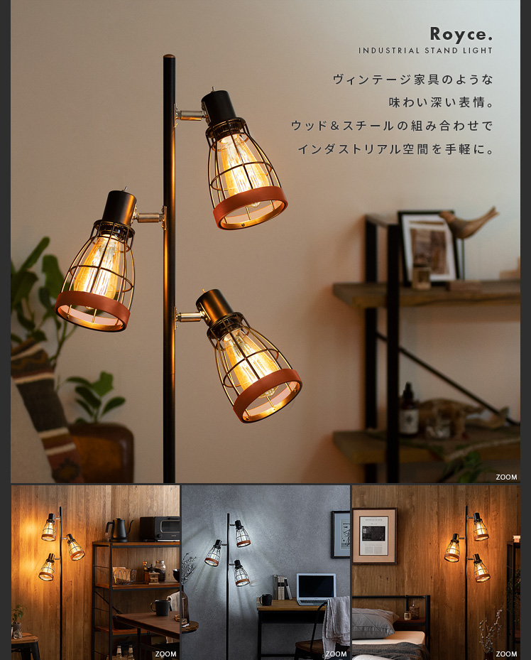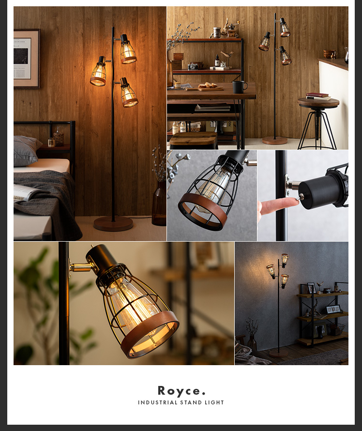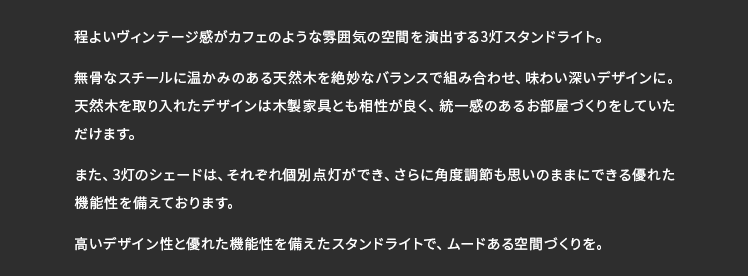 3灯スタンドライト Royce〔ロイス〕/程よいヴィンテージ感がカフェのような雰囲気の空間を演出する3灯スタンドライト。無骨なスチールに温かみのある天然木を絶妙なバランスで組み合わせ、味わい深いデザインに。天然木を取り入れたデザインは木製家具とも相性が良く、統一感のあるお部屋づくりをしていただけます。また、3灯のシェードは、それぞれ個別点灯ができ、さらに角度調節も思いのままにできる優れた機能性を備えております。高いデザイン性と優れた機能性を備えたスタンドライトで、ムードある空間づくりを。