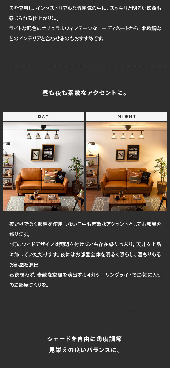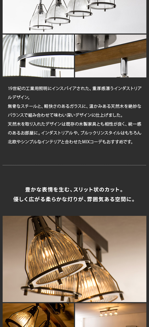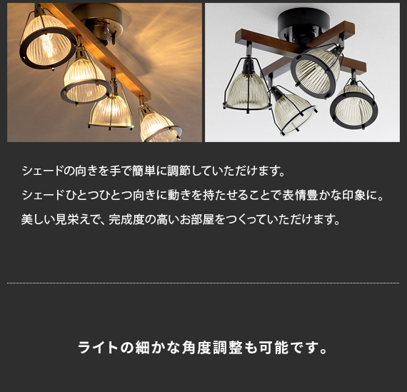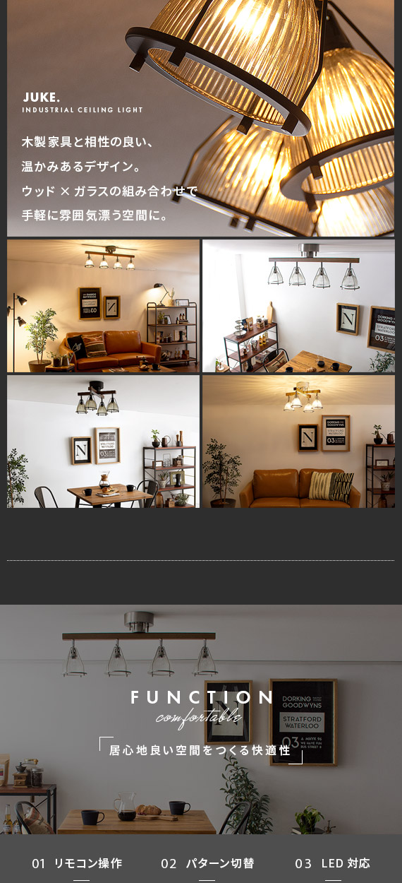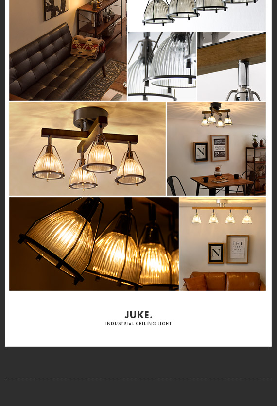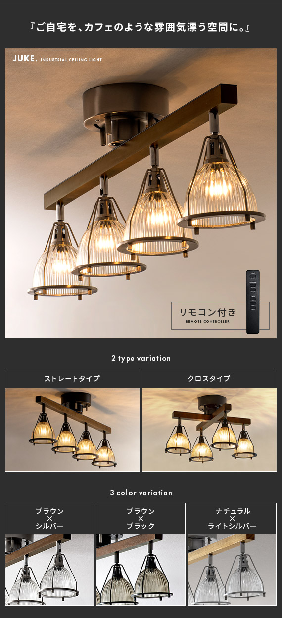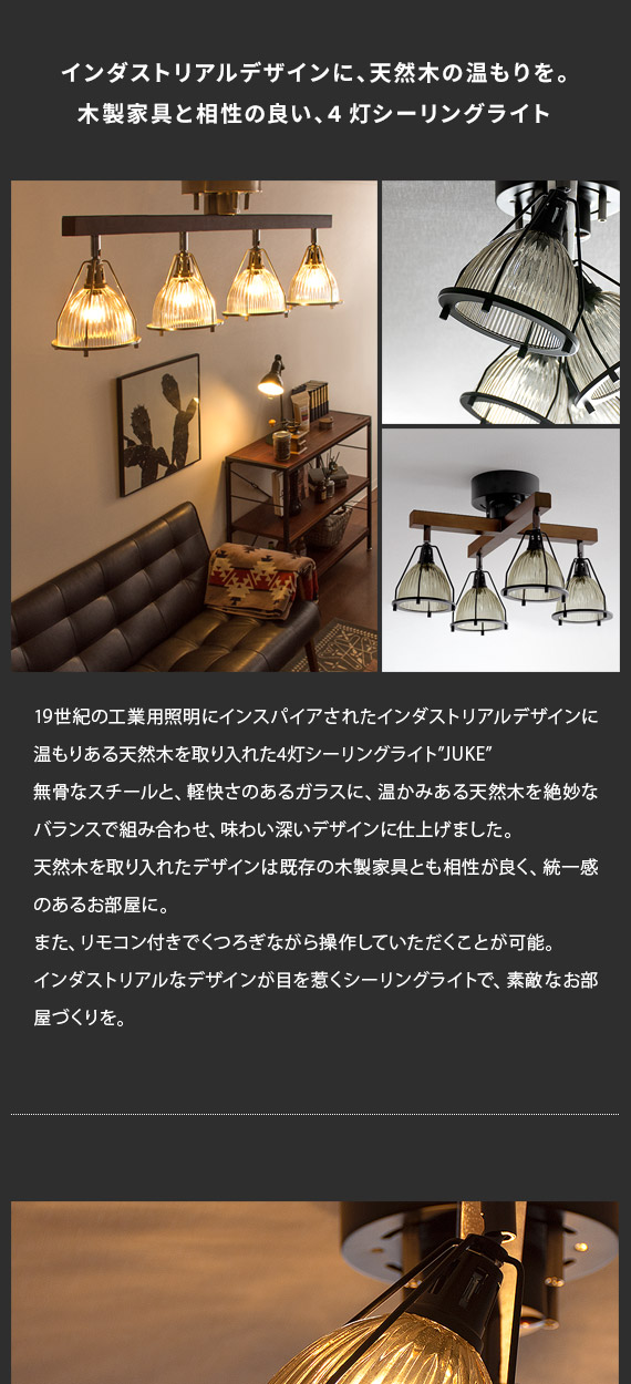 4灯シーリングライト JUKE〔ジューク〕/ 19世紀の工業用照明からインスパイアされたインダストリアルデザインに、温もりある天然木を贅沢に取り入れた4灯シーリングライト”JUKE(ジューク)”。天然木を取り入れたデザインは既存の木製家具とも相性が良く、統一感のあるお部屋に。インダストリアルスタイルはもちろん、北欧やカフェスタイルと合わせてMIXコーデも楽しめるデザインとなっております。また、リモコン付きでゆったりとくつろぎながら操作していただくことが可能。インダストリアルなデザインが目を惹くシーリングライト”JUKE”で、カフェのような雰囲気漂う素敵なお部屋づくりを。