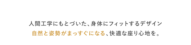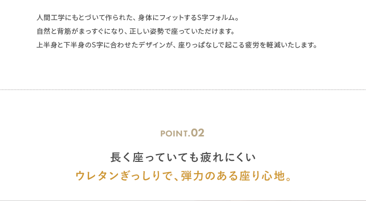 人間工学にもとづいて作られたS字フォルムが背中とお尻にフィットし、まっすぐな姿勢で快適に座っていただけます。