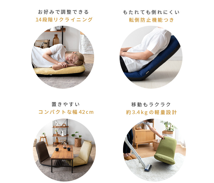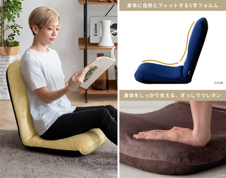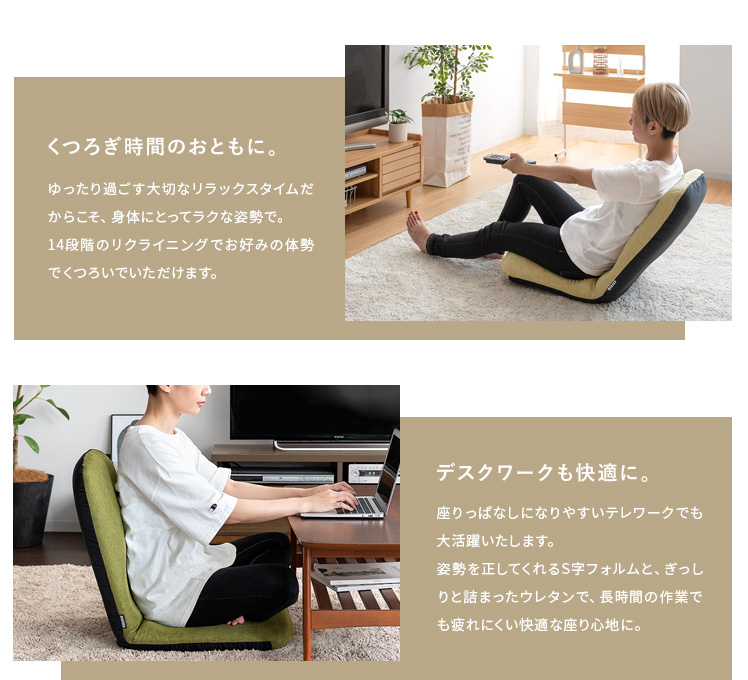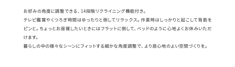 テレビ鑑賞やくつろぎ時間はゆったりと倒してリラックス。作業時はしっかりと起こして背筋をピンと。