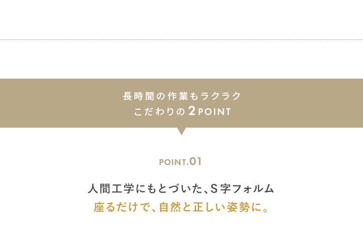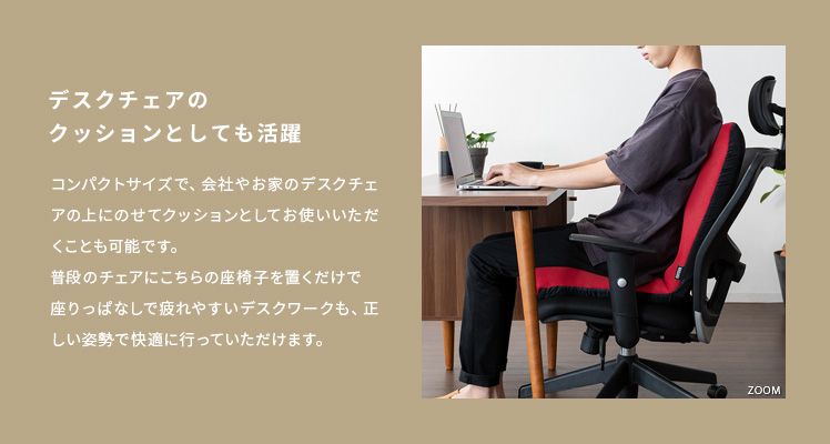 座りっぱなしで疲れやすいデスクワークも、正しい姿勢で快適に行っていただけます。