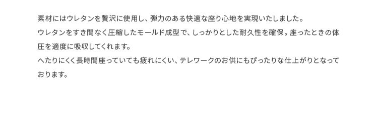 ウレタンを贅沢に使用し、弾力のある快適な座り心地を実現。ウレタンを隙間なく圧縮したモールド成型で、耐久性を確保。座ったときの体圧を適度に吸収します。