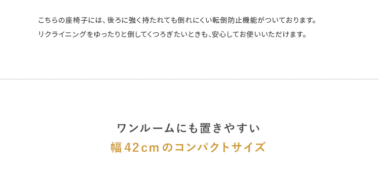 後ろに強く持たれても倒れにくい転倒防止機能つき。