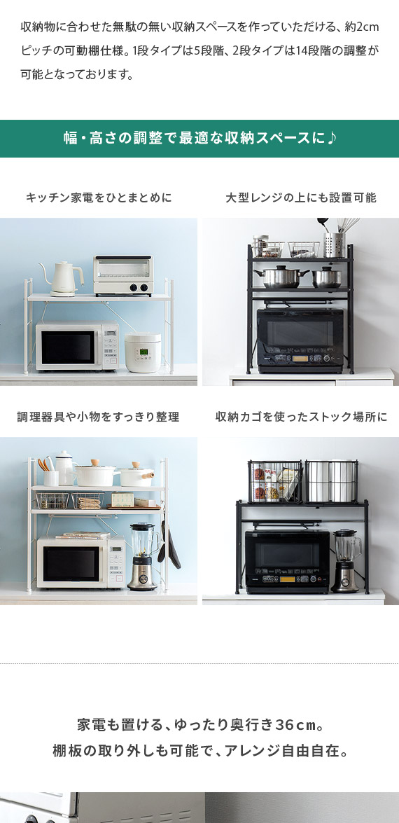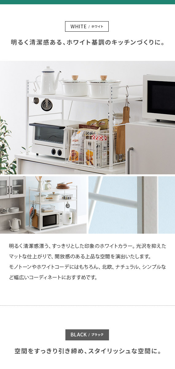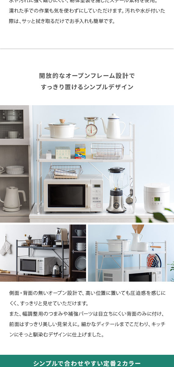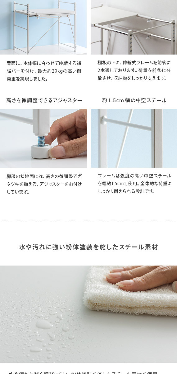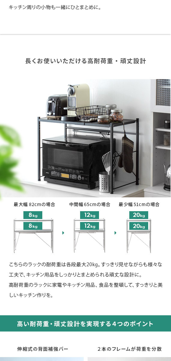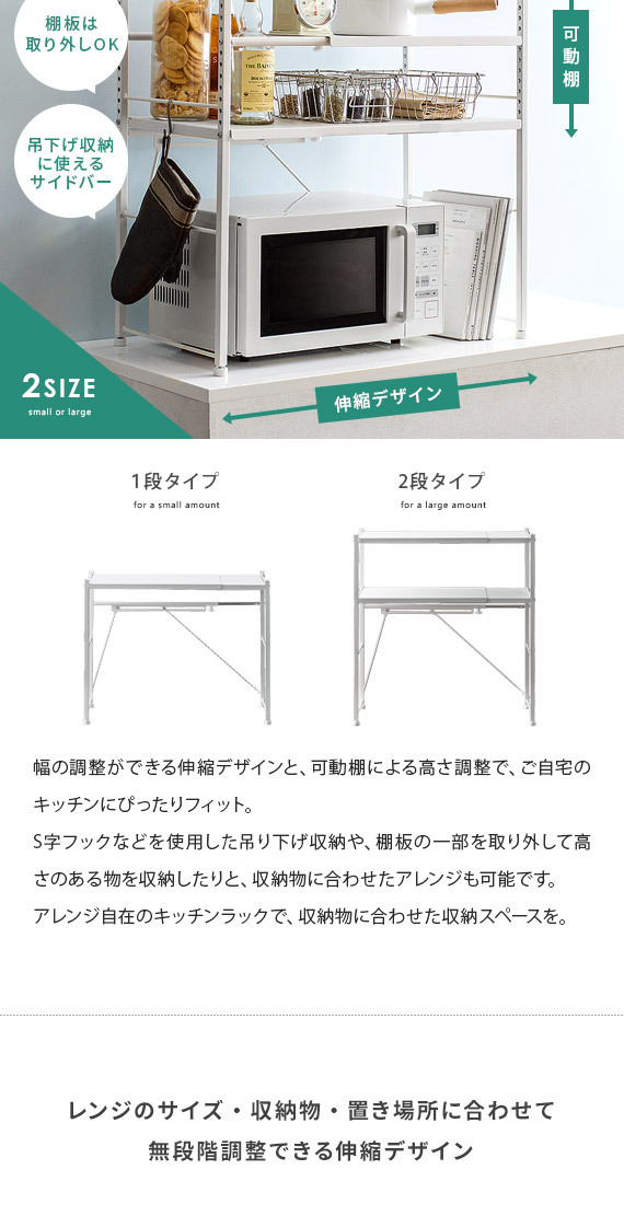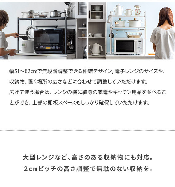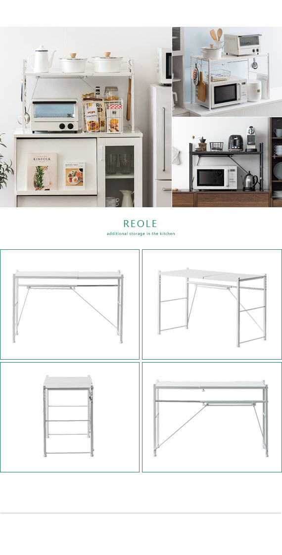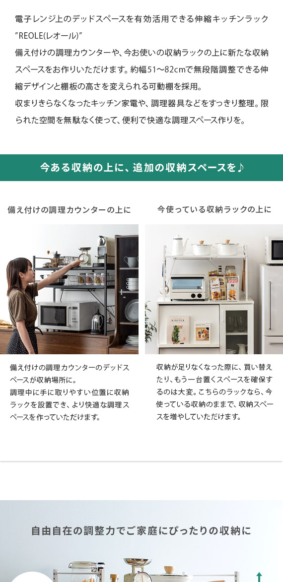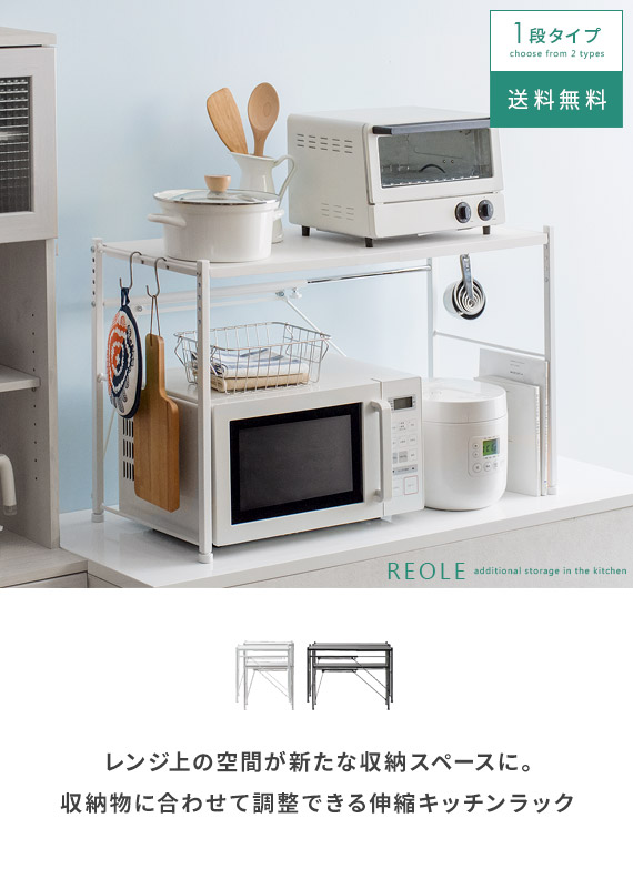 伸縮キッチンラック Reole(レオール) 1段タイプ / 電子レンジ上のデッドスペースを有効活用できる伸縮キッチンラック”REOLE(レオール)”備え付けの調理カウンターや、今お使いの収納ラックの上に新たな収納スペースを作っていただけます。こちらのラックは、約幅51〜82cmで無段階調整できる伸縮デザインと、棚板の高さを変えられる可動棚を採用。レンジの大きさや収納物の量、置く場所の広さなどに合わせたご家庭のキッチンにちょうどいい形で設置して頂けます。もとの収納スペースでは収まりきらなくなったキッチン家電や、調理器具、食材などをすっきり整理。キッチンの限られた空間を無駄なく使って、便利で快適な調理スペース作りを。