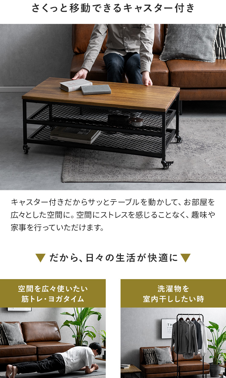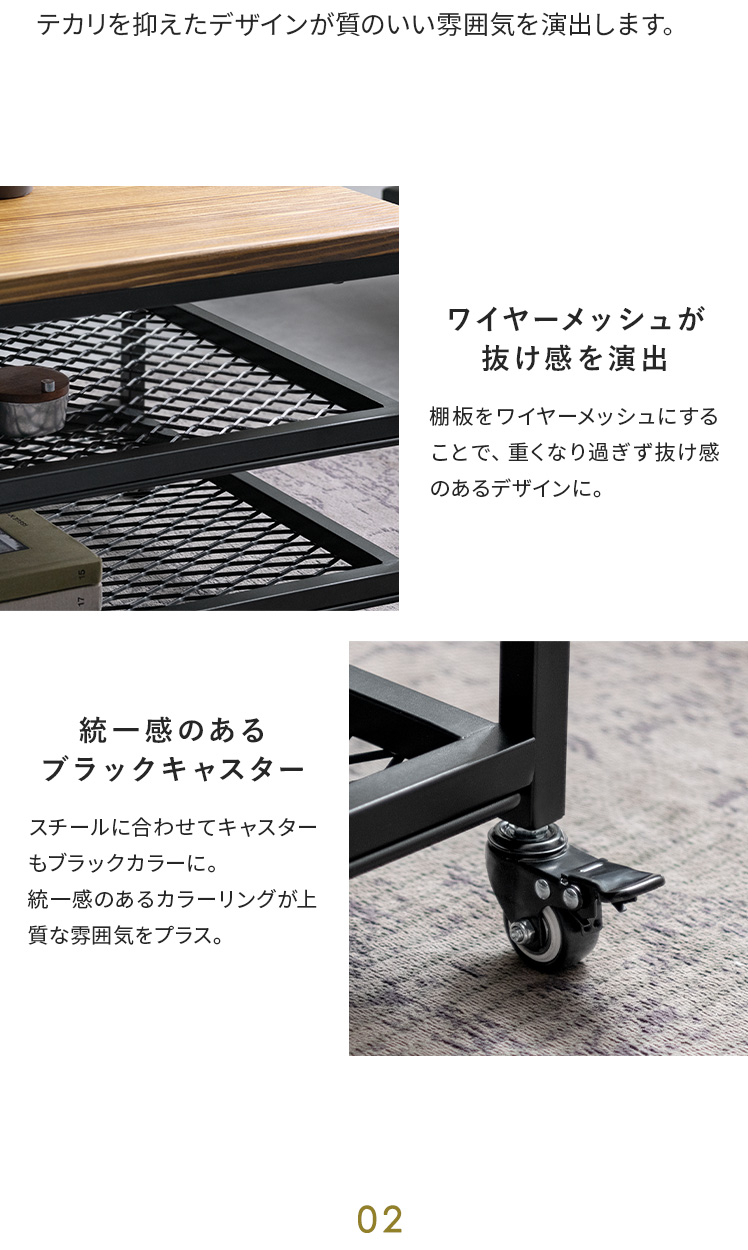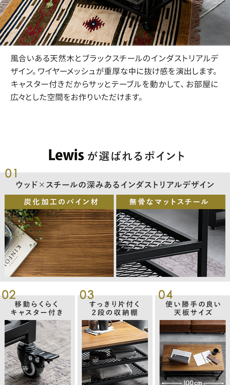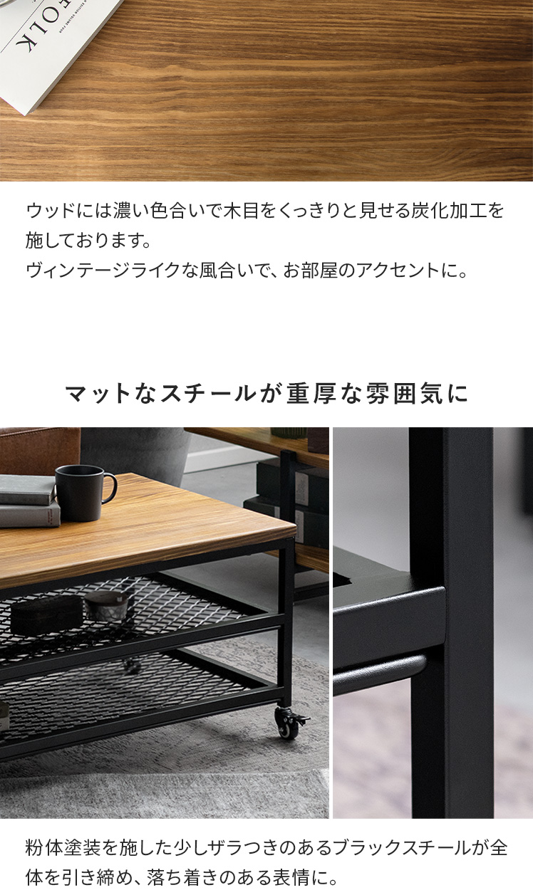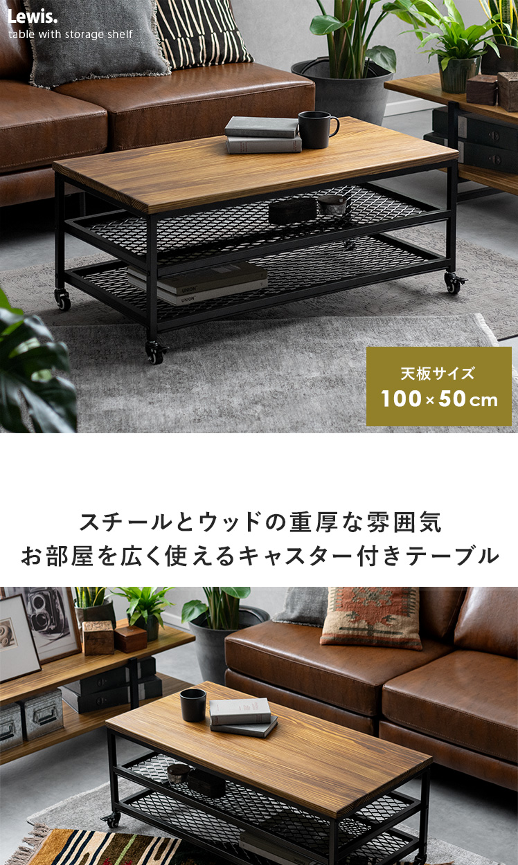 キャスター付きヴィンテージウッドテーブル Lewis〔ルイス〕 /風合いある天然木とブラックスチールのインダストリアルデザイン。ワイヤーメッシュが重厚な中に抜け感を演出します。キャスター付きだからサッとテーブルを動かして、お部屋に広々とした空間をお作りいただけます。