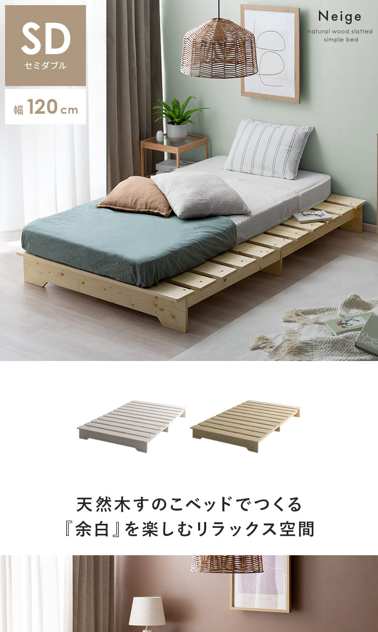 天然木ステージすのこベッド セミダブル Neige〔ネージュ〕/お部屋を広く見せるステージベッド“Neige(ネージュ)”高さを抑えたステージ構造で、空間に開放感を生みだします。サイズ選びは、マットレスより1つ大きなものがおすすめ♪ベッドサイドの“余白”に、照明や読みかけの本、スマホを置くなど、より自由で快適なリラックス空間をおつくりいただけます。