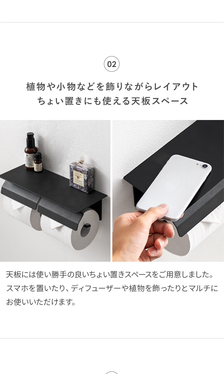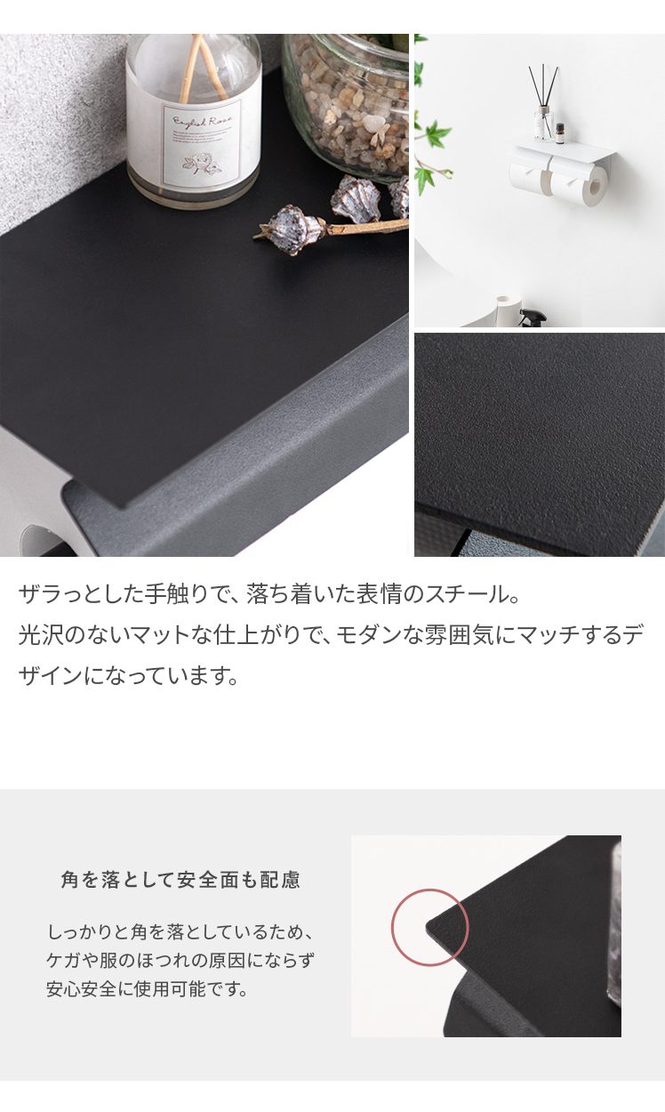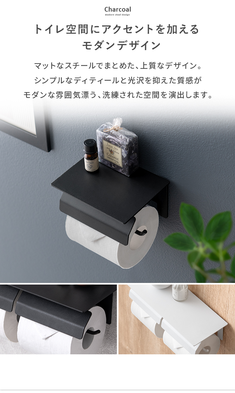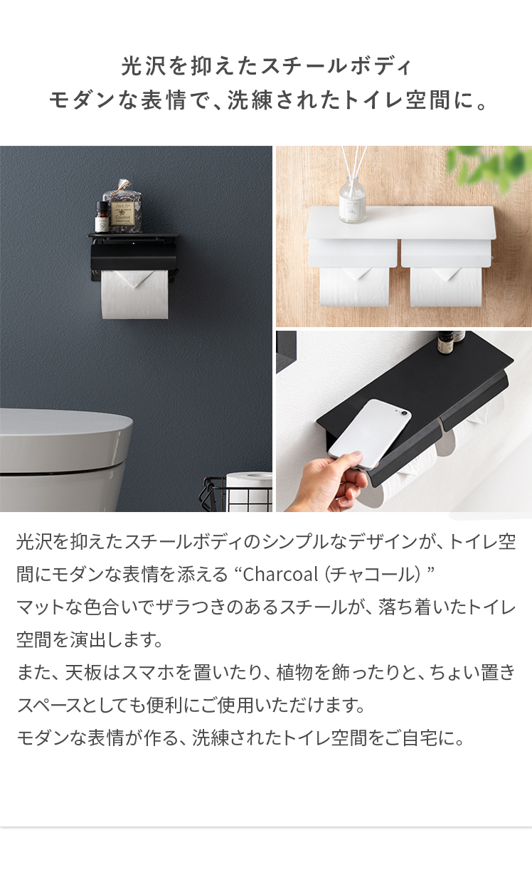 トイレットペーパーホルダー Charcoal〔チャコール〕シングルタイプ/光沢を抑えたスチールボディのシンプルなデザインが、トイレ空間にモダンな表情を添える “Charcoal(チャコール)”マットな色合いでザラつきのあるスチールが、落ち着いたトイレ空間を演出します。また、天板はスマホを置いたり、植物を飾ったりと、ちょい置きスペースとしても便利にご使用いただけます。モダンな表情が作る、洗練されたトイレ空間をご自宅に。