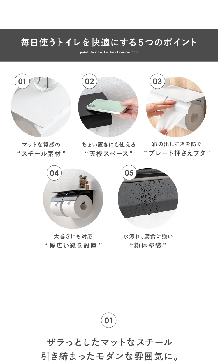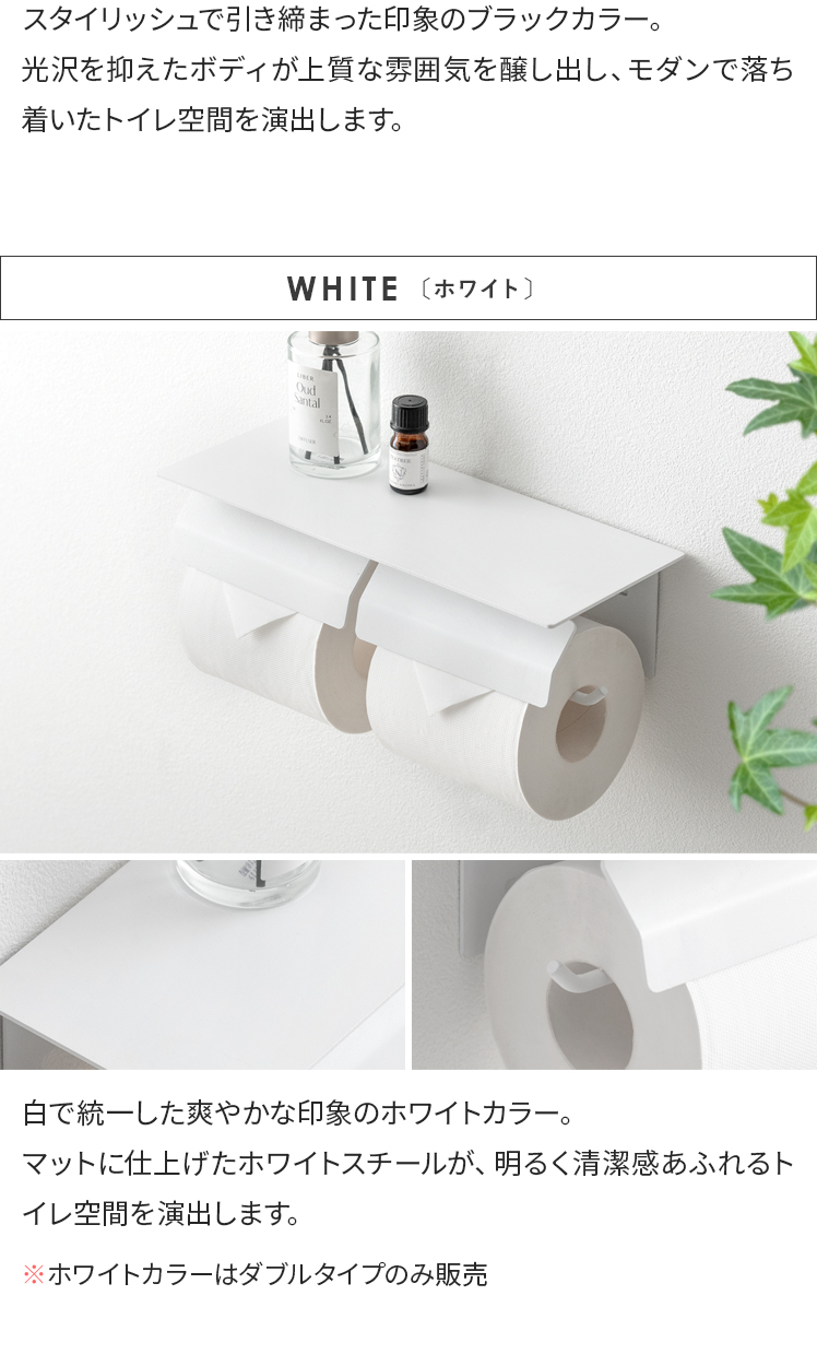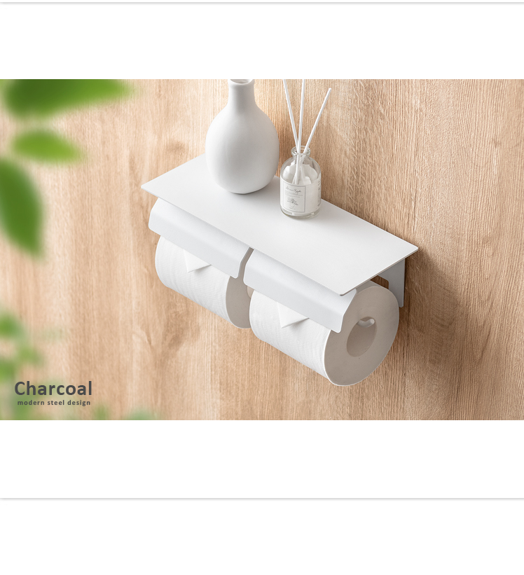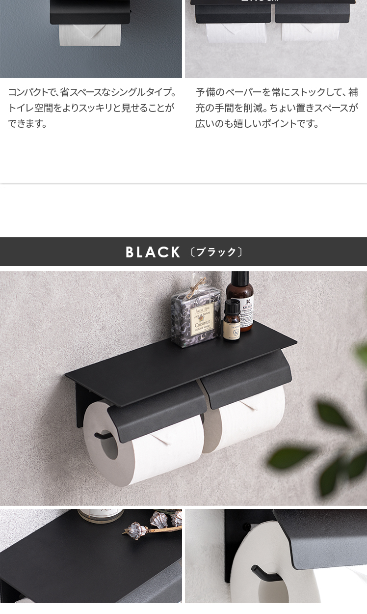 トイレットペーパーホルダー Charcoal〔チャコール〕シングルタイプ/光沢を抑えたスチールボディのシンプルなデザインが、トイレ空間にモダンな表情を添える “Charcoal(チャコール)”マットな色合いでザラつきのあるスチールが、落ち着いたトイレ空間を演出します。また、天板はスマホを置いたり、植物を飾ったりと、ちょい置きスペースとしても便利にご使用いただけます。モダンな表情が作る、洗練されたトイレ空間をご自宅に。