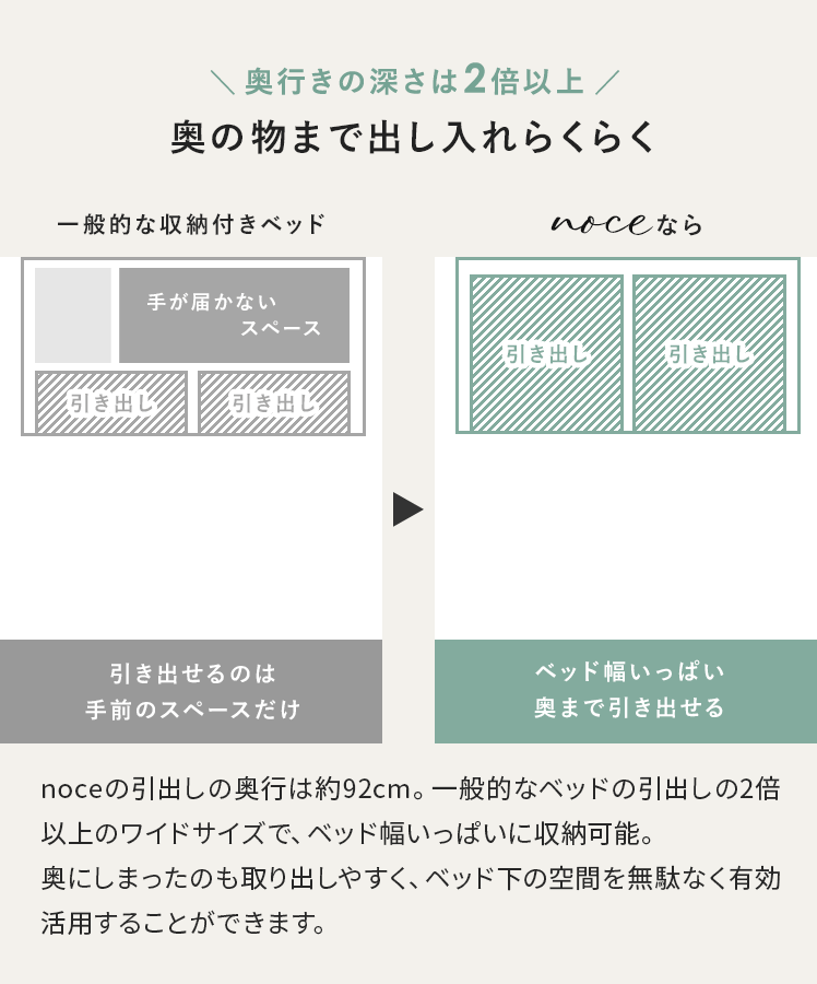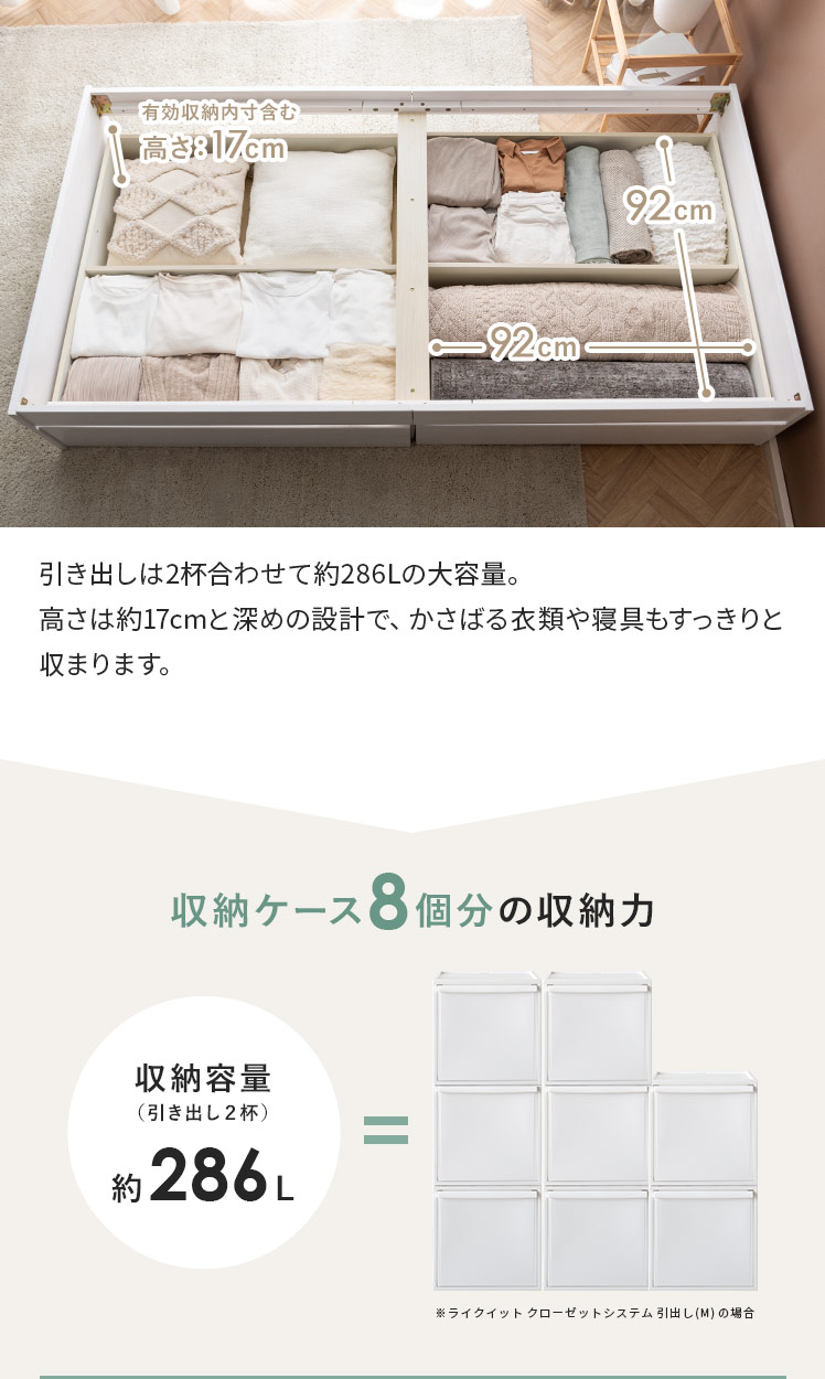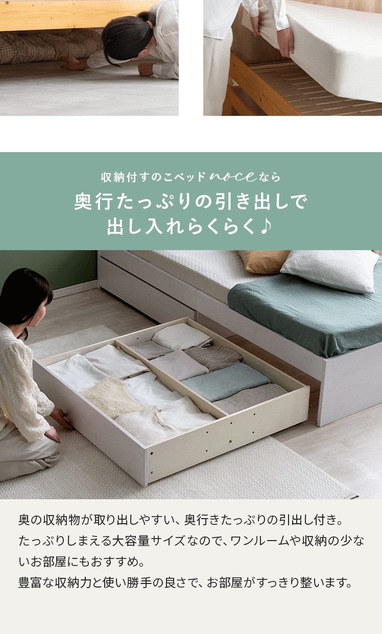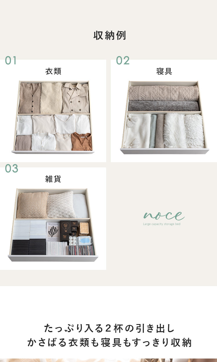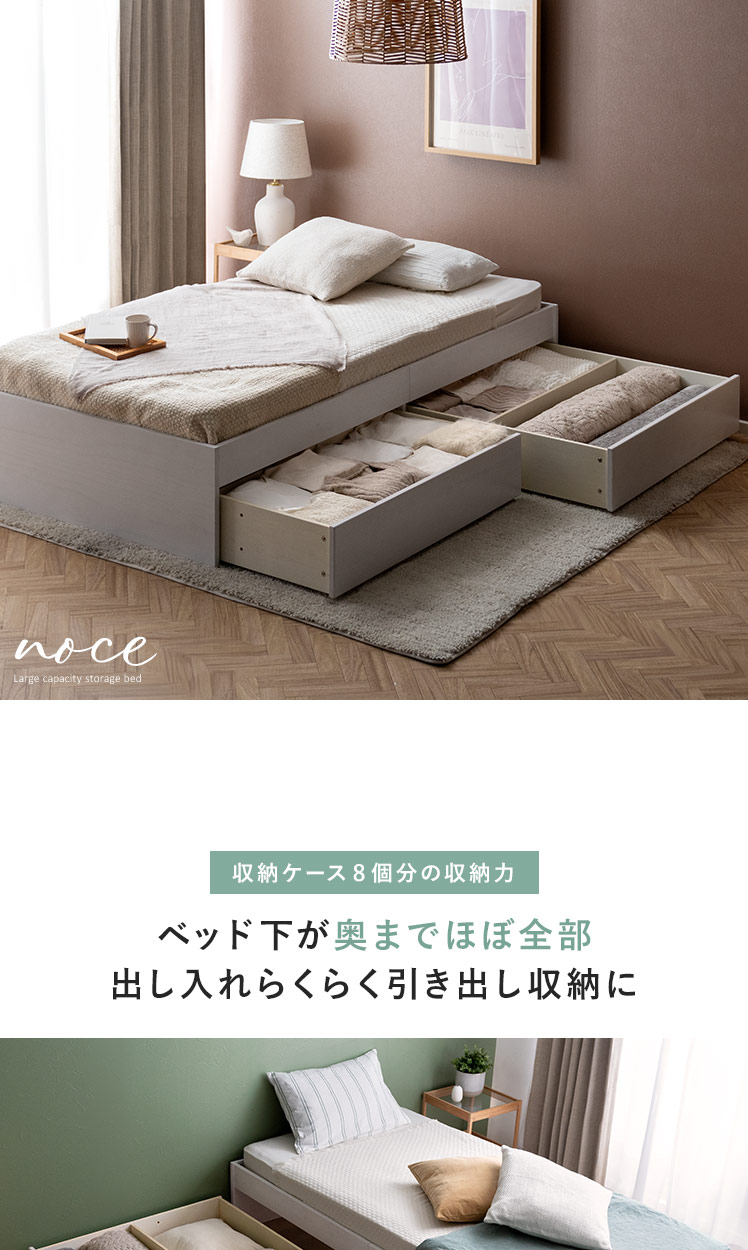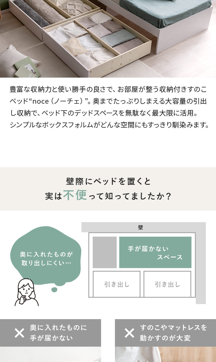 収納付すのこベッド noce〔ノーチェ〕/豊富な収納力と使い勝手の良さで、お部屋が整う収納付きすのこベッド“noce(ノーチェ)”。奥までたっぷりしまえる大容量の引出し収納で、ベッド下のデッドスペースを無駄なく最大限に活用。シンプルなボックスフォルムがどんな空間にもすっきり馴染みます。