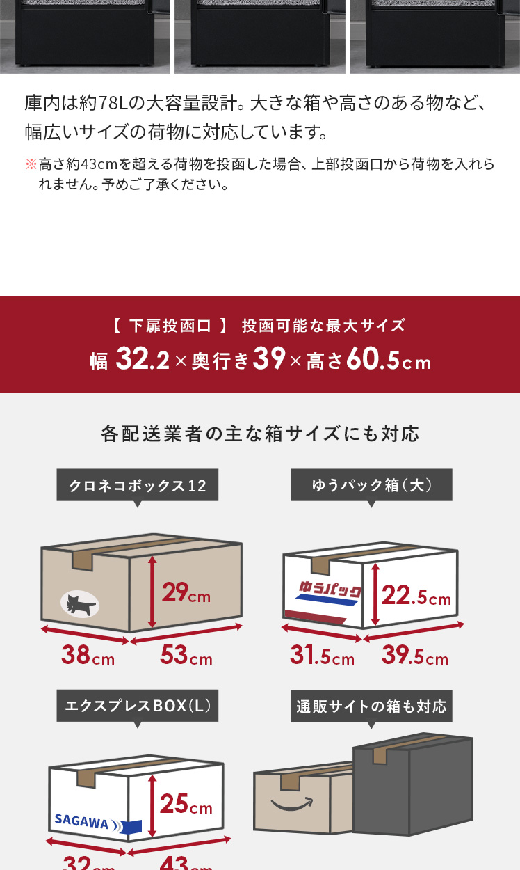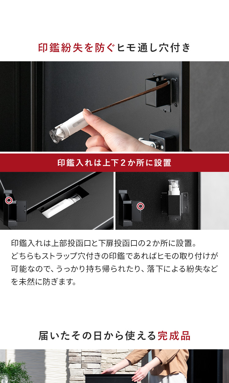 | 印鑑入れ内寸 | 上部投函口/約幅8×奥行き2.4×高さ2.5cm、宅配ボックス/約幅2.3×奥行き2.9×高さ4cm |