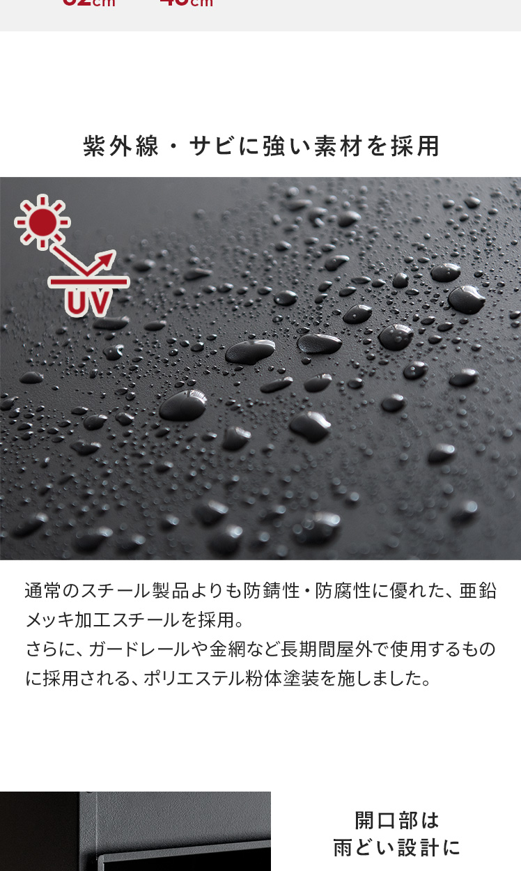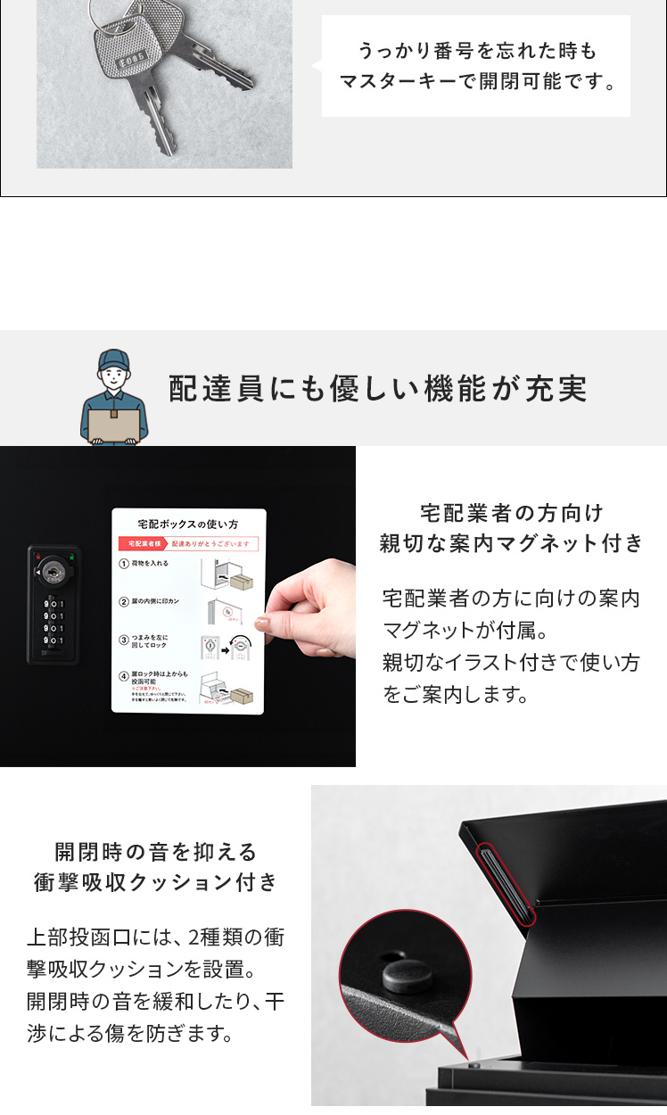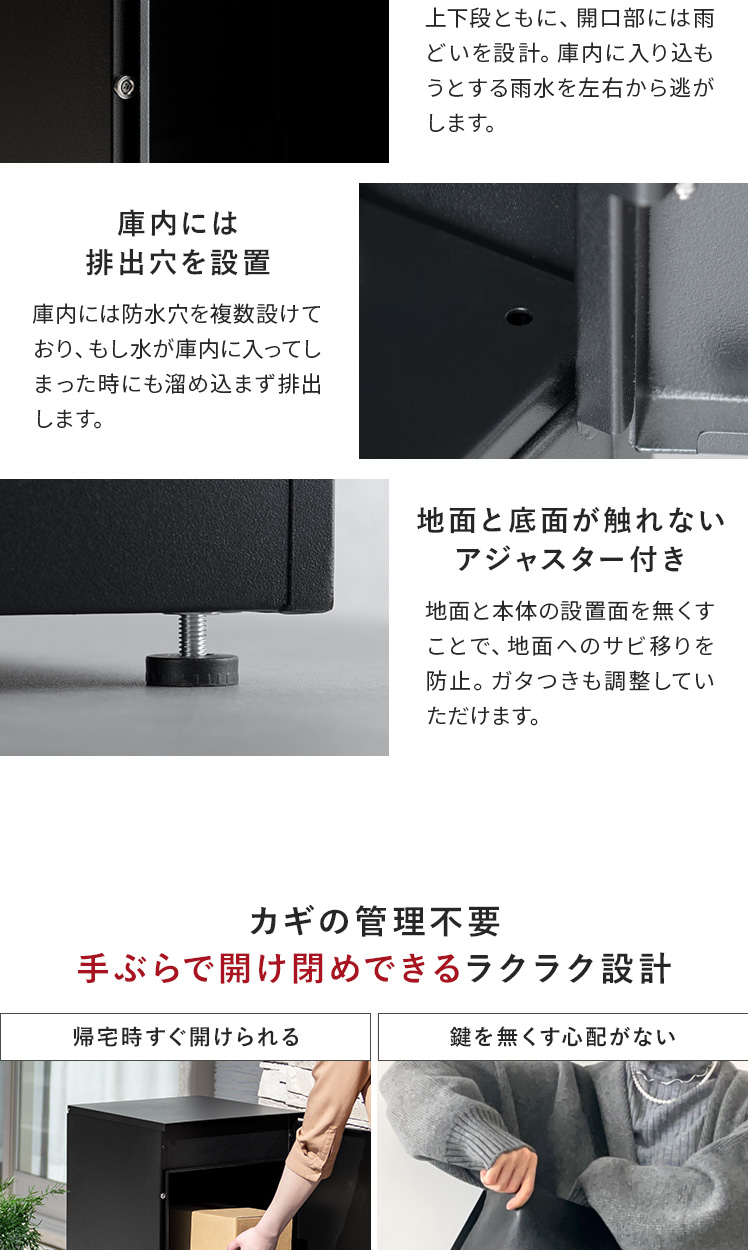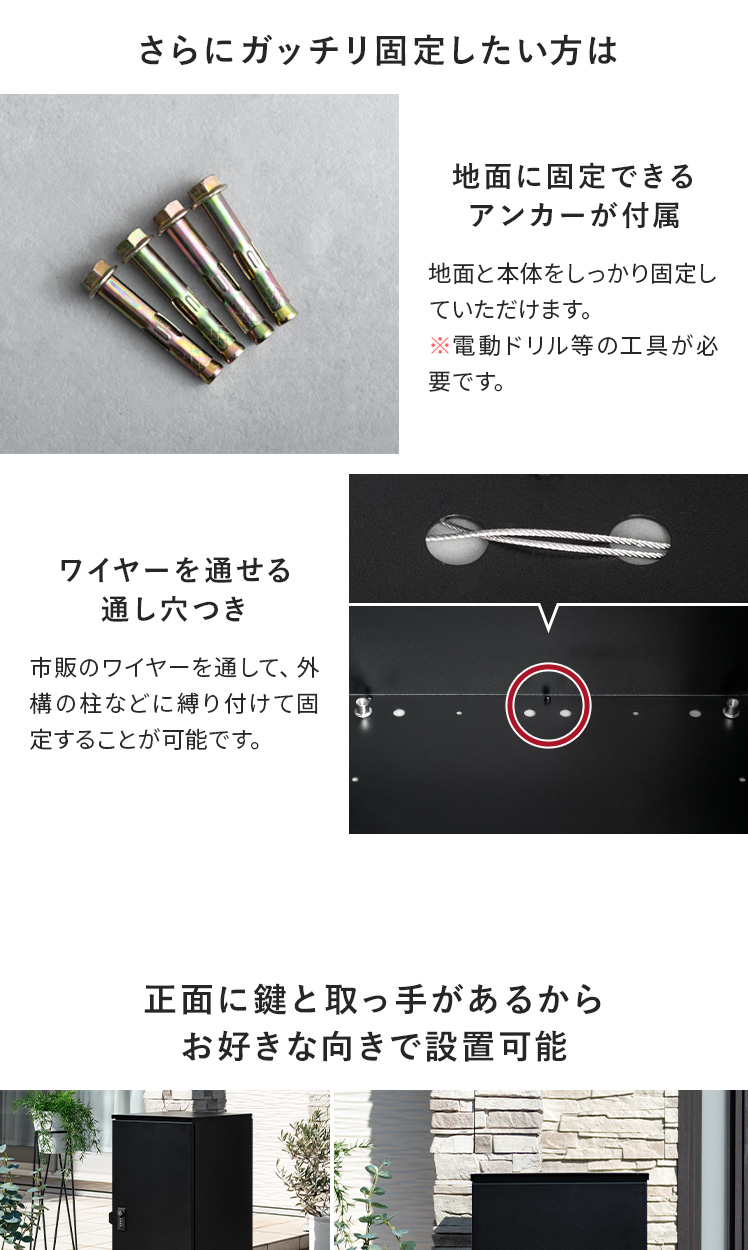 | 備考 | マスターキー、アンカーボルト、案内マグネット、クッションマット、完成品 ※若干の個体差により、表記サイズと多少の差異が生じる場合がございます。 ※本製品は防滴型ですが、完全防水ではございません。設置場所や風雨の状況によっては、内部に水が入り込むことがございます。なるべく雨水のかからない場所への設置をおすすめいたします。 ※長時間雨や日光に当て続けると変色や錆・カビの原因となります。設置場所の配慮や、濡れた場合は水気を拭き取っていただくようお願いいたします。 ※貴重品、重要書類、危険物、生ものなどの保管はしないでください。 |