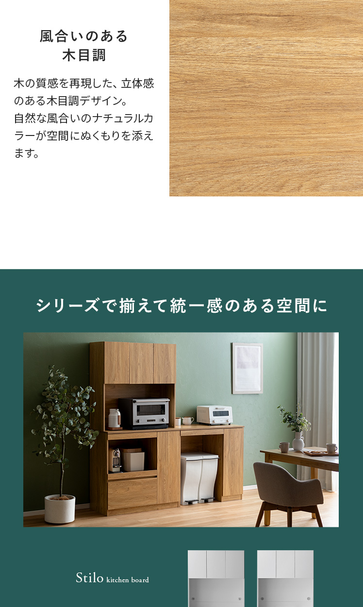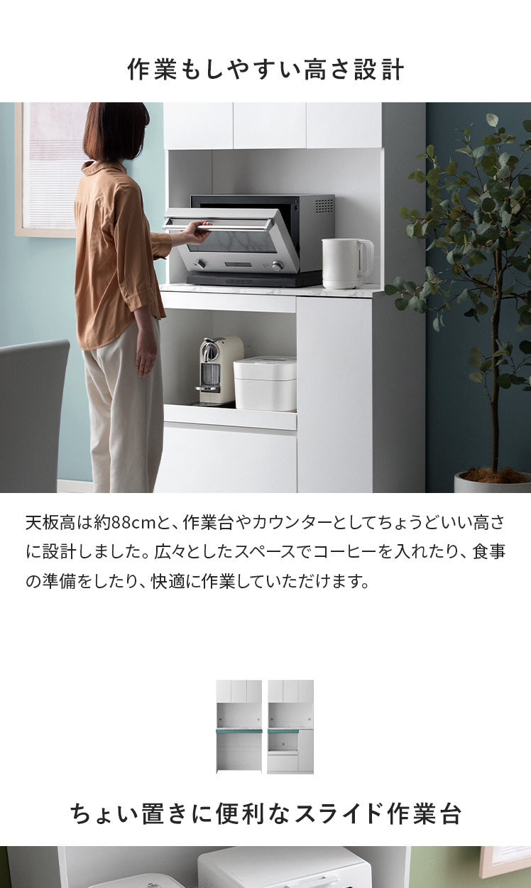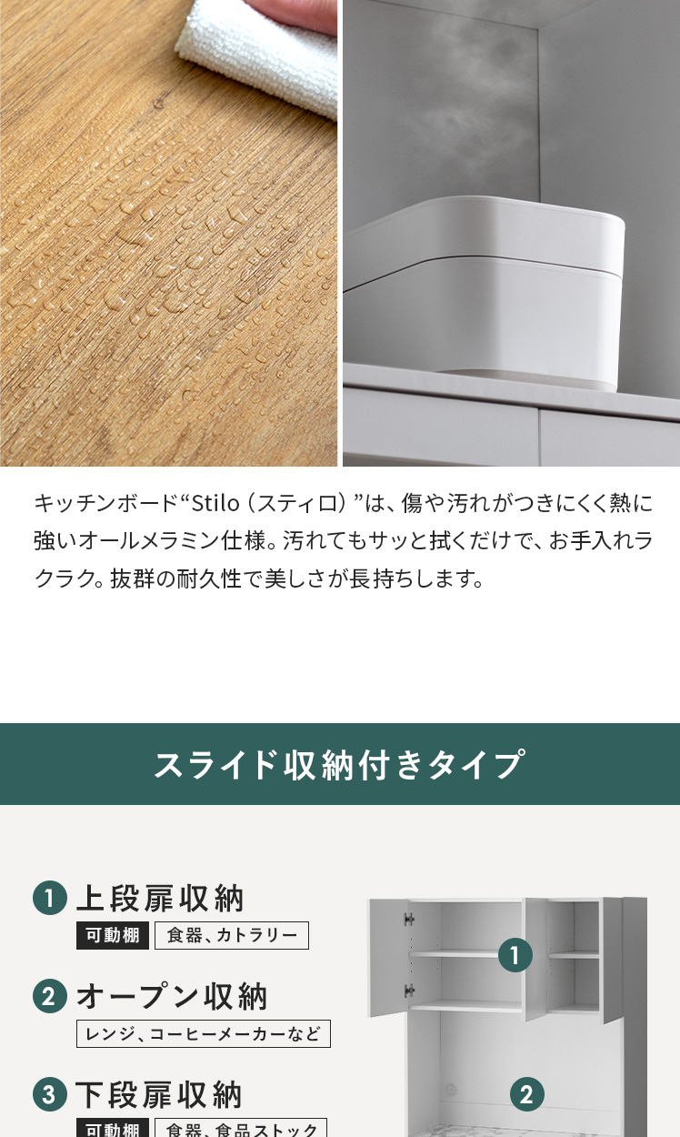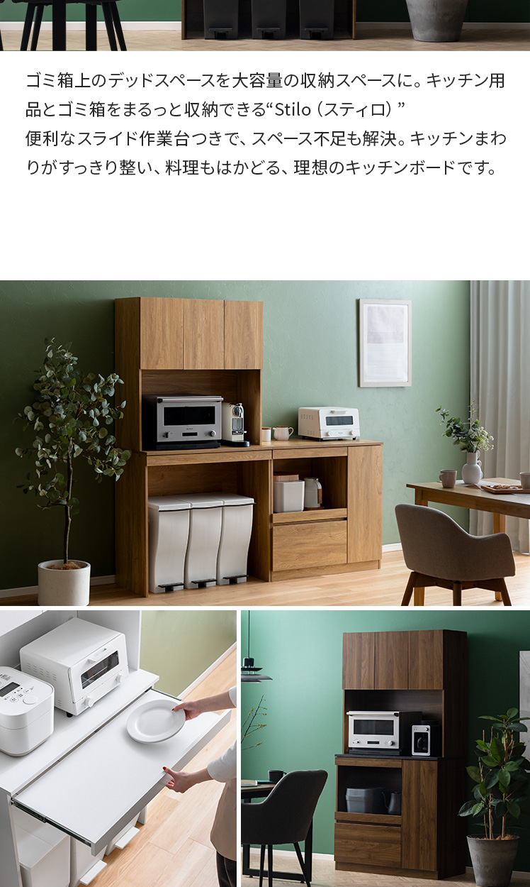 スライド収納付きキッチンボード Stilo〔スティロ〕 ハイタイプ/レンジや炊飯器などの家電や食器、ストック食品など、キッチン用品をまるっと収納できるキッチンボード“Stilo(スティロ)”便利なスライド作業台つきで、スペース不足も解決。キッチンまわりがすっきり整い、料理もはかどる、理想のキッチンボードです。