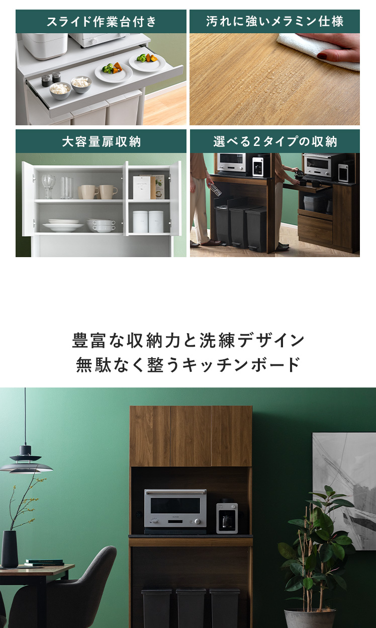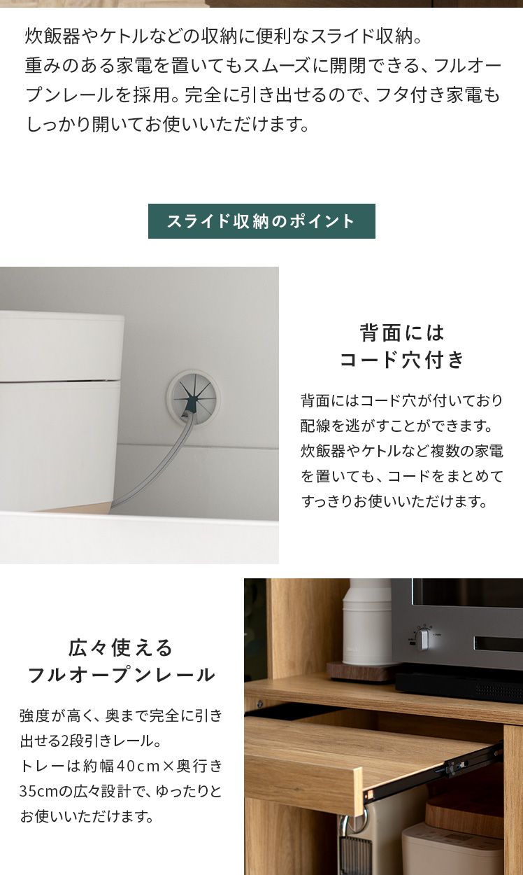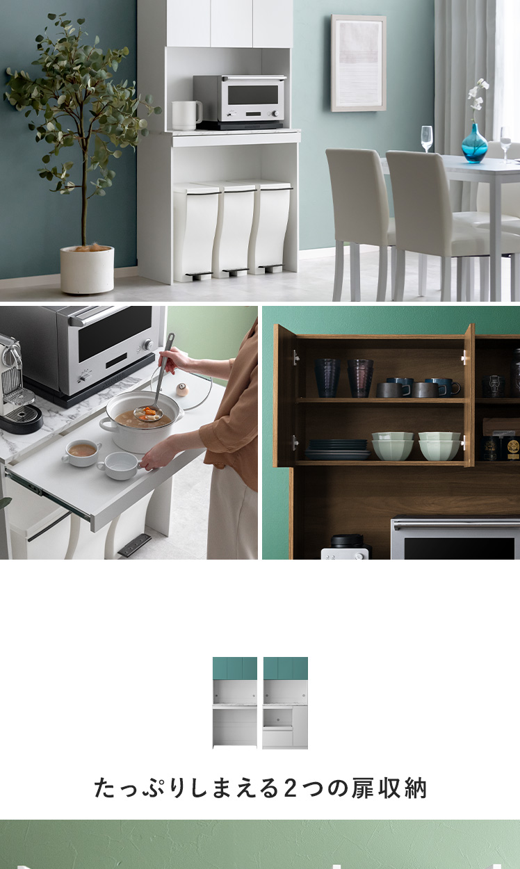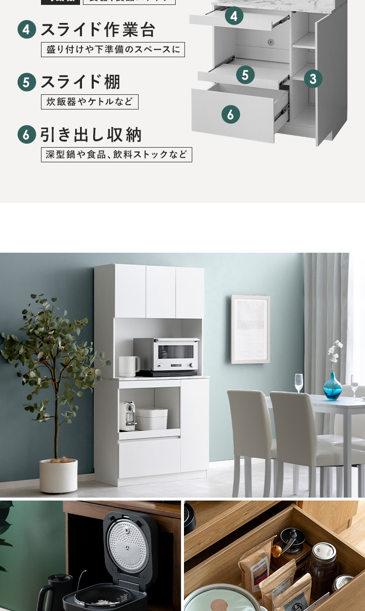 スライド収納付きキッチンボード Stilo〔スティロ〕 ハイタイプ/レンジや炊飯器などの家電や食器、ストック食品など、キッチン用品をまるっと収納できるキッチンボード“Stilo(スティロ)”便利なスライド作業台つきで、スペース不足も解決。キッチンまわりがすっきり整い、料理もはかどる、理想のキッチンボードです。