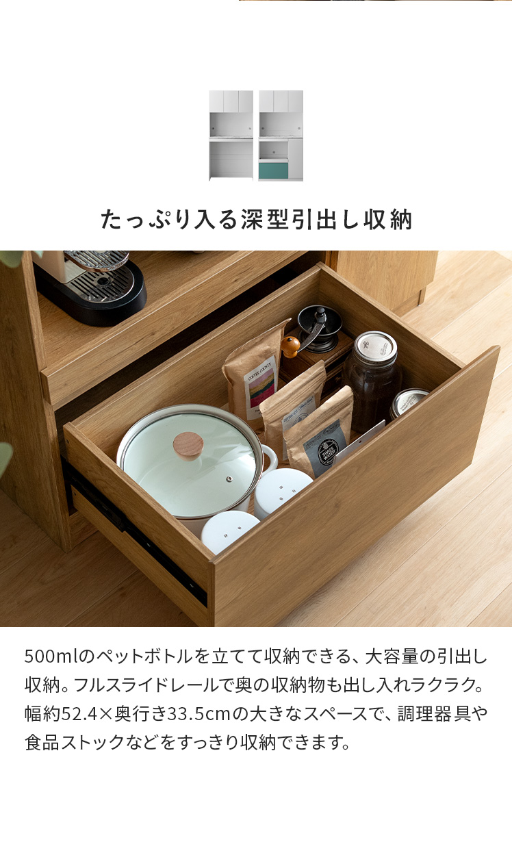 | 引出し収納内寸 | 約幅52.4×奥行き33.6×高さ18.4cm(有効収納内寸22.6cm) |