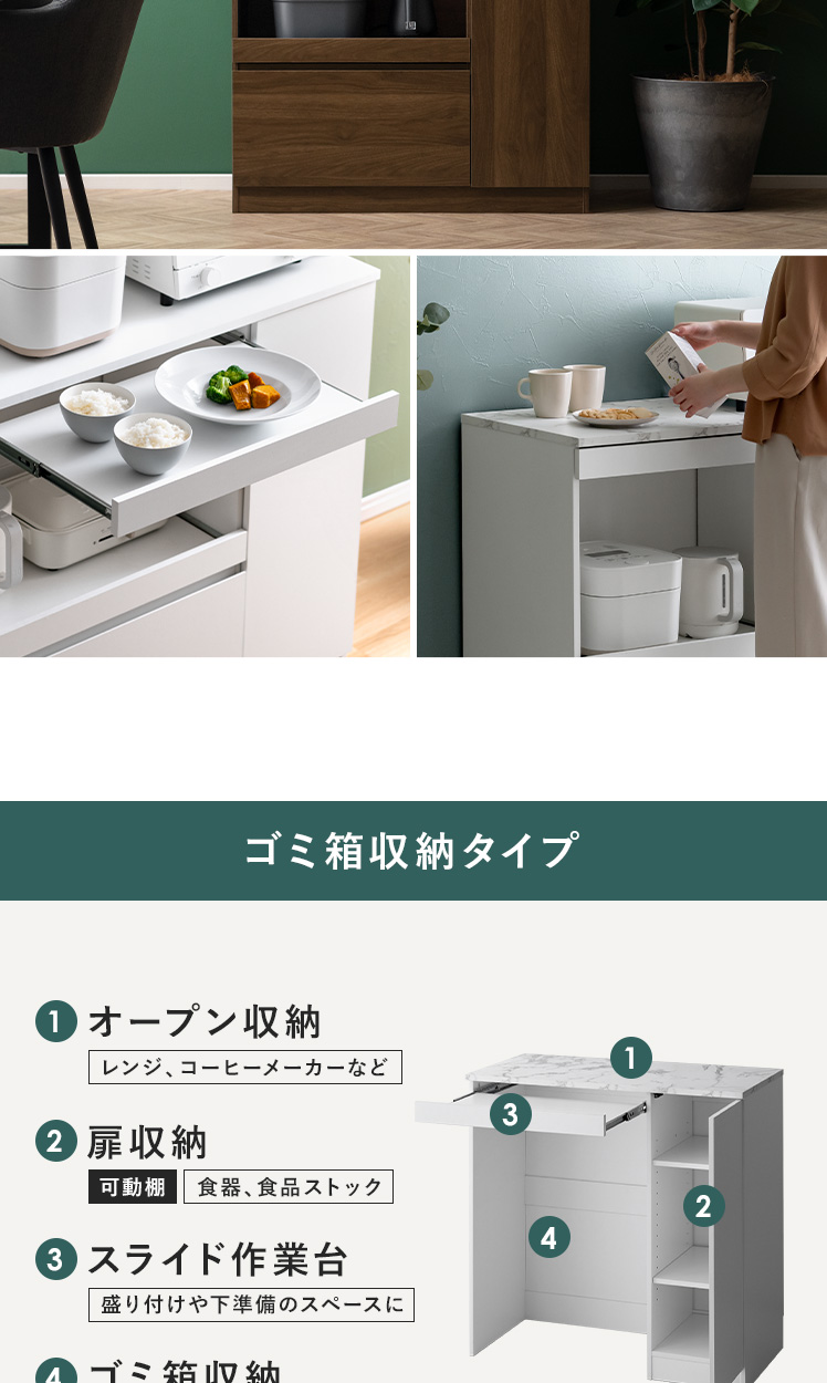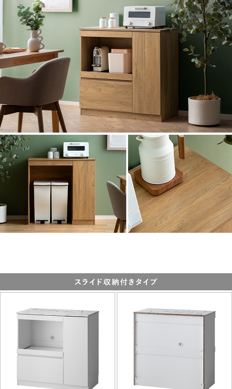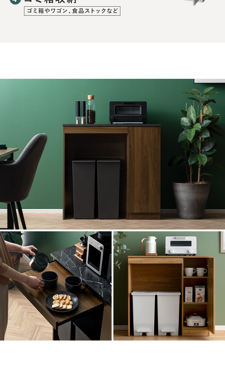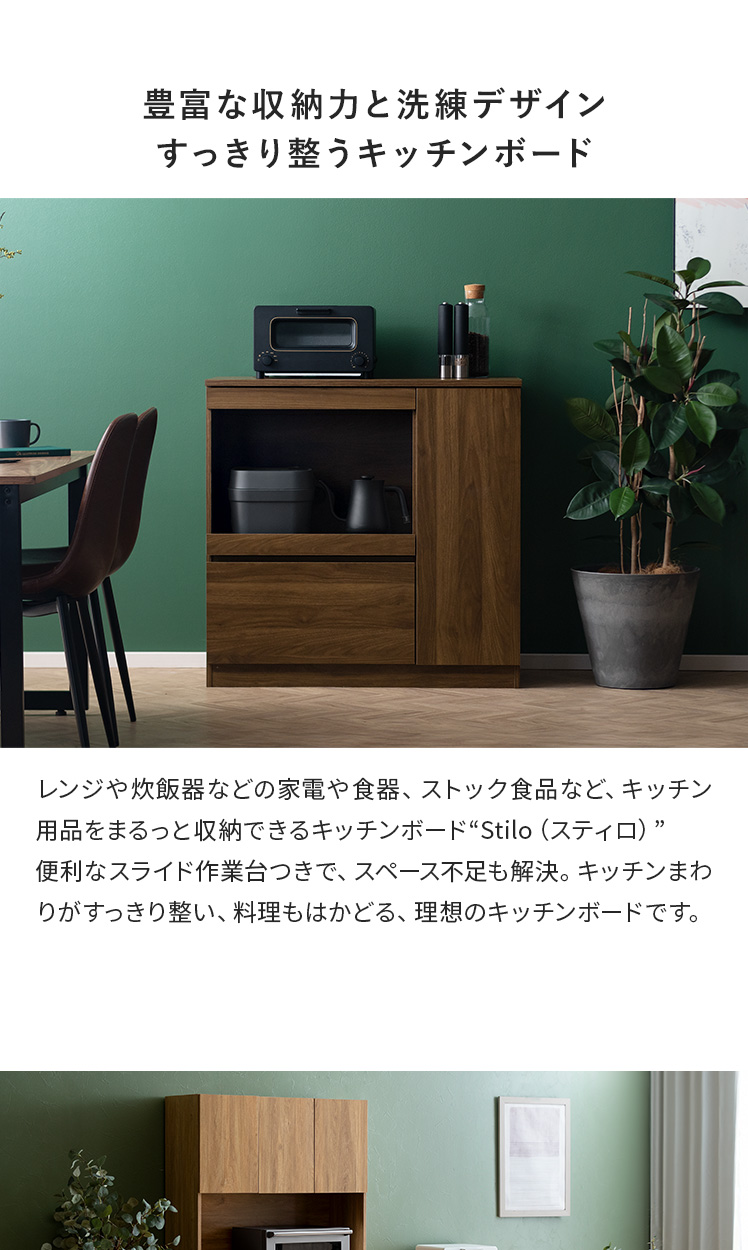 ゴミ箱収納付きキッチンボード Stilo〔スティロ〕 ロータイプ/ゴミ箱上のデッドスペースを大容量の収納スペースに。キッチン用品とゴミ箱をまるっと収納できる“Stilo(スティロ)”便利なスライド作業台つきで、スペース不足も解決。キッチンまわりがすっきり整い、料理もはかどる、理想のキッチンボードです。
