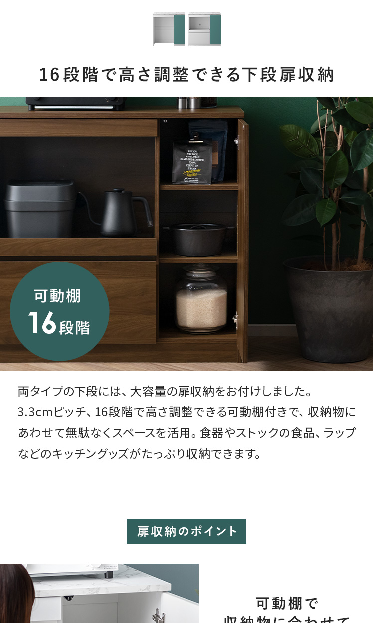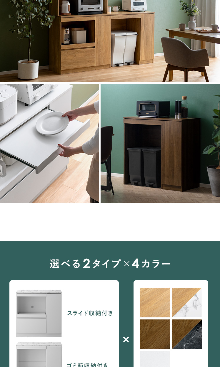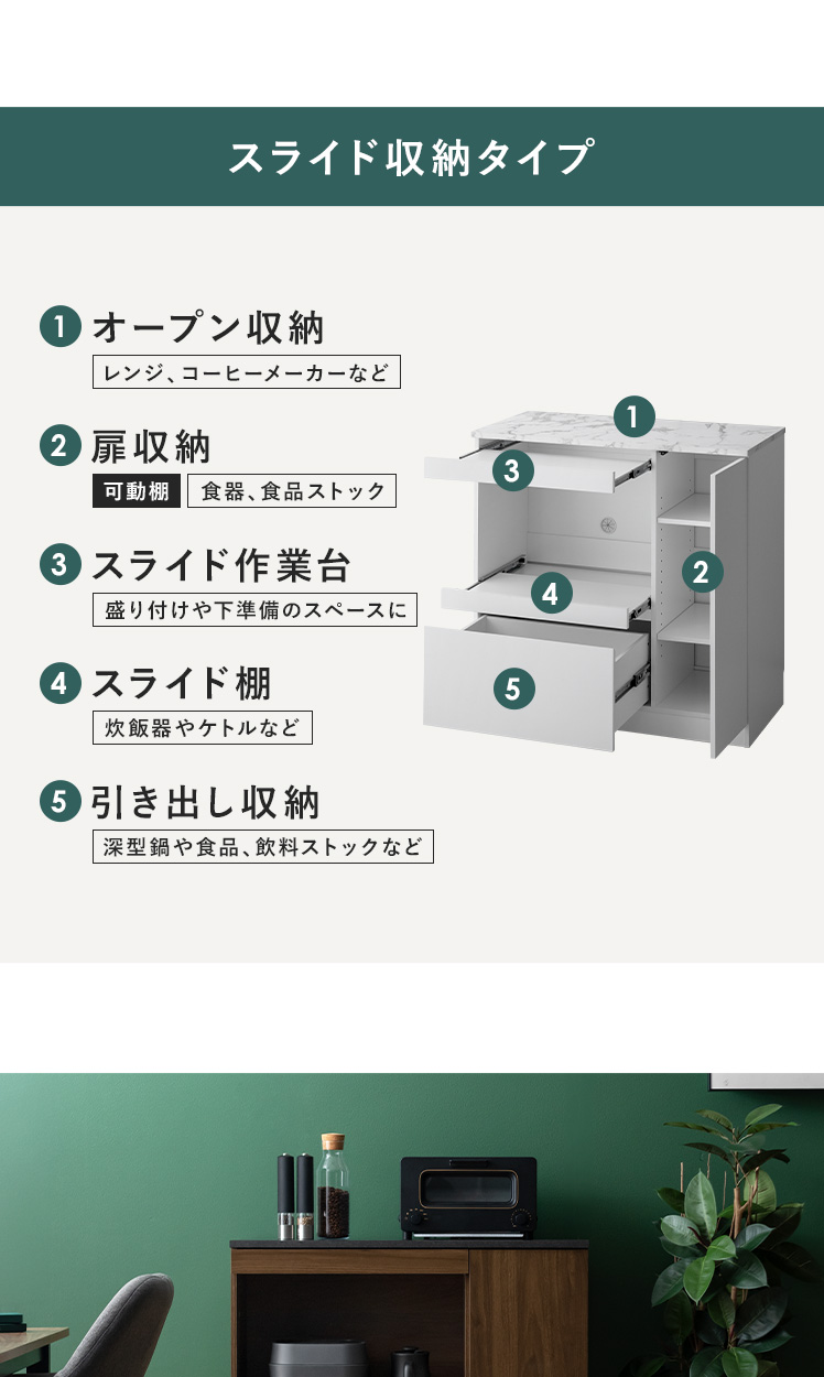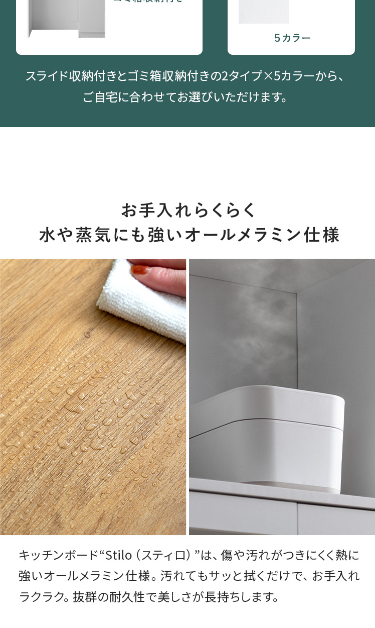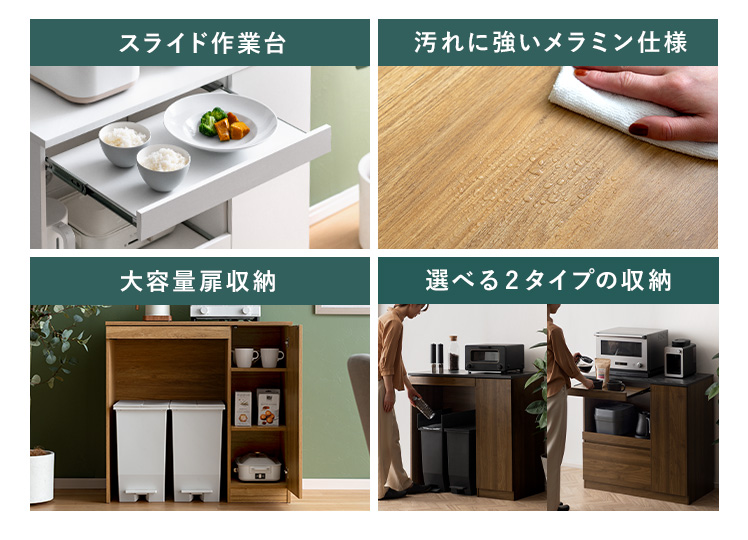 ゴミ箱収納付きキッチンボード Stilo〔スティロ〕 ロータイプ/ゴミ箱上のデッドスペースを大容量の収納スペースに。キッチン用品とゴミ箱をまるっと収納できる“Stilo(スティロ)”便利なスライド作業台つきで、スペース不足も解決。キッチンまわりがすっきり整い、料理もはかどる、理想のキッチンボードです。
