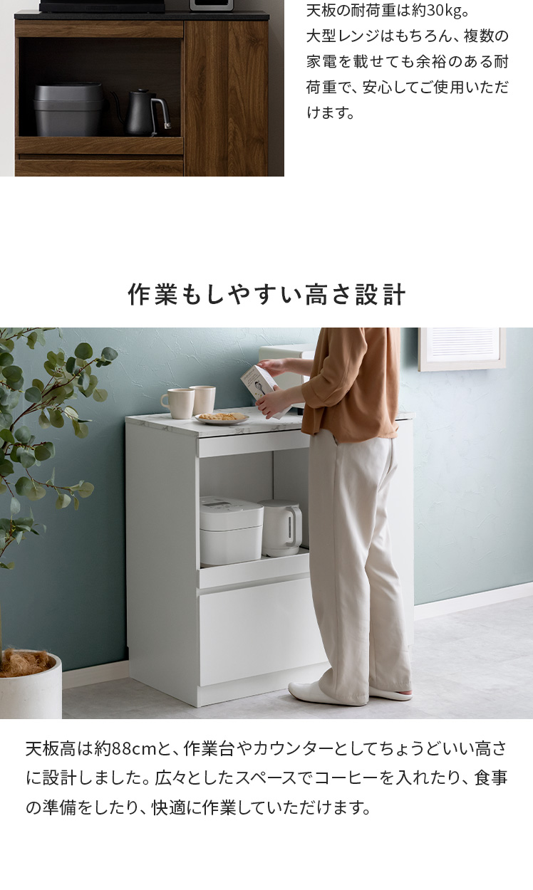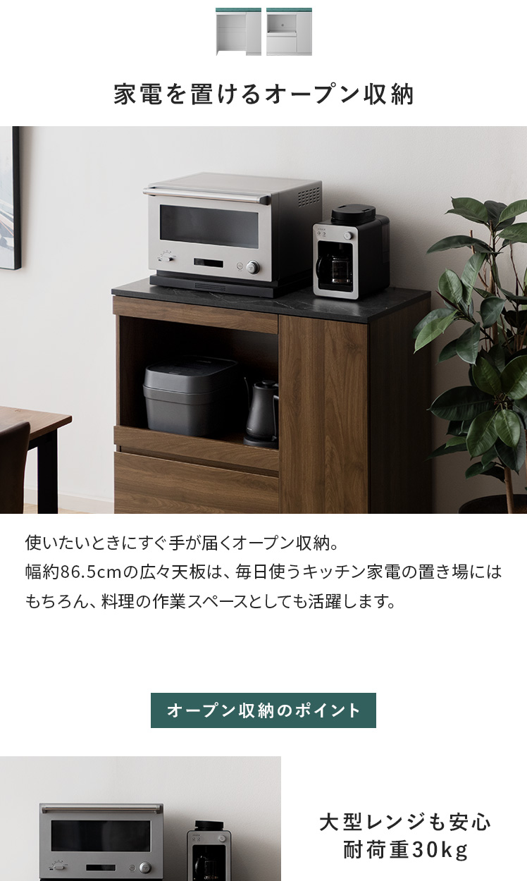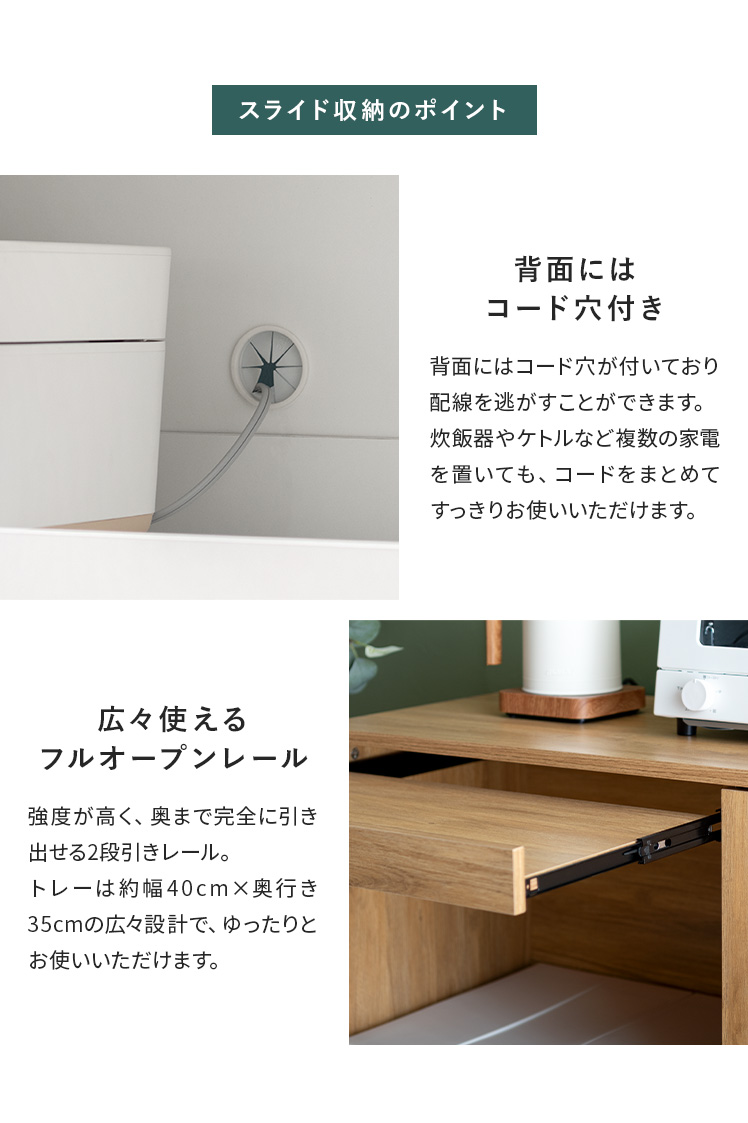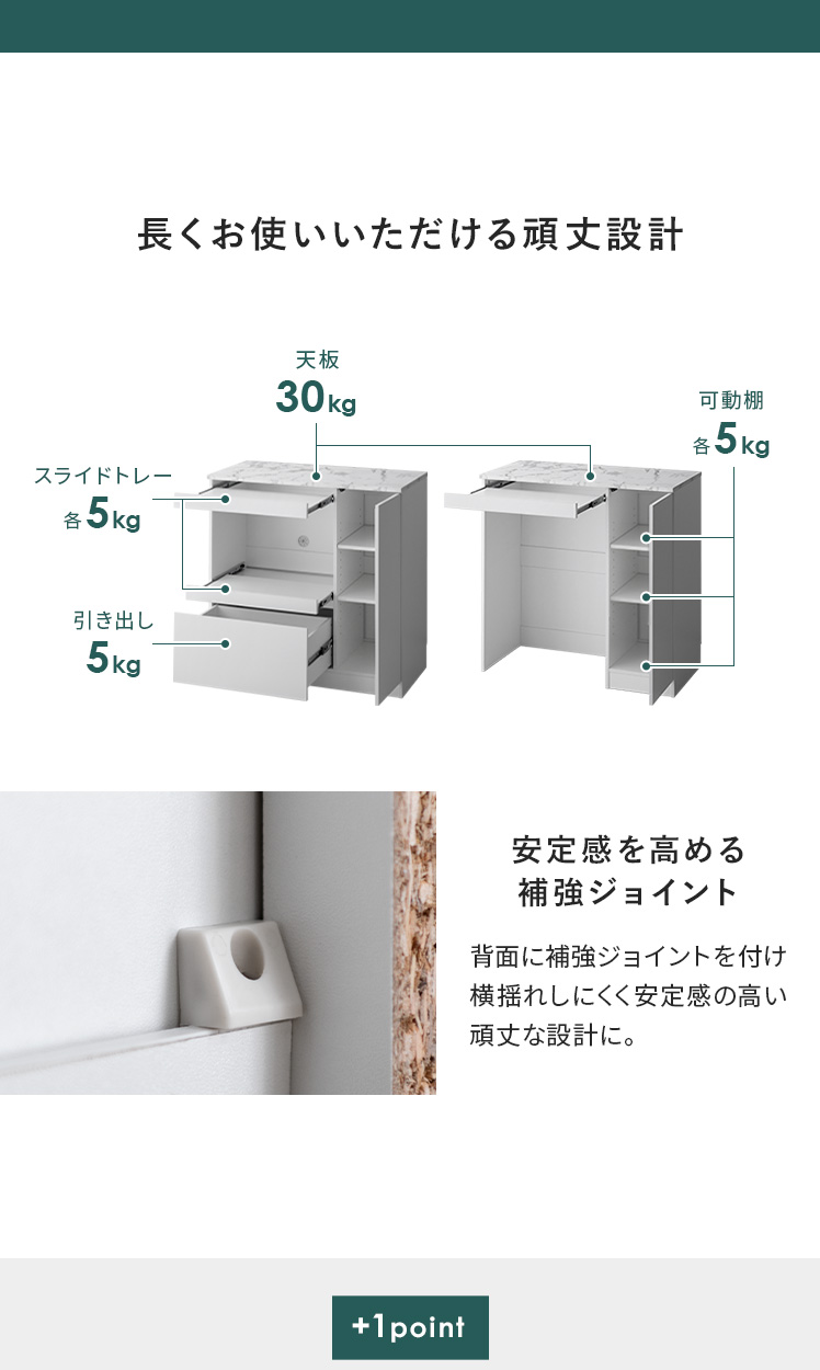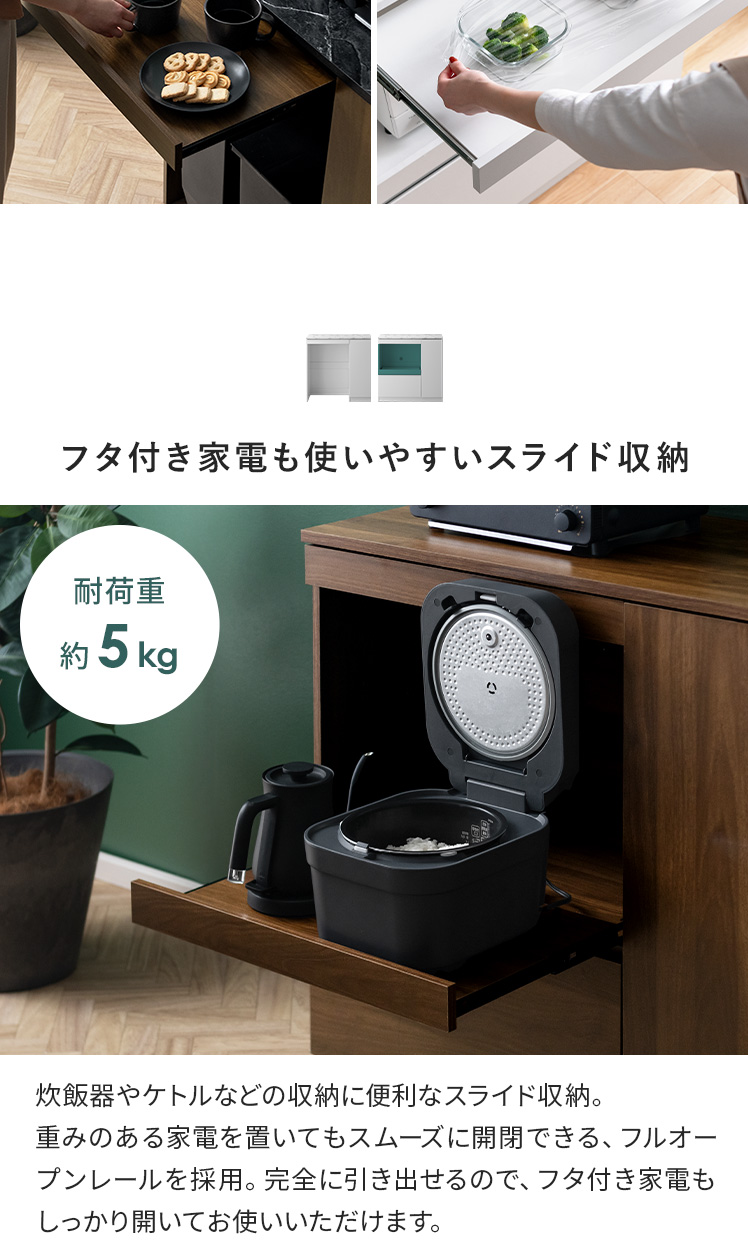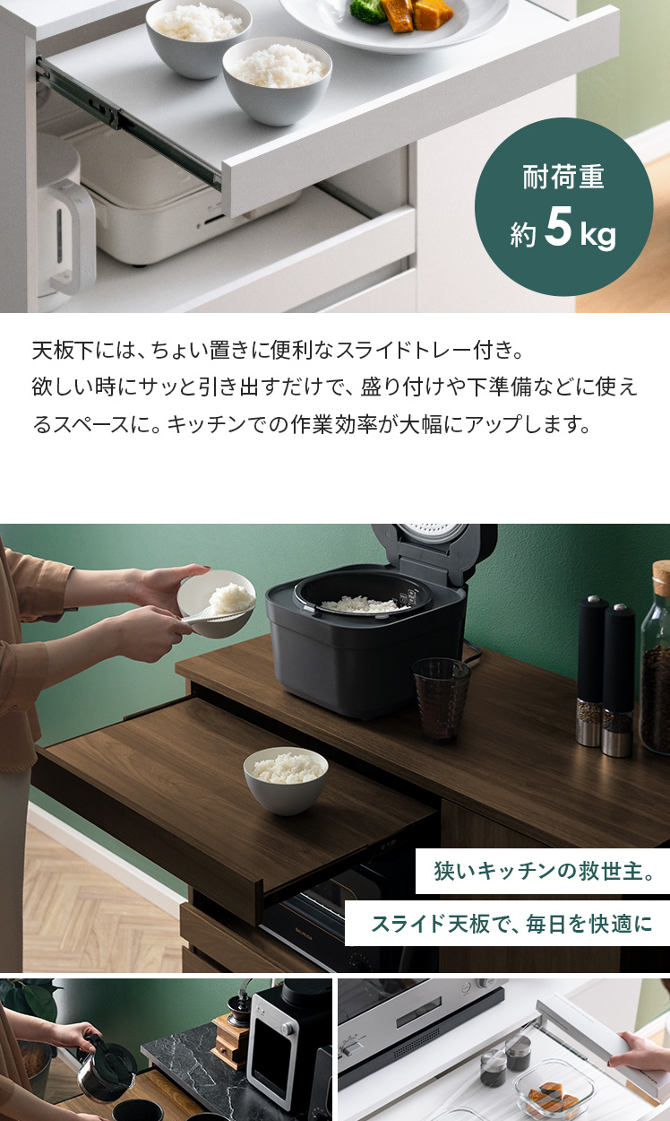 | 耐荷重 | 天板/約30kg、スライド棚/約5kg、可動棚/約5kg |