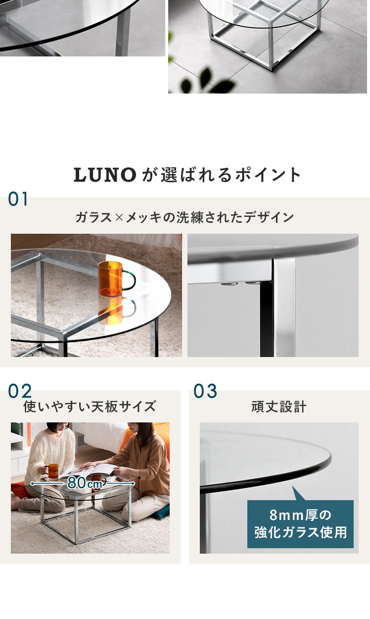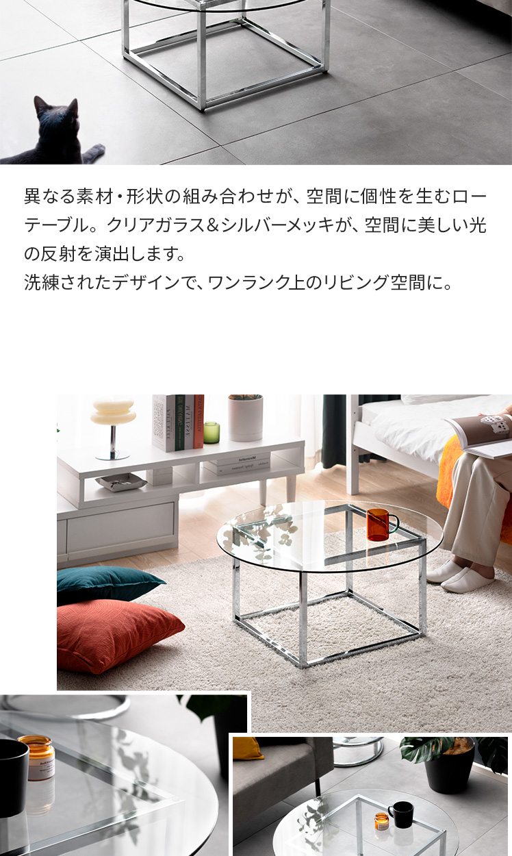 ガラステーブル LUNO〔ルーノ〕/異なる素材・形状の組み合わせが、空間に個性を生むローテーブル。クリアガラス&シルバーメッキが、空間に美しい光の反射を演出します。洗練されたデザインで、ワンランク上のリビング空間に。