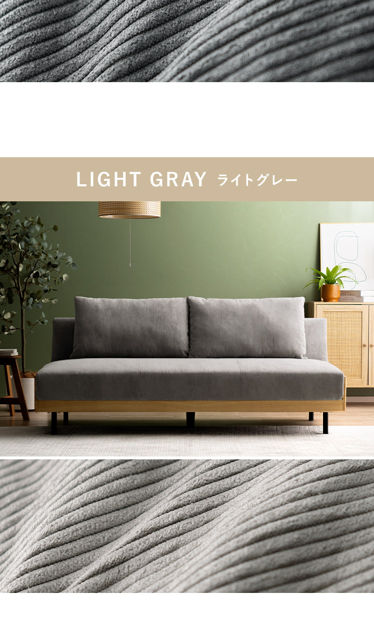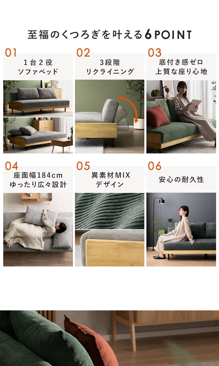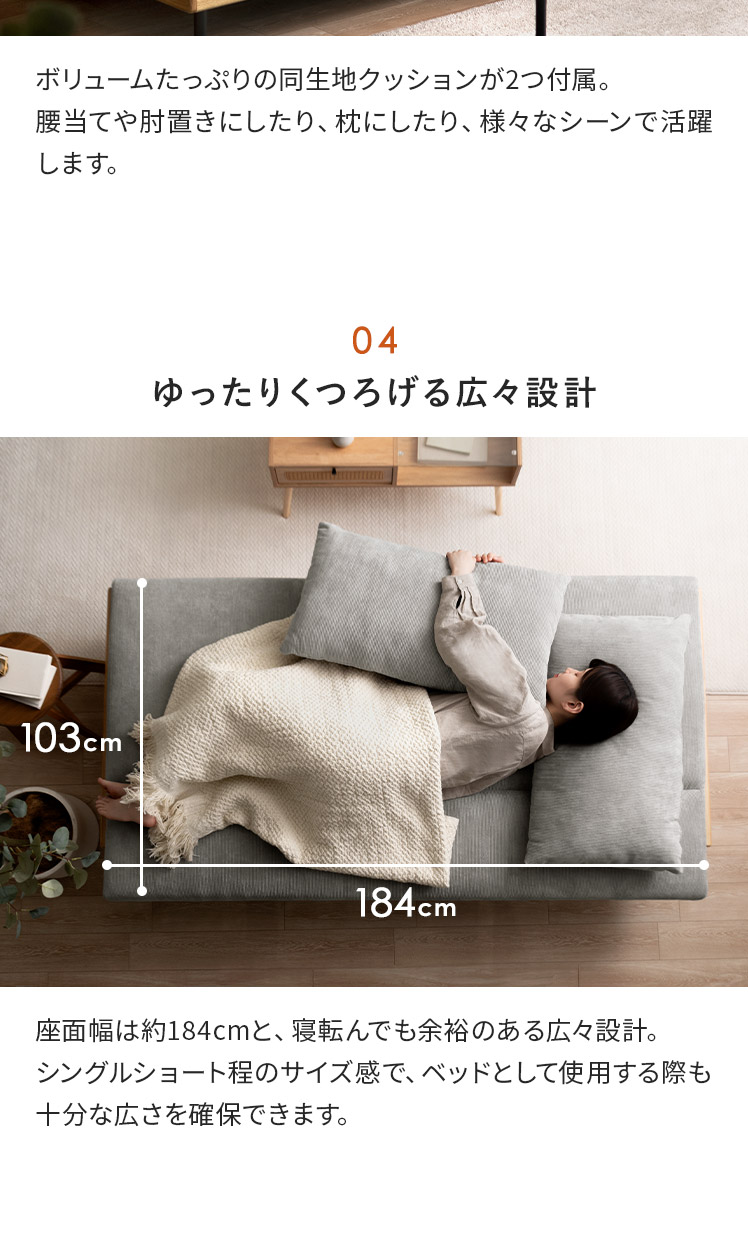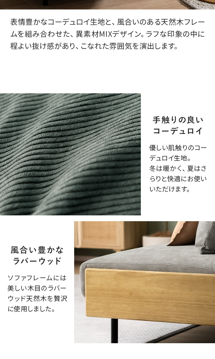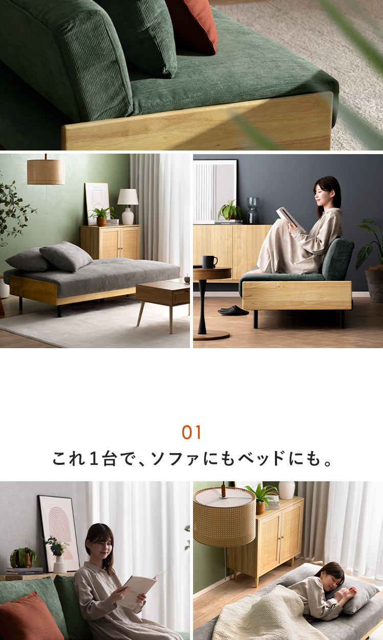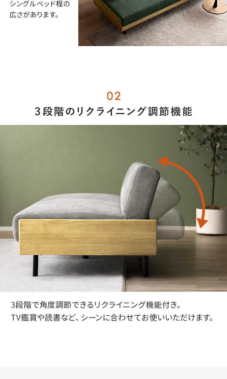 リクライニング機能付きソファベッド/3段階のリクライニング機能で自由なくつろぎを叶える、1台2役のソファベッド。コーデュロイの優しい肌触りと天然木のぬくもりが、心地よいリラックス空間を演出します。