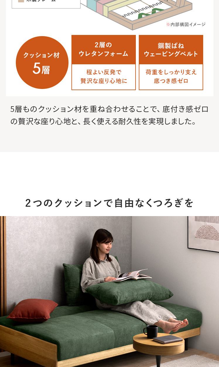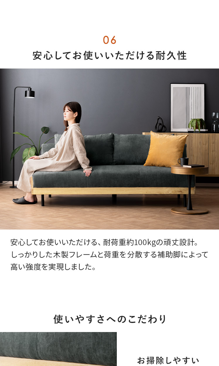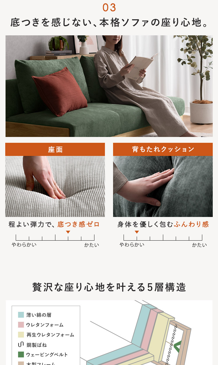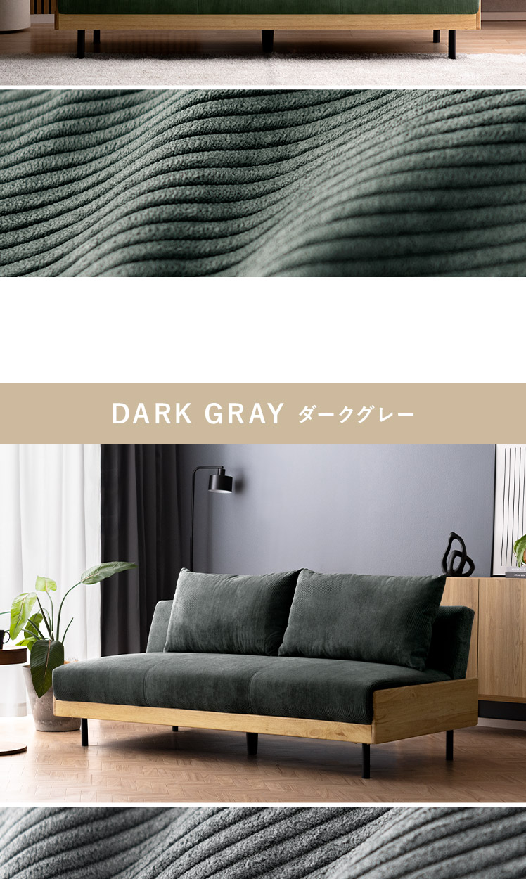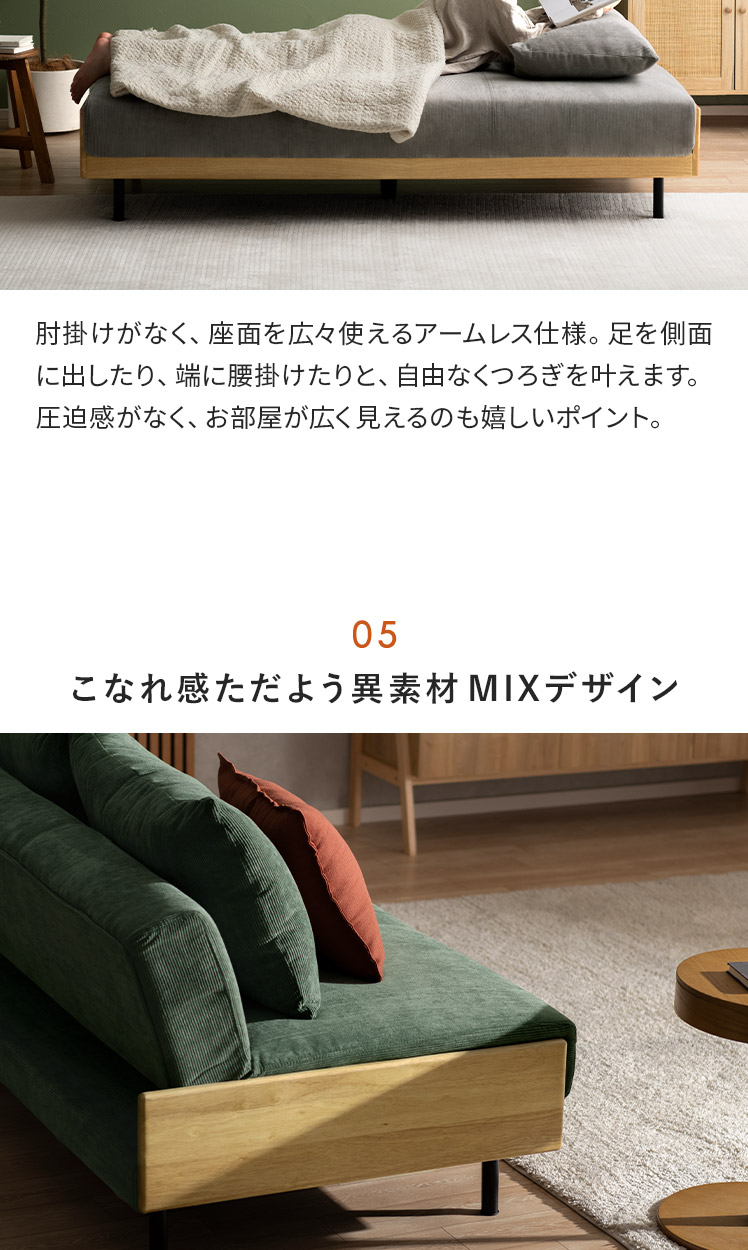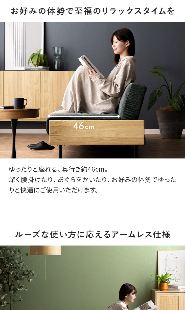 リクライニング機能付きソファベッド/3段階のリクライニング機能で自由なくつろぎを叶える、1台2役のソファベッド。コーデュロイの優しい肌触りと天然木のぬくもりが、心地よいリラックス空間を演出します。