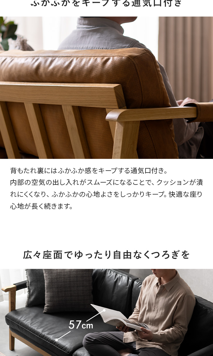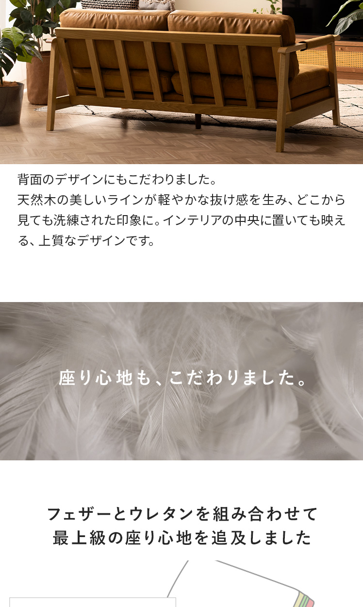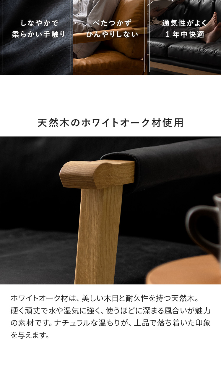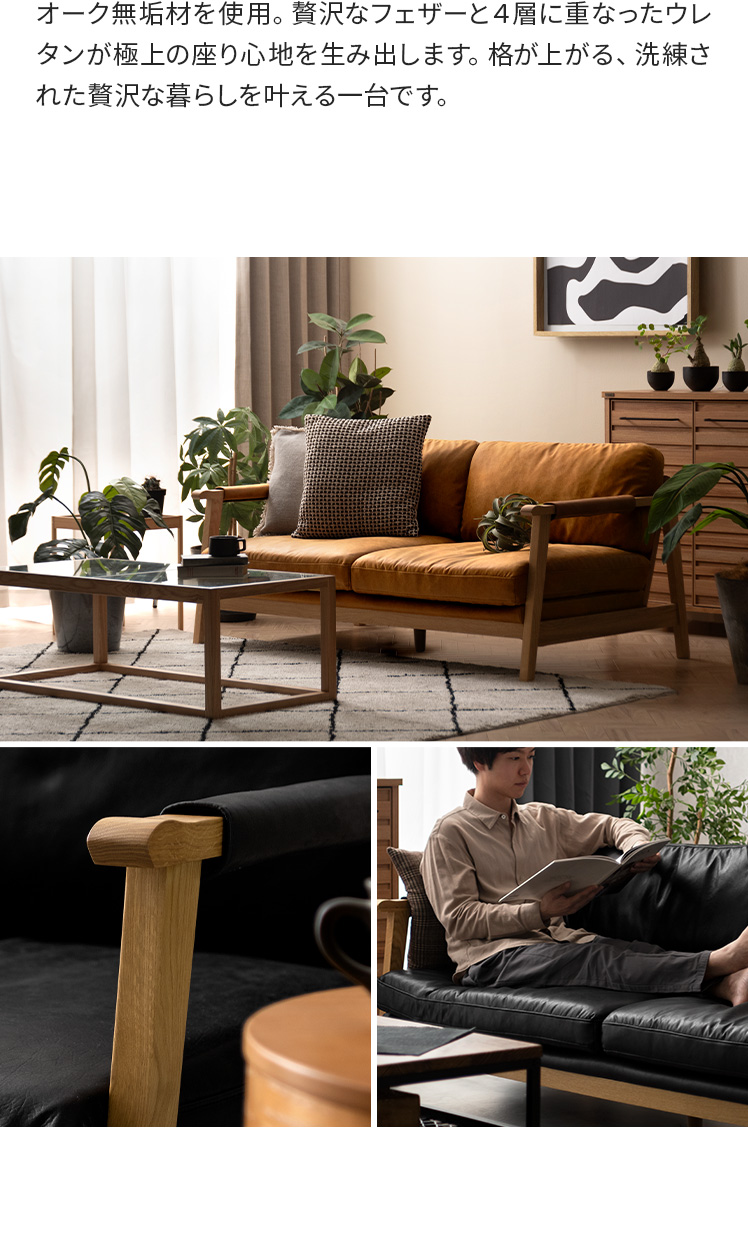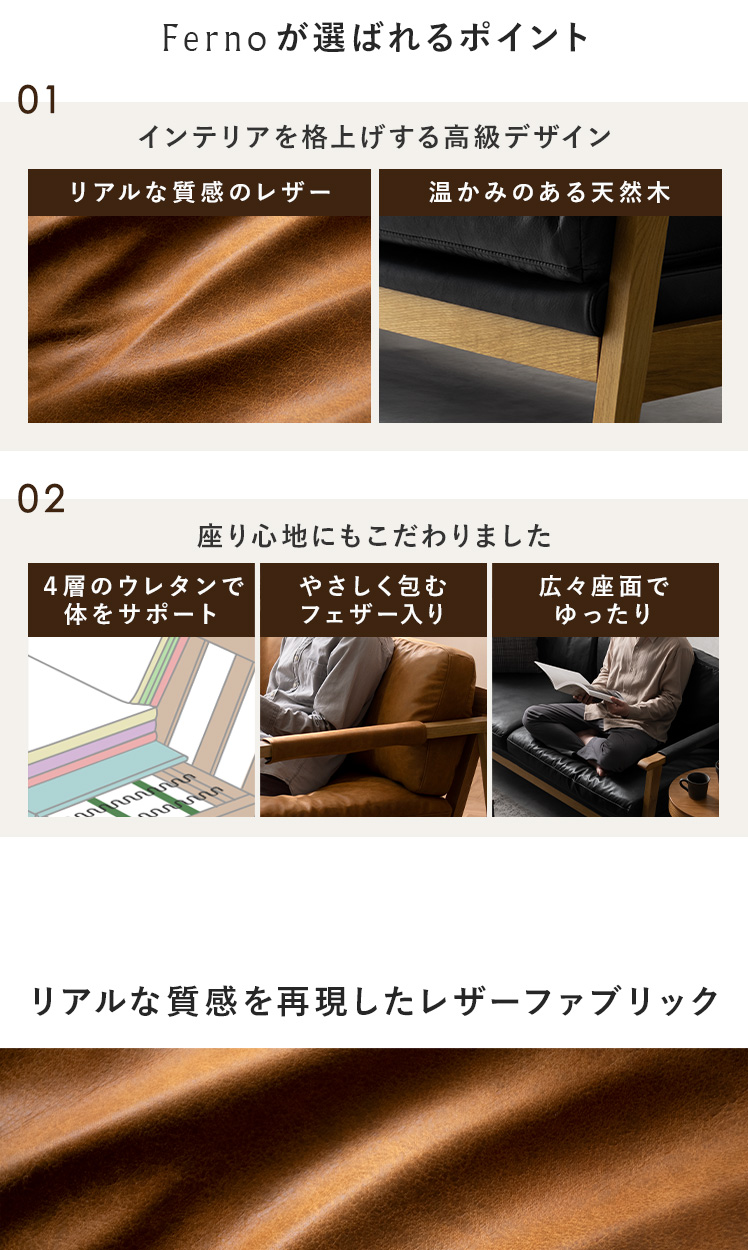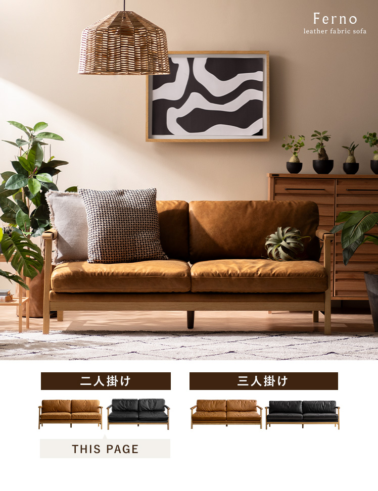 2Pレザーファブリックソファ FERNO〔フェルノ〕/本革のような上質なレザーファブリックに、やさしいホワイトオーク無垢材を使用。贅沢なフェザーと4層に重なったウレタンが極上の座り心地を生み出します。格が上がる、洗練された贅沢な暮らしを叶える一台です。