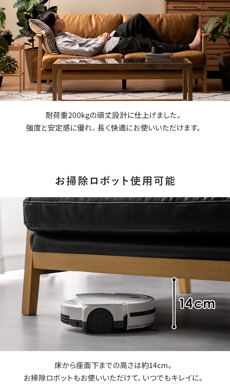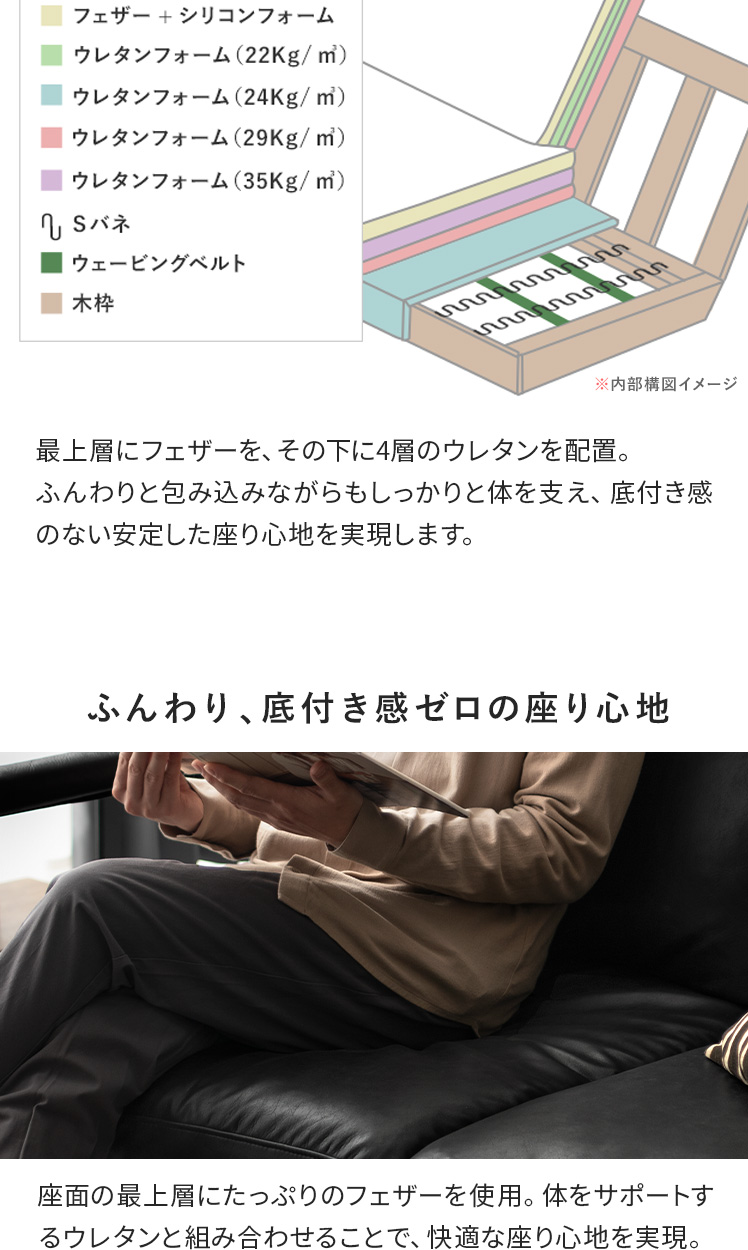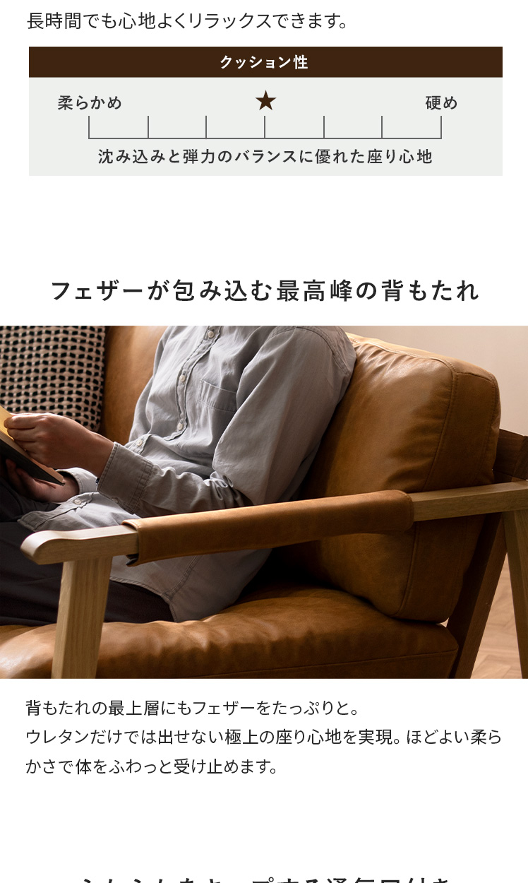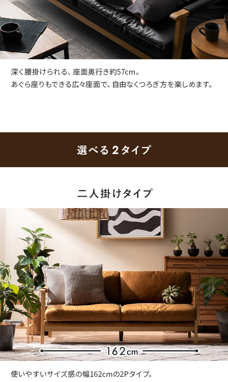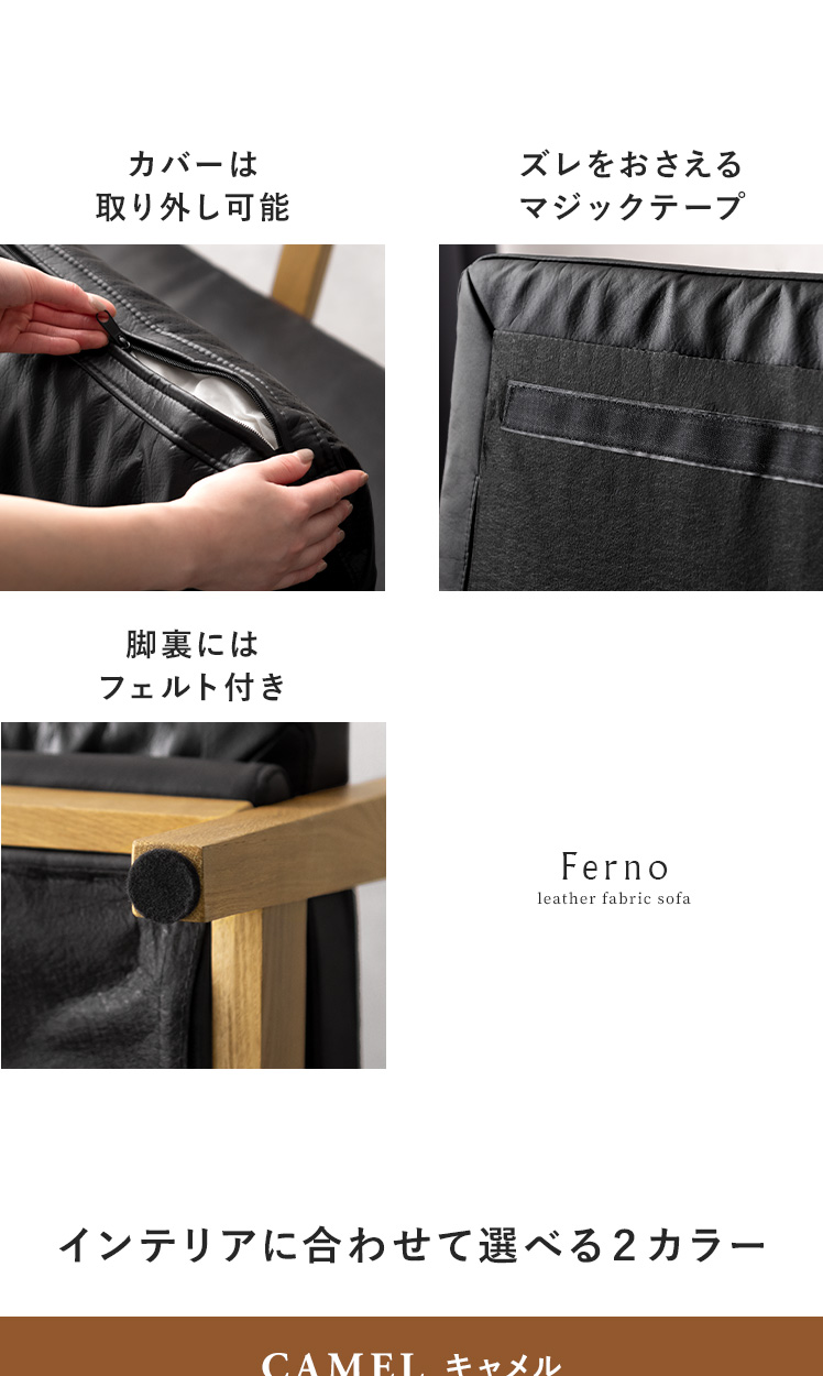 2Pレザーファブリックソファ FERNO〔フェルノ〕/本革のような上質なレザーファブリックに、やさしいホワイトオーク無垢材を使用。贅沢なフェザーと4層に重なったウレタンが極上の座り心地を生み出します。格が上がる、洗練された贅沢な暮らしを叶える一台です。