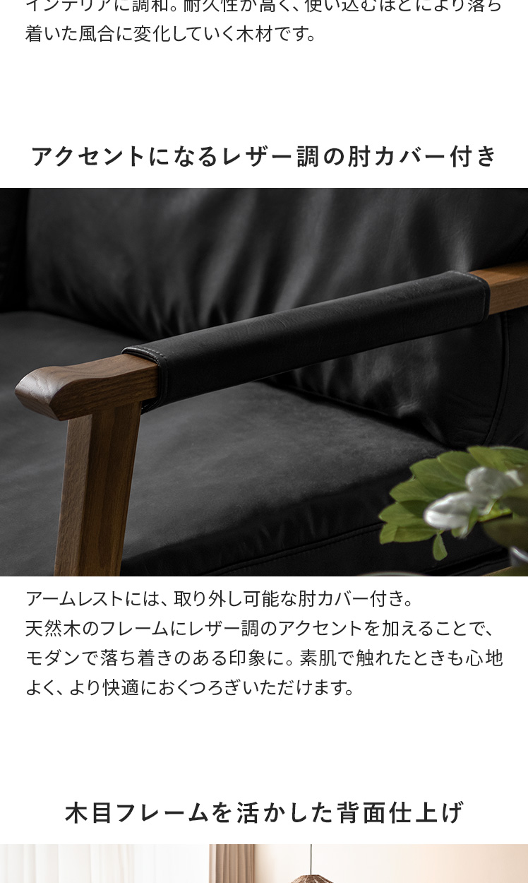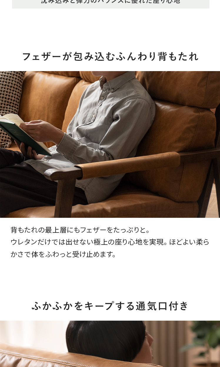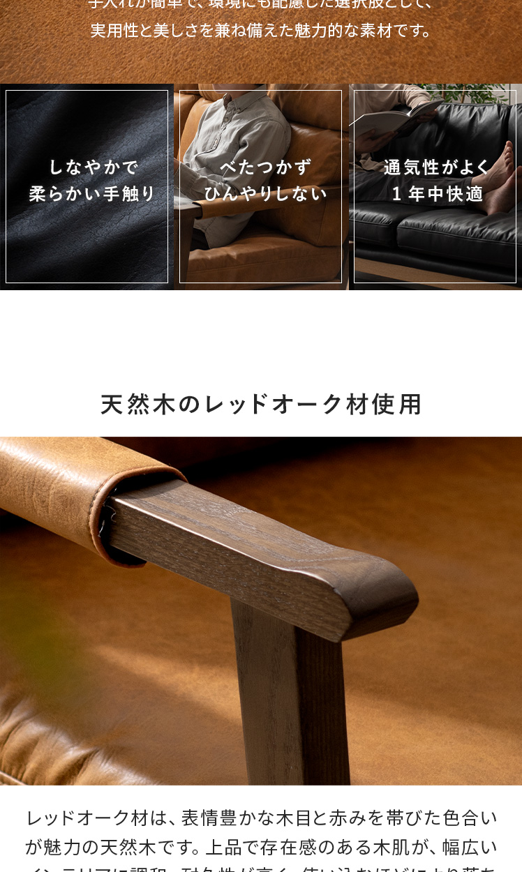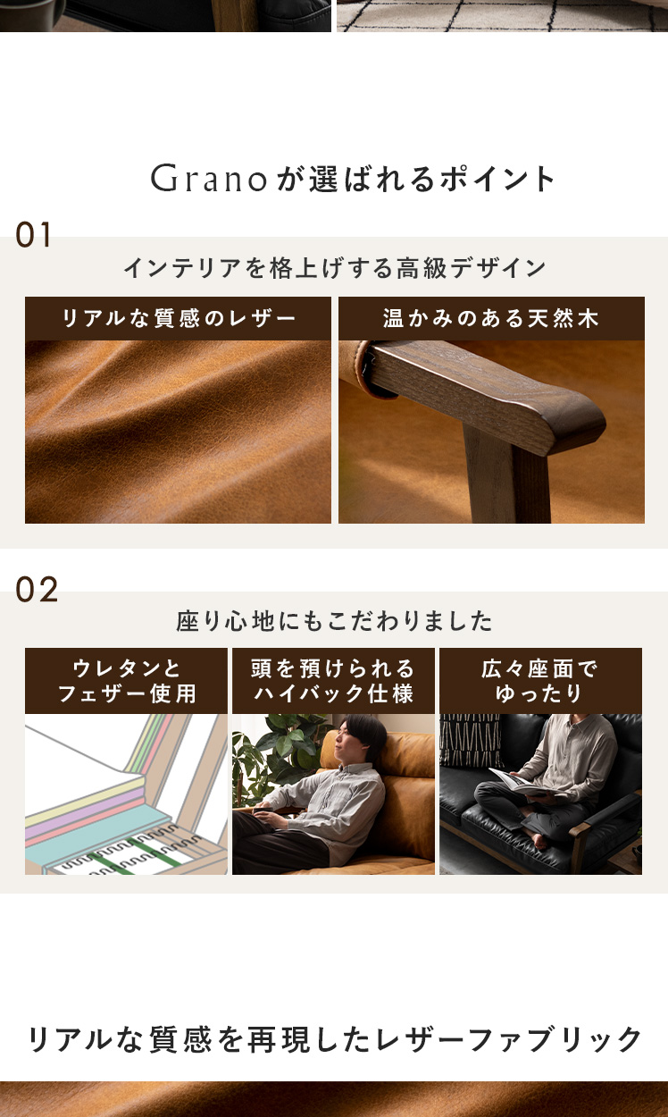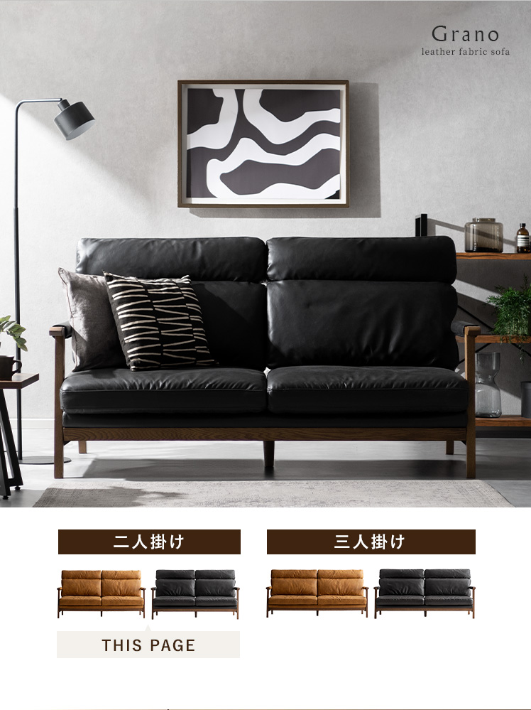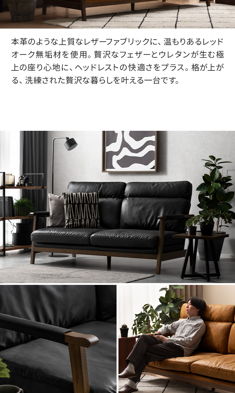 2Pハイバックレザーファブリックソファ GRANO〔グラノ〕/本革のような上質なレザーファブリックに、温もりあるレッドオーク無垢材を使用。贅沢なフェザーとウレタンが生む極上の座り心地に、ヘッドレストの快適さをプラス。格が上がる、洗練された贅沢な暮らしを叶える一台です。