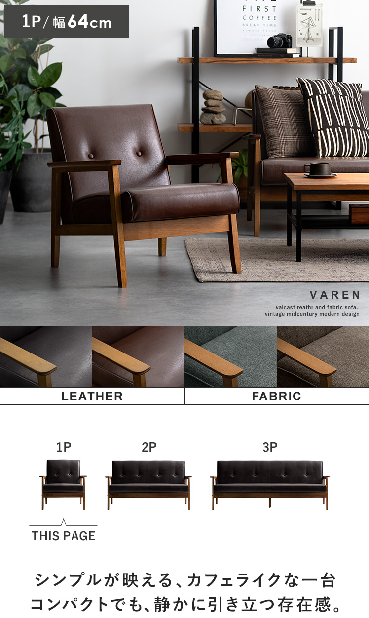 1人掛けソファ ミッドセンチュリー レトロ ビンテージ カフェテイスト シンプル モダン コンパクト レザー ファブリック 天然木 ブラウン グレー【5%OFFクーポン対象|公式なら毎日お得】