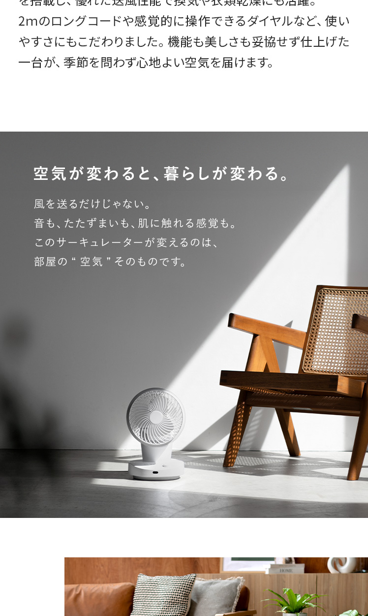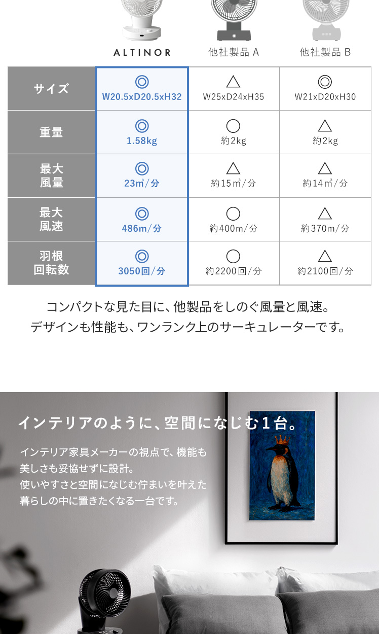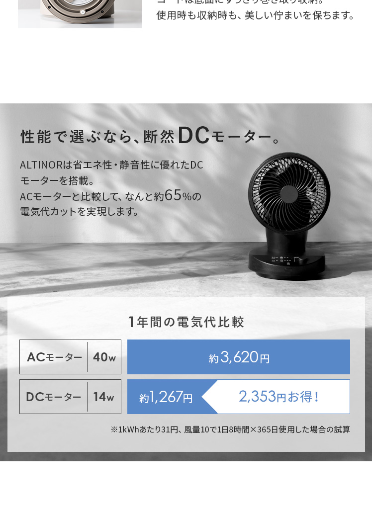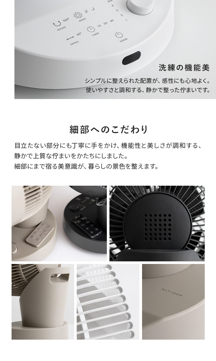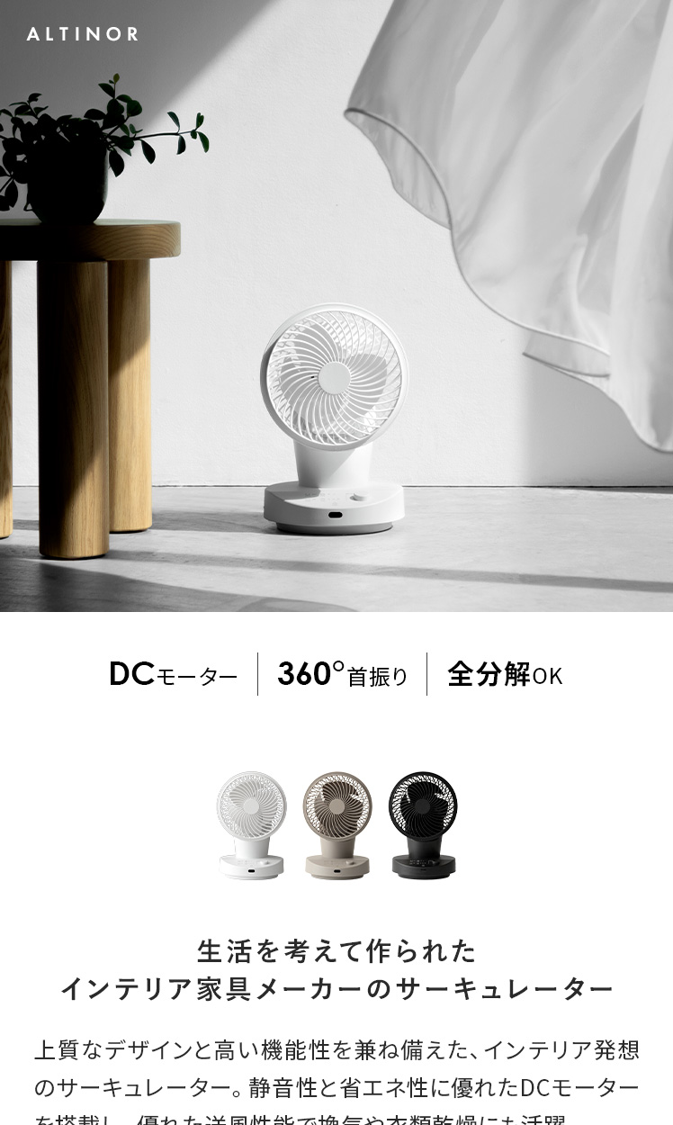 ALTINOR〔アルティノル〕 360°サーキュレーター/上質なデザインと高い機能性を兼ね備えた、インテリア発想のサーキュレーター。静音性と省エネ性に優れたDCモーターを搭載し、優れた送風性能で換気や衣類乾燥にも活躍。2mのロングコードや感覚的に操作できるダイヤルなど、使いやすさにもこだわりました。機能も美しさも妥協せず仕上げた一台が、季節を問わず心地よい空気を届けます。