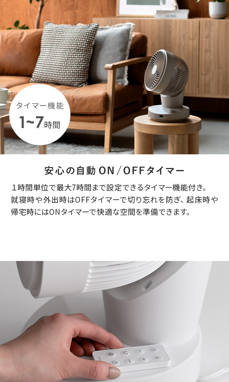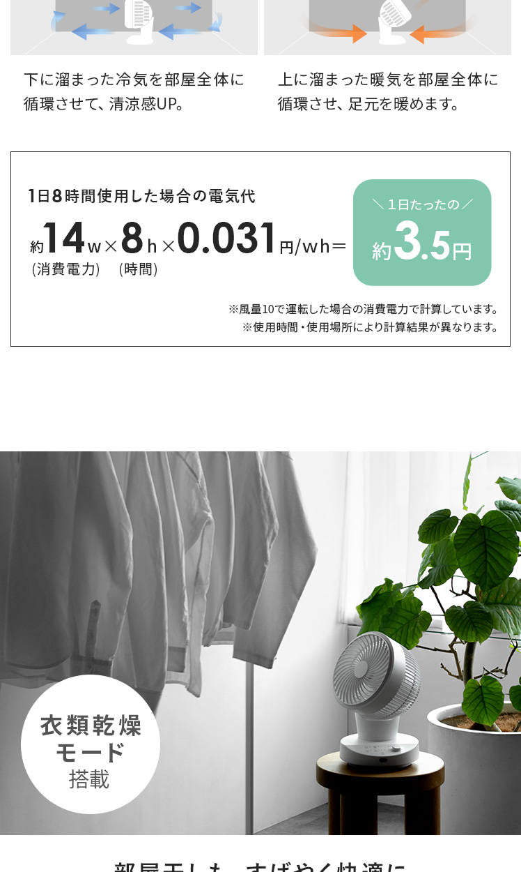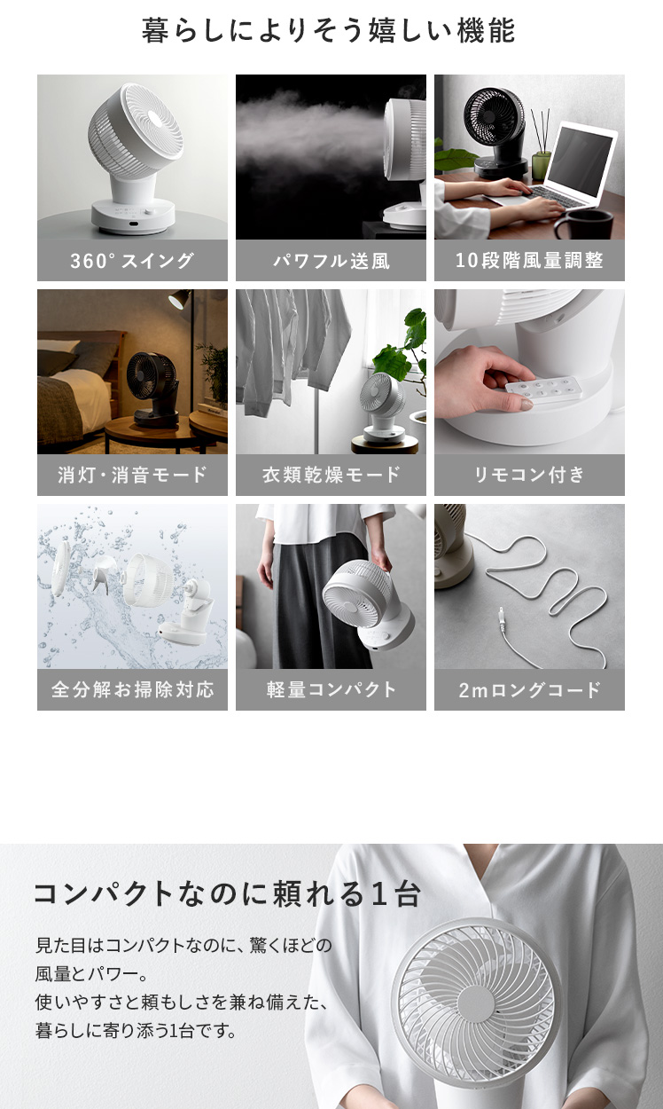 | 機能 | 360°首振り、スイング首振り、風量10段階調整、リズム・おやすみモード、 ON/OFFタイマー機能(1?7時間)、衣類乾燥モード |