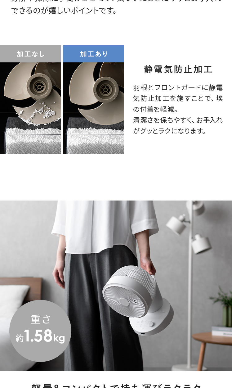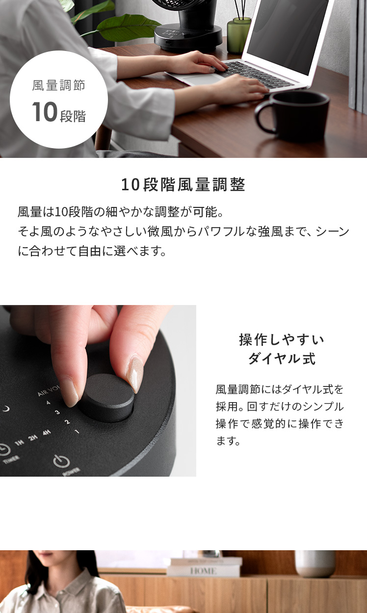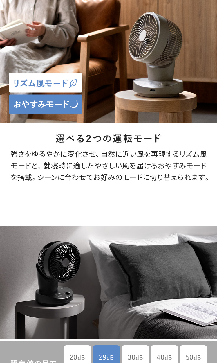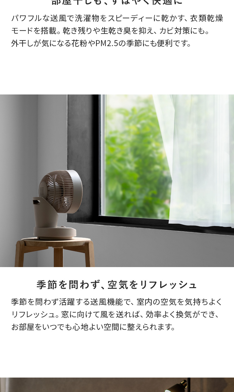 | 機能 | 360°首振り、スイング首振り、風量10段階調整、リズム・おやすみモード、 ON/OFFタイマー機能(1?7時間)、衣類乾燥モード |