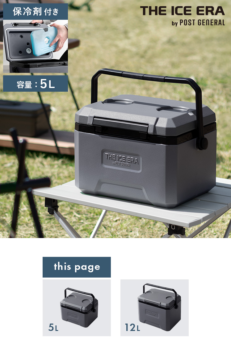 THE ICE ERA HARD-SHELL COOLER NEO 〔ジ アイスエラ ハードシェルクーラーネオ〕 5L/無骨でクールなアウトドアデザイン。ざらつきのあるシボ加工と立体ロゴがタフなアクセントに。保冷剤付きで長時間保冷が可能。ドリンク置き、滑り止め付きグリットも付いた、スタイルと機能性を両立した一台です。