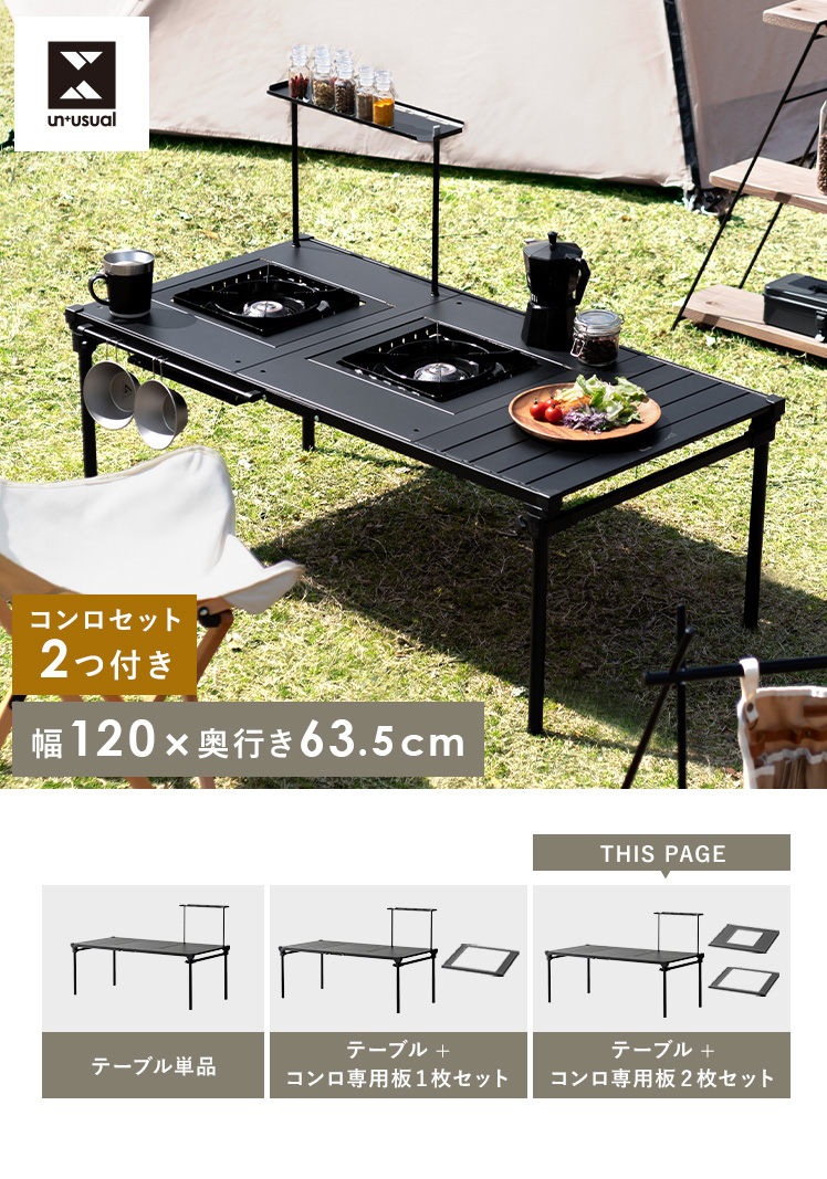 【セット】コンロが2つ置けるマルチテーブル テーブル+専用板2枚セット/キャンパーに人気の『タフまる/タフまるJr』がぴったり収まるマルチテーブル。コンロ2台設置OKで幅広い調理を楽しめます。専用板を外せばフラットにも使える2WAY仕様で、レイアウトも自由自在。ワンランク上の快適なキャンプを。