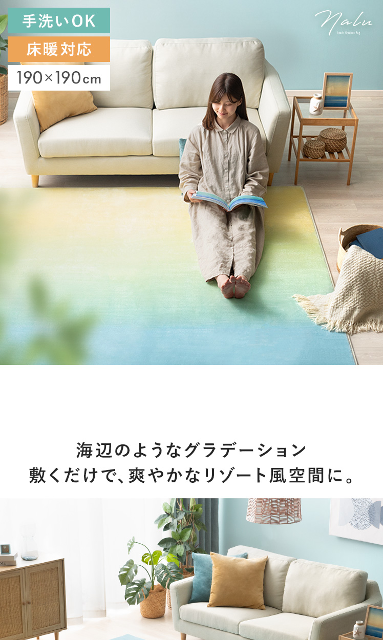 グラデーションラグ Nalu〔ナル〕190×190cm/日常にそっと、海風のような癒しを届けるラグ“Nalu(ナル)”敷くだけで、まるで海辺のリゾートにいるような心地よさ。やわらかに揺れる波のようなグラデーションが、お部屋を明るく華やかに彩ります。
