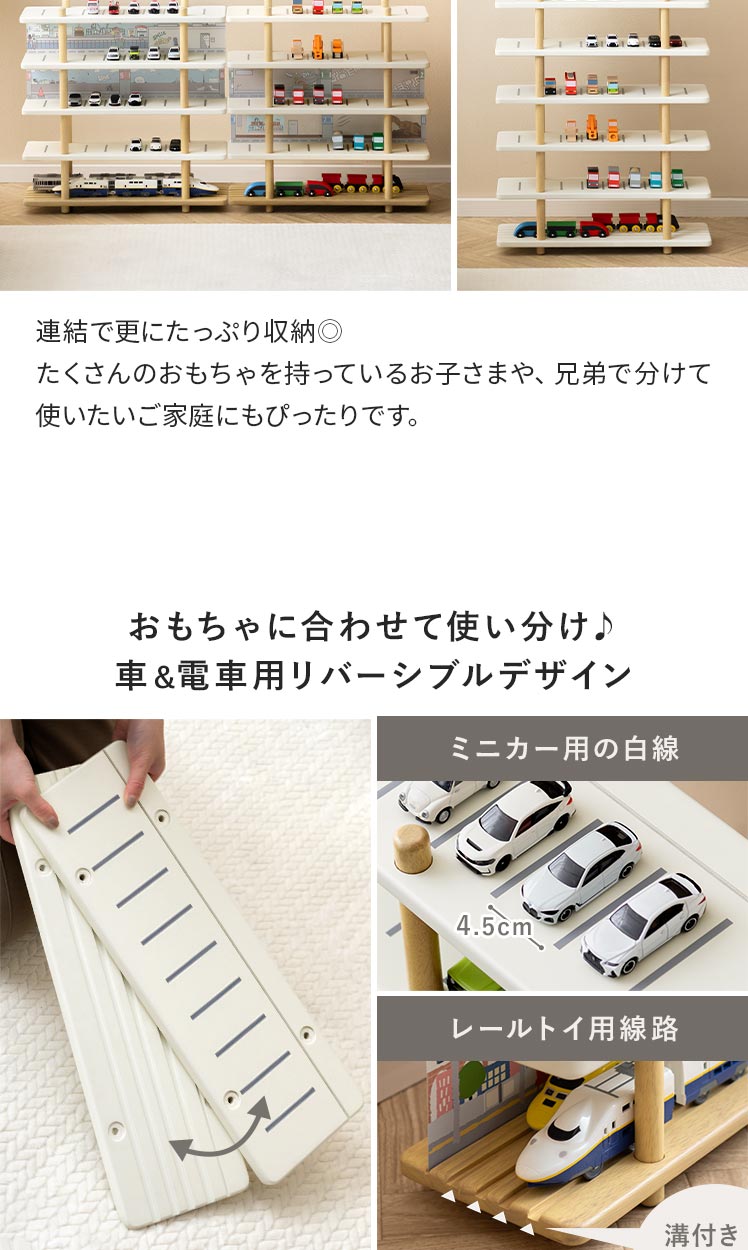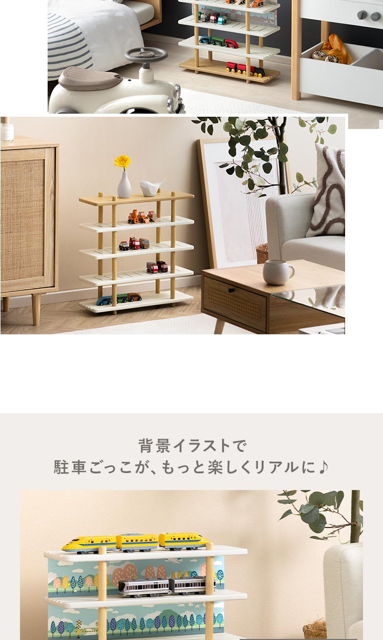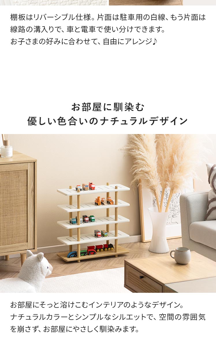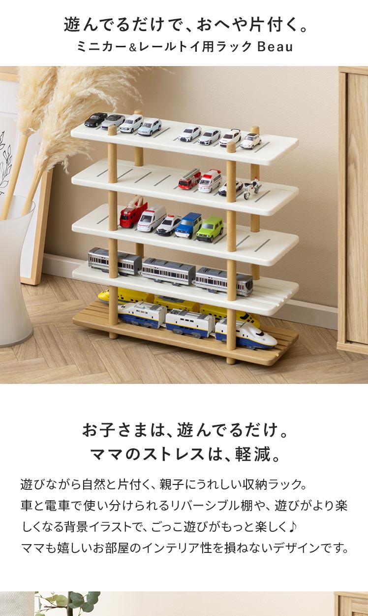 ミニカー&レールトイラック Beau〔ボウ〕/遊びながら自然と片付く、親子にうれしい収納ラック。車と電車で使い分けられるリバーシブル棚や、遊びがより楽しくなる背景イラストで、ごっこ遊びがもっと楽しく♪ママも嬉しいお部屋のインテリア性を損ねないデザインです。
