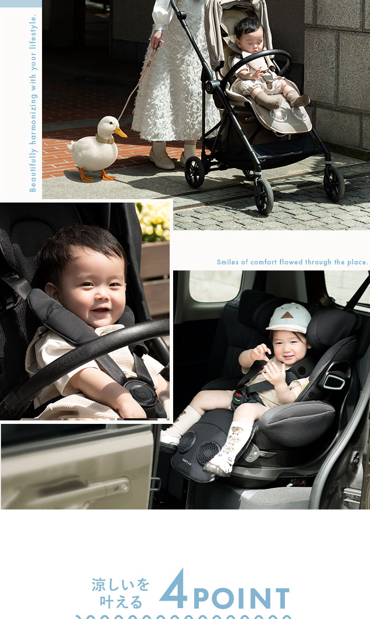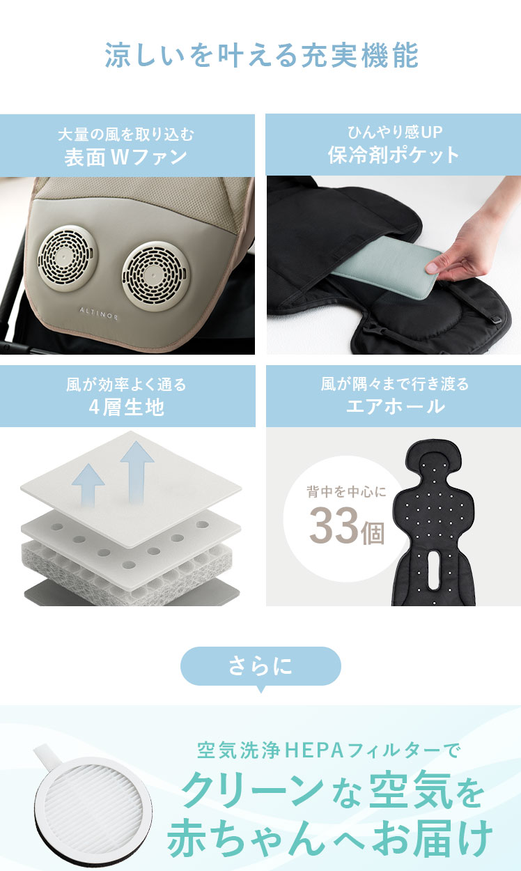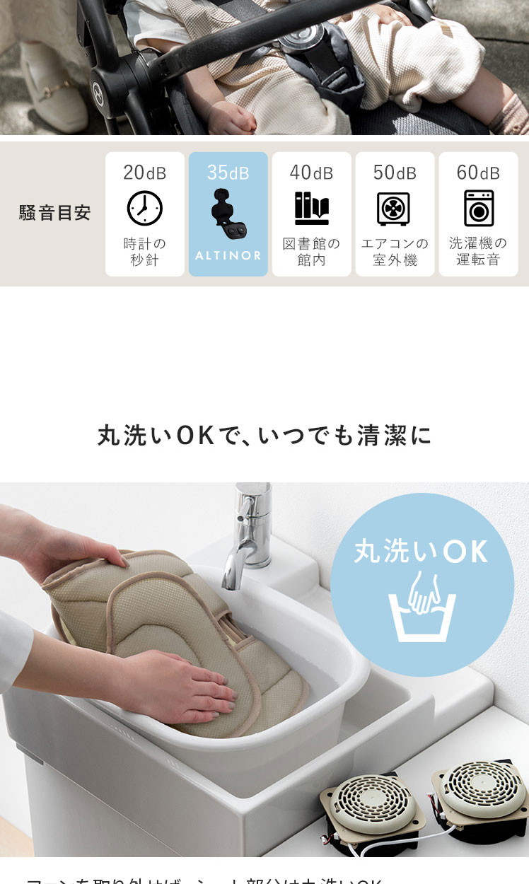 ALTINOR〔アルティノル〕 Wファン搭載ベビーシート本体/お出かけをもっと快適に。赤ちゃんへのやさしさを一番に考えた機能と、日常にすっと溶け込むデザインで、毎日に、やさしく、心地よく馴染みます。心地よい風で思わずスヤスヤ、ママも嬉しいひと時を。