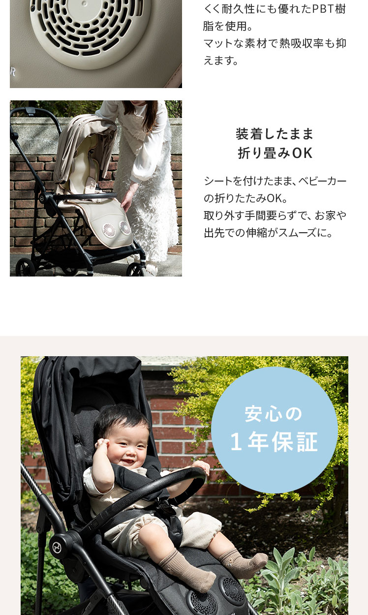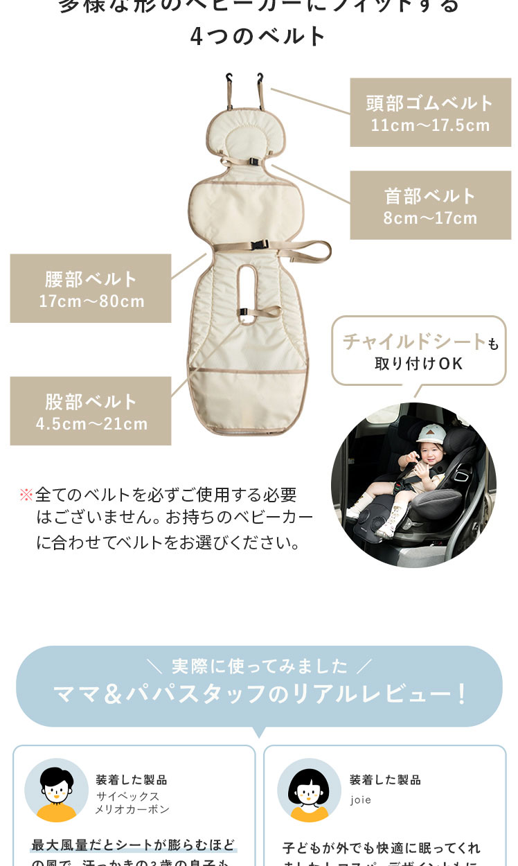 | 備考 | 完成品 1年保証(消耗品および付属品は除く) ※若干の個体差により、表記サイズと多少の差異が生じる場合がございます。 ※ベルトは必ず全てご使用する必要はございません。お手持ちのベビーカーやチャイルドシートに合わせてベルトをお選びください。 |
