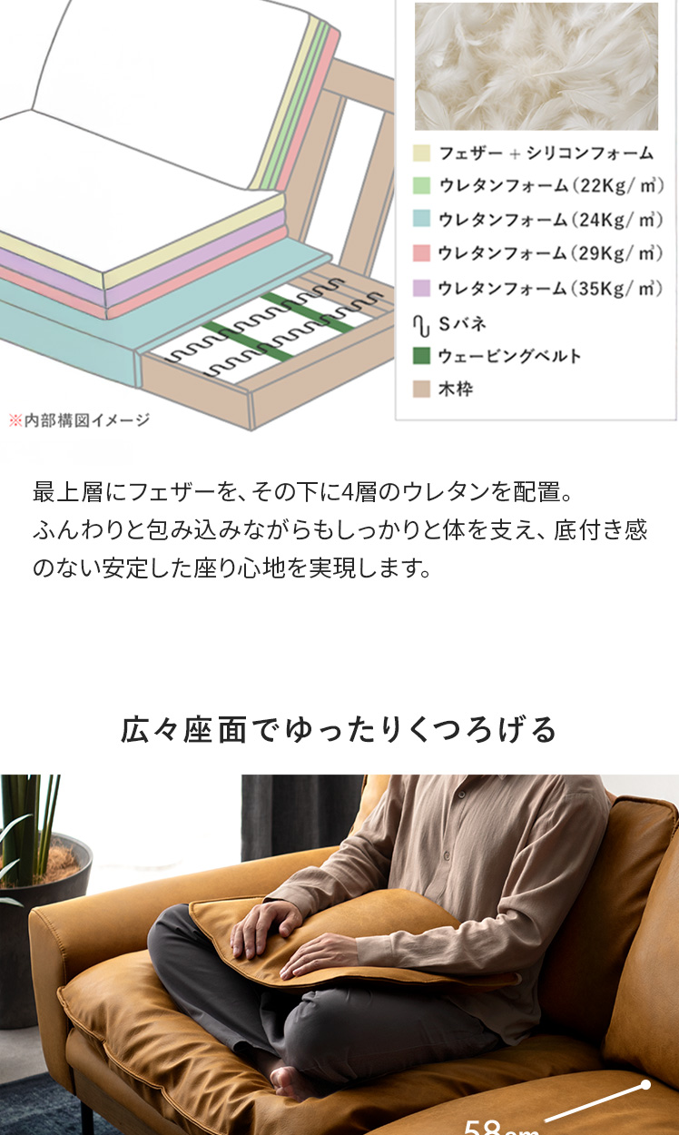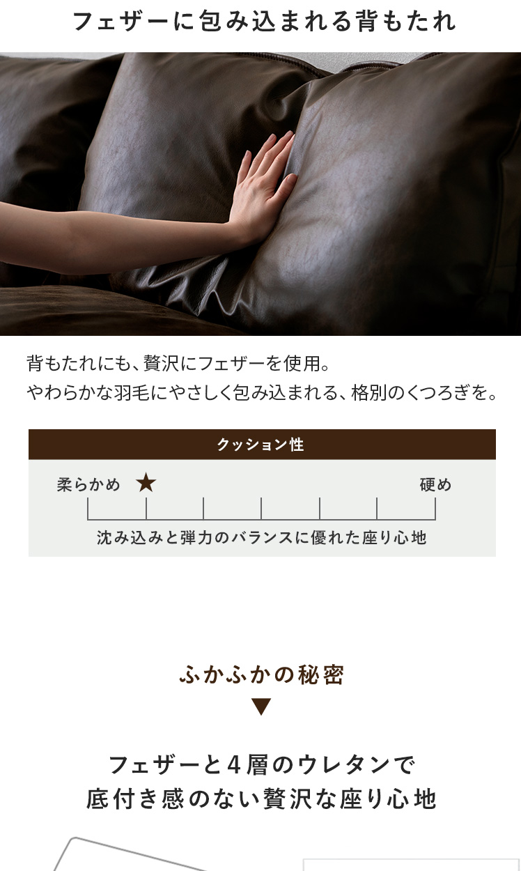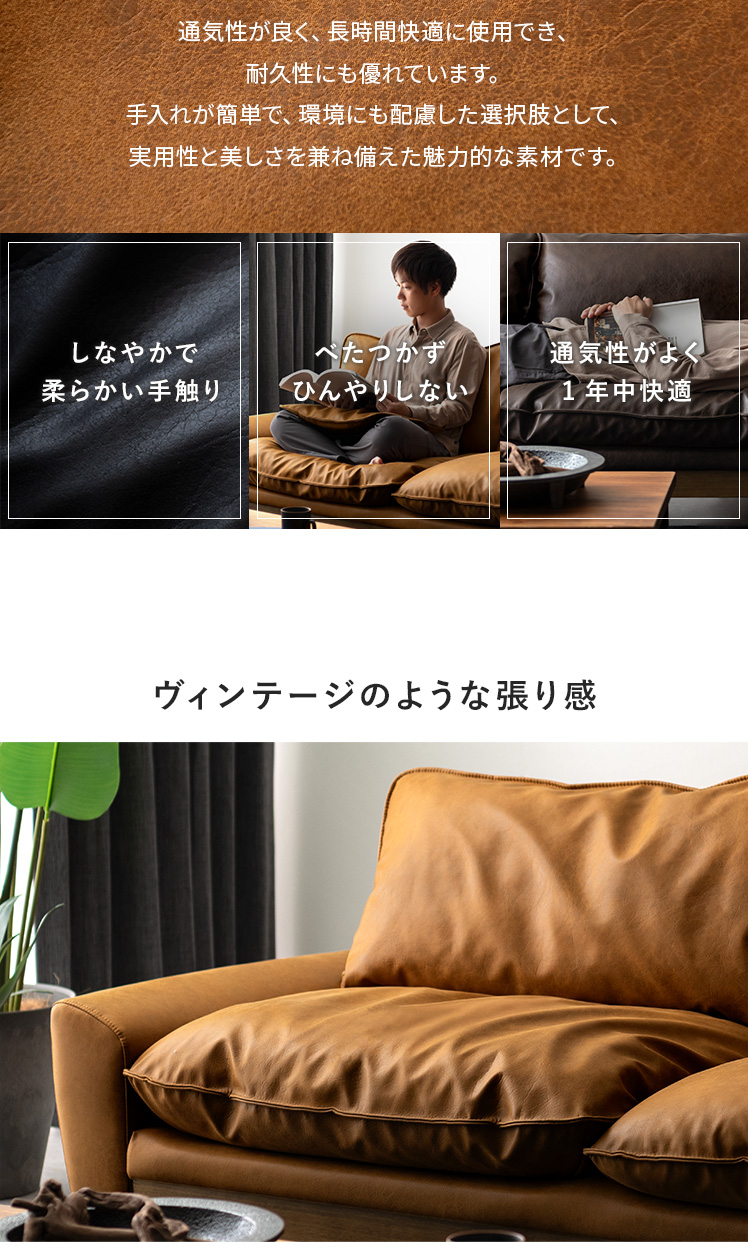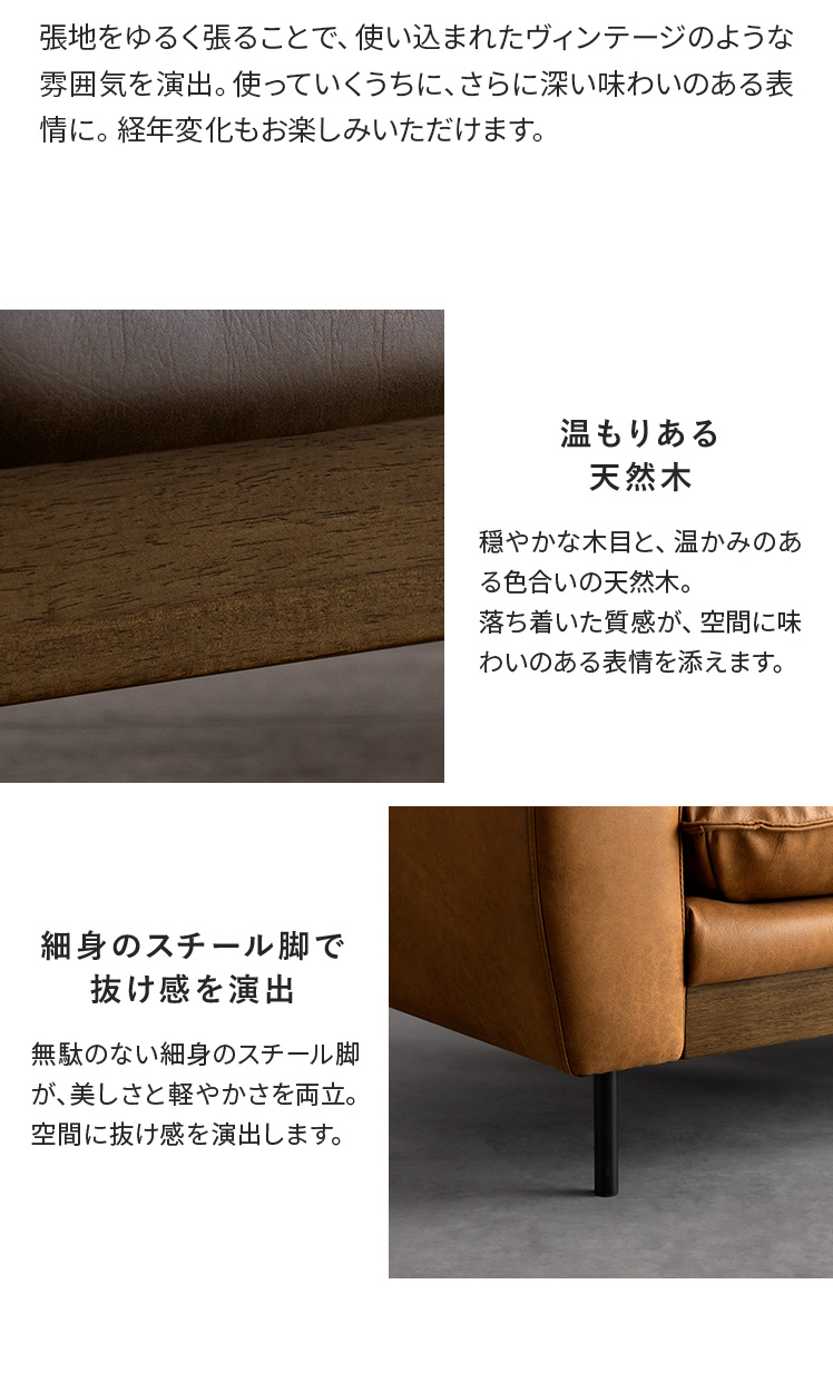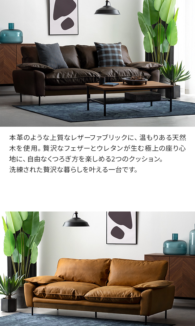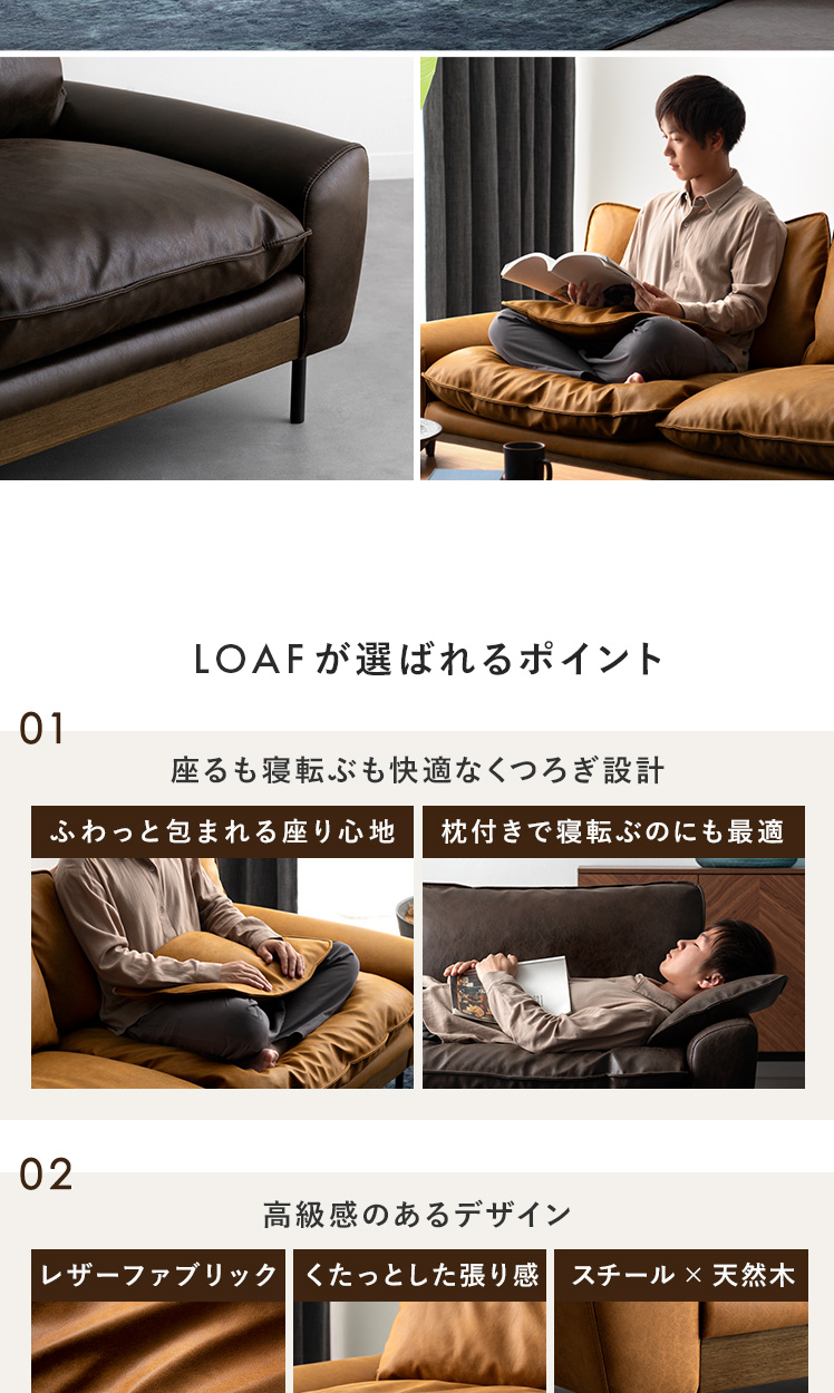 3Pレザーファブリックソファ LOAF〔ローフ〕/本革のような上質なレザーファブリックに、温もりある天然木を使用。贅沢なフェザーとウレタンが生む極上の座り心地に、自由なくつろぎ方を楽しめる2つのクッション。洗練された贅沢な暮らしを叶える一台です。