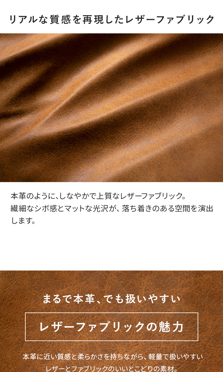 | 材質 | 張地/レザーファブリック、クッション材/フェザー・ウレタンフォーム 脚部/天然木、スチール |