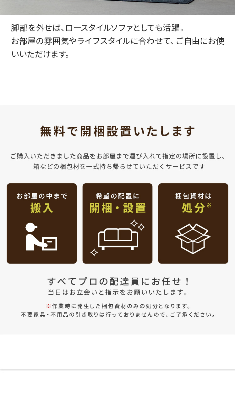 | 備考 | 完成品(脚部のみお客様取り付け)、クッション2個付属 ※若干の個体差により、表記サイズと多少の差異が生じる場合がございます。 |