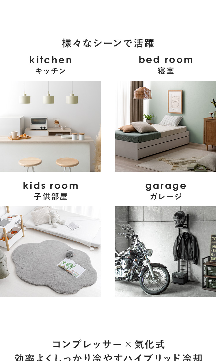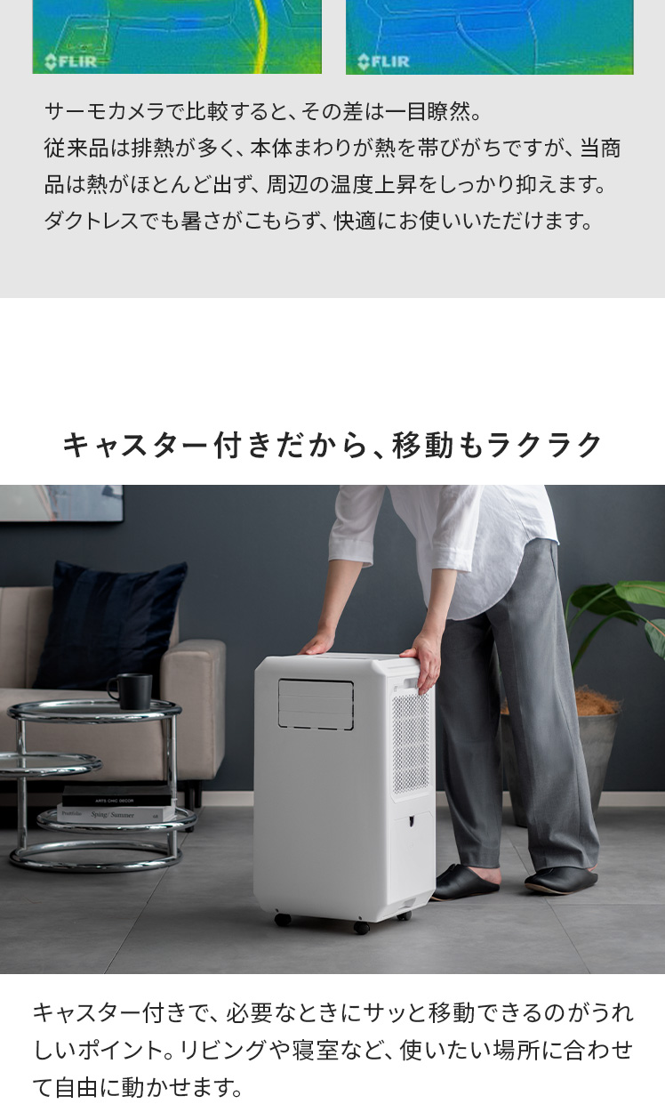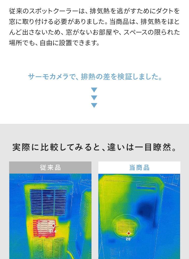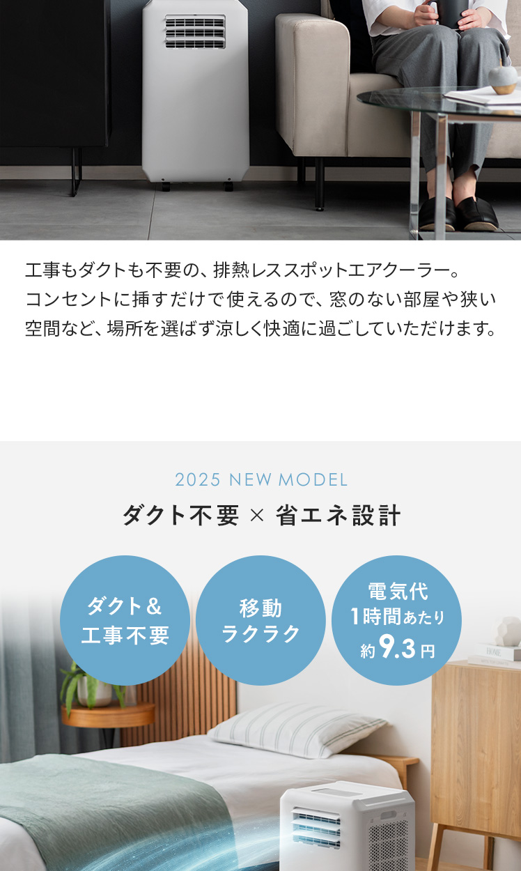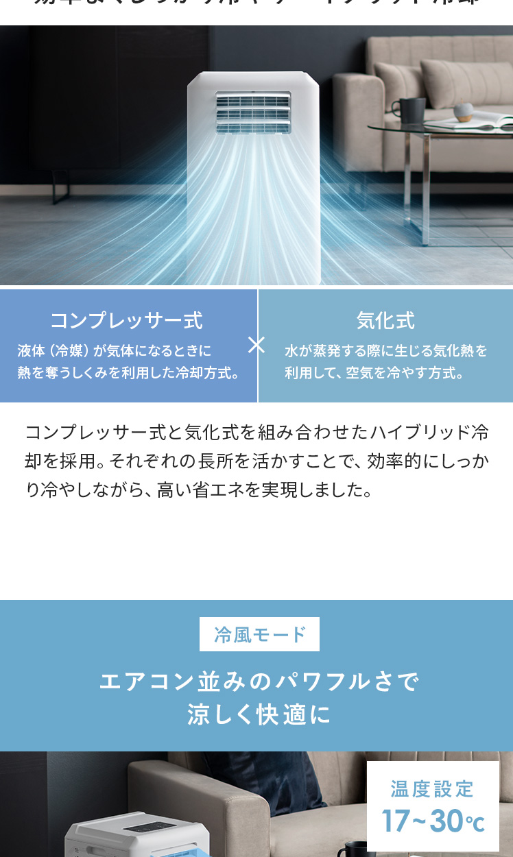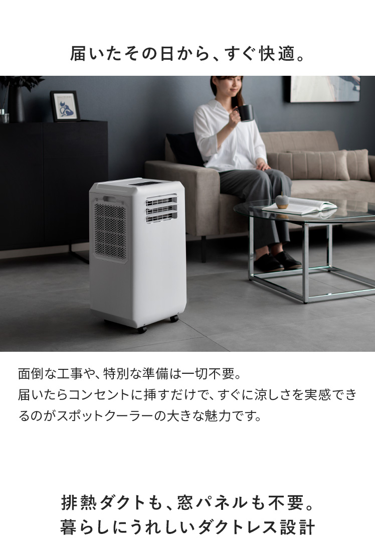 ハイブリッド式ダクトレス スポットエアクーラー/工事もダクトも不要の、排熱レススポットエアクーラー。コンセントに挿すだけで使えるので、窓のない部屋や狭い空間など、場所を選ばず涼しく快適に過ごしていただけます。