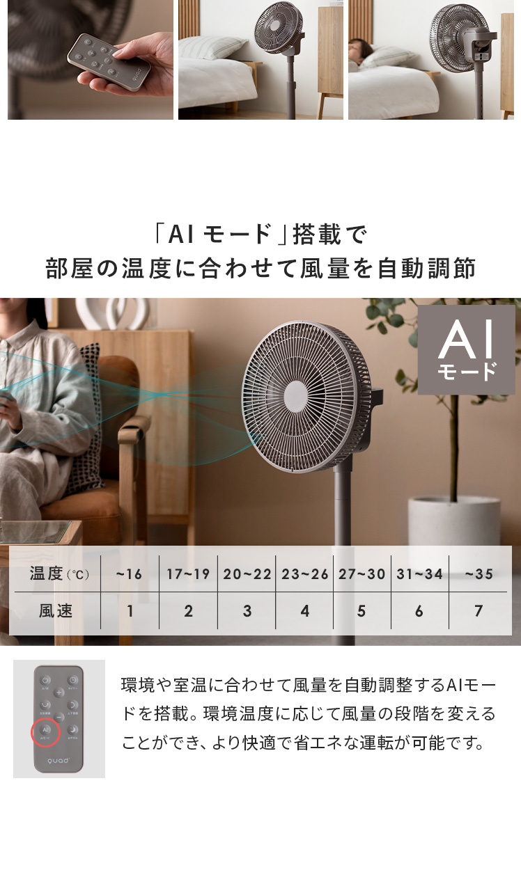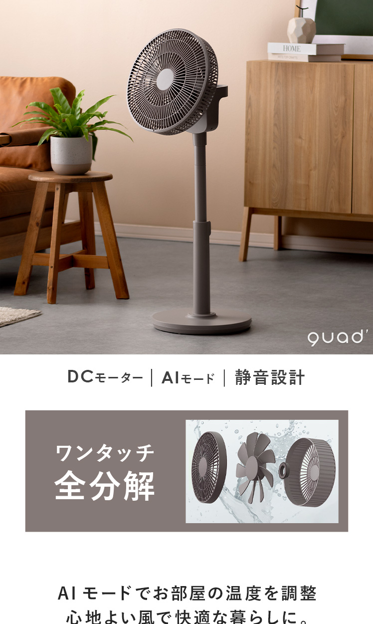 quad'〔クワッズ〕3D DCリビングサーキュレーターファン「スマートエアDC」/AIモードで室温に応じて風量を自動調整できる、機能性に優れたサーキュレーターファン。9枚の羽根と3Dスイングで空間全体にやさしい風を送ります。静音・省エネに優れたDCモーターを搭載し、分解してお手入れも簡単。毎日を心地よく快適に整えます。