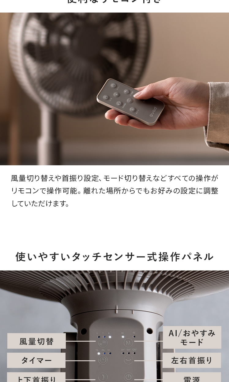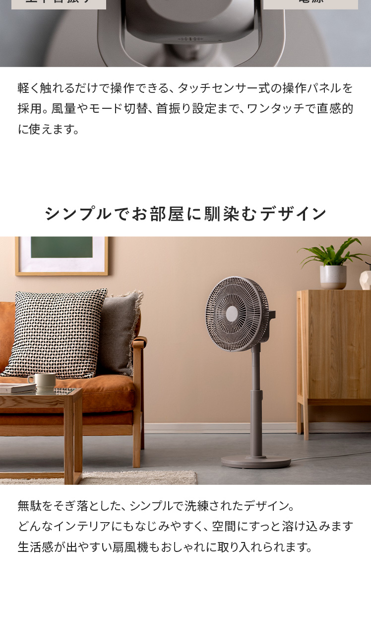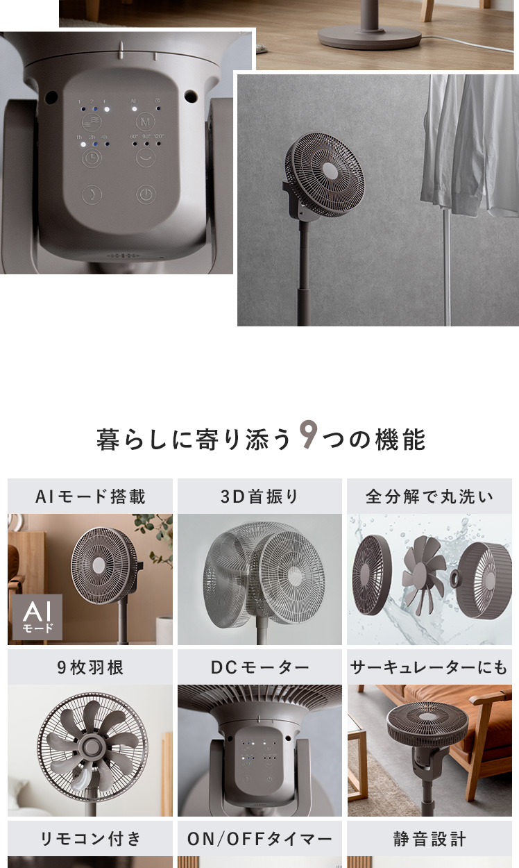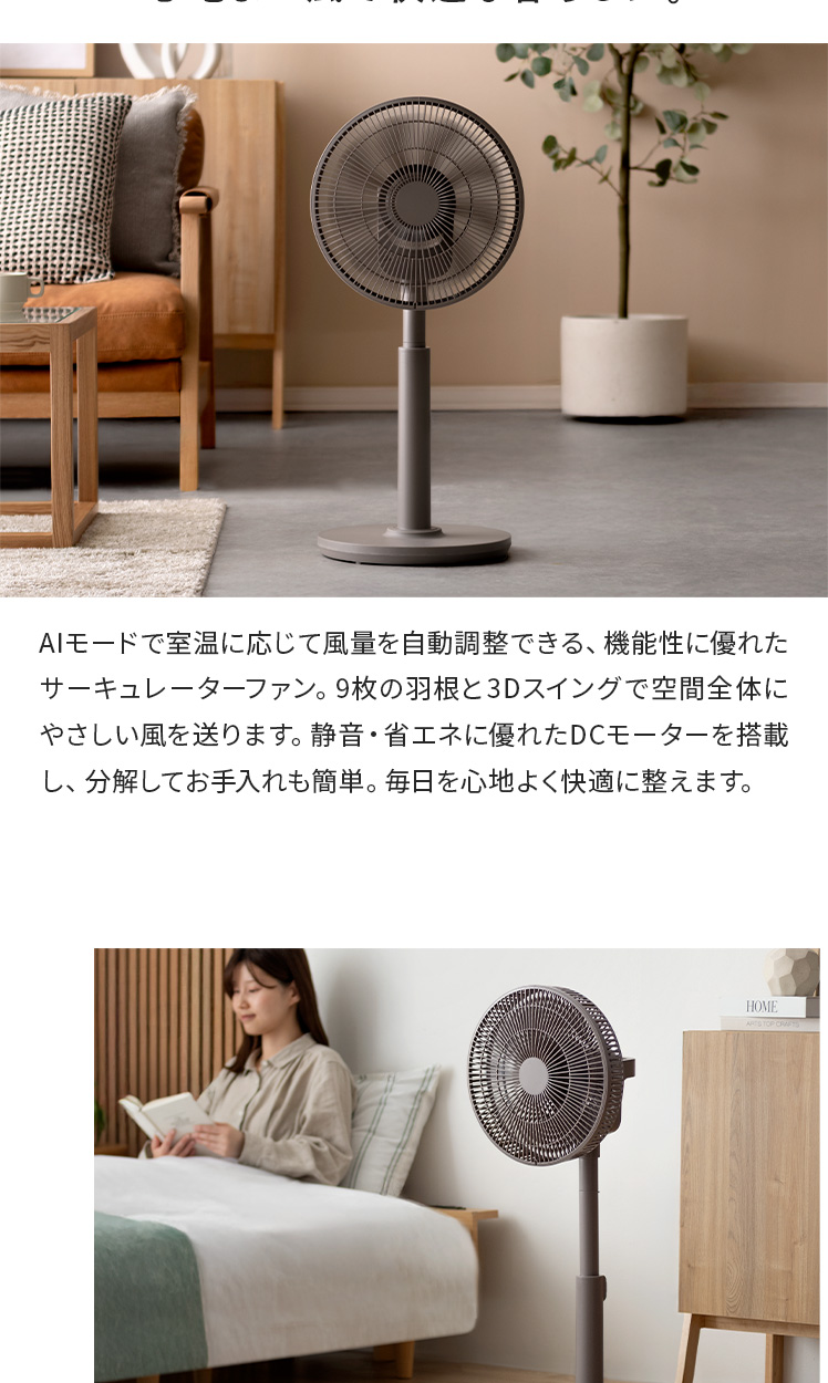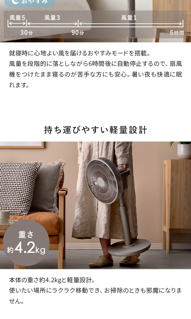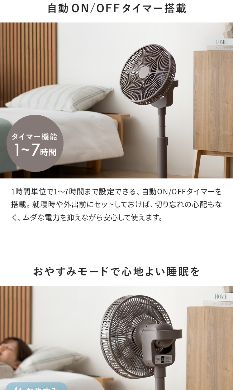 | 機能 | 自動首振り上下約70°、左右約120°、風量7段階調整、 AIモード、おやすみモード、ON/OFFタイマー機能(1〜7時間)、高さ6段階調整 |