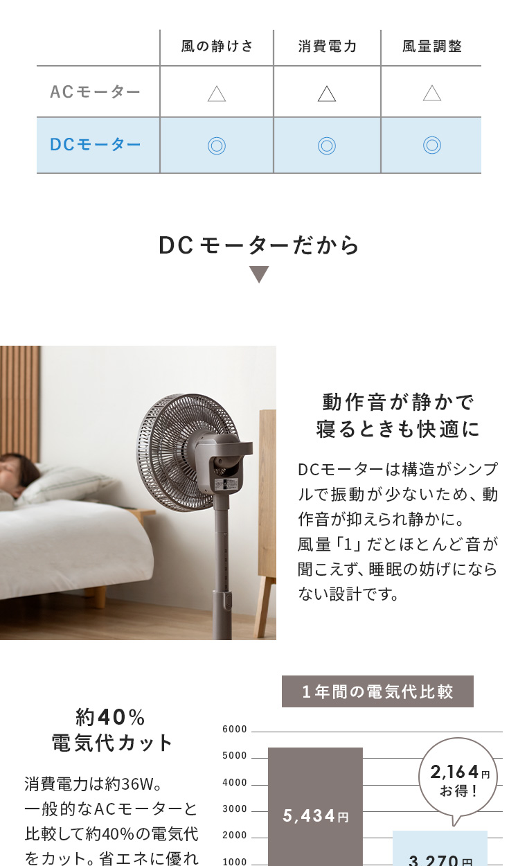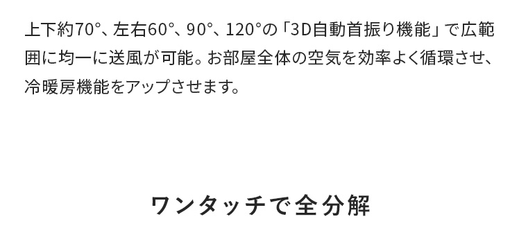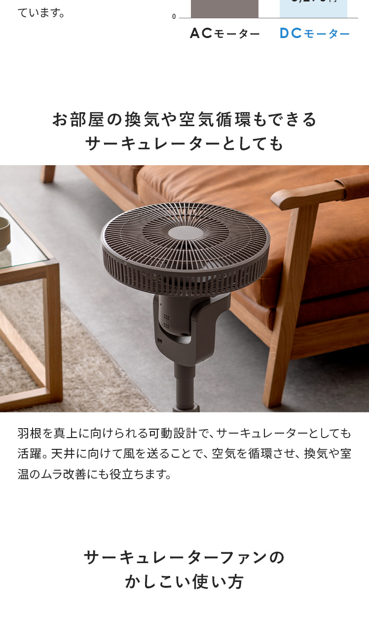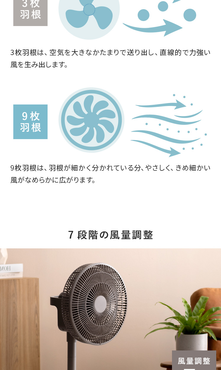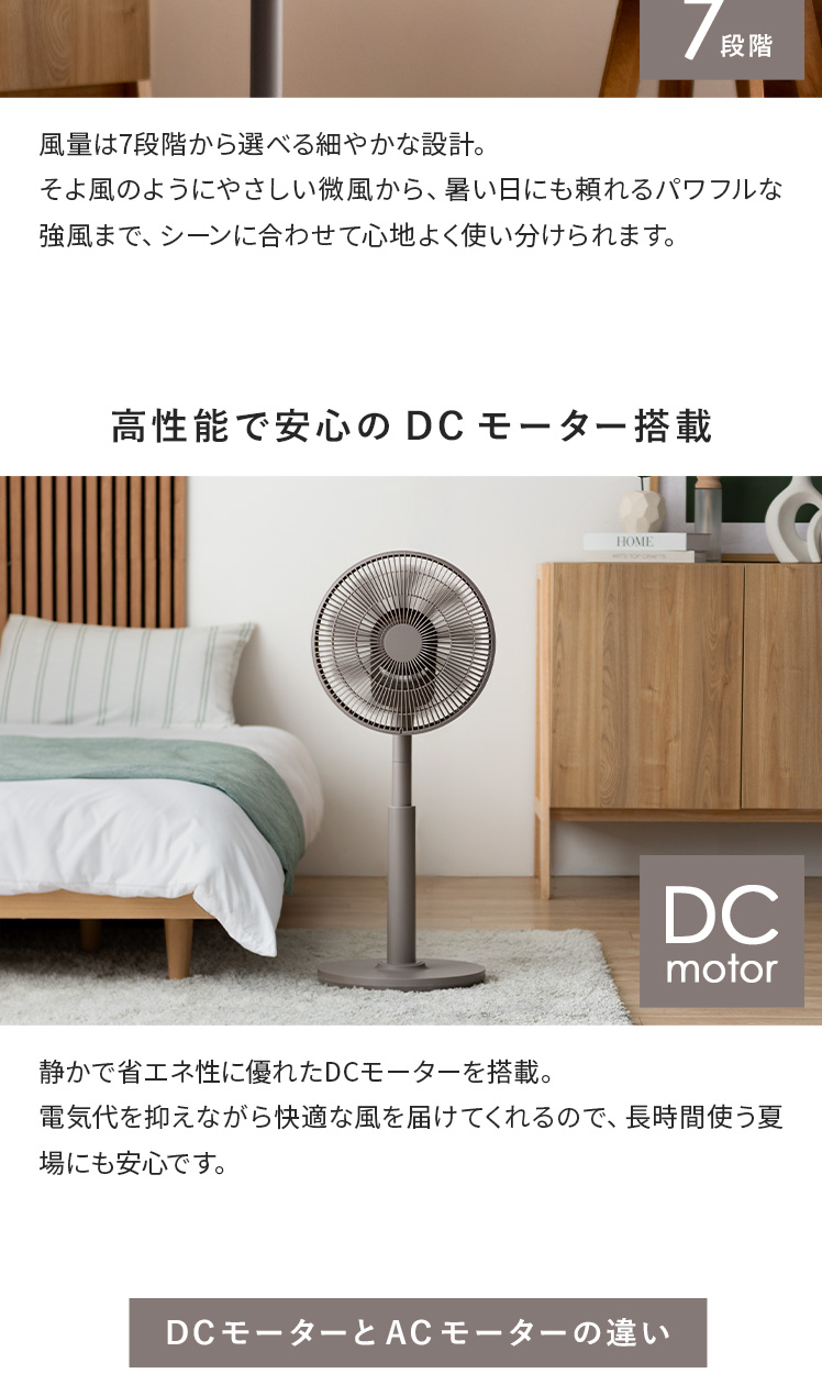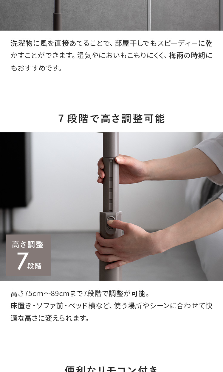| 機能 | 自動首振り上下約70°、左右約120°、風量7段階調整、 AIモード、おやすみモード、ON/OFFタイマー機能(1〜7時間)、高さ6段階調整 |